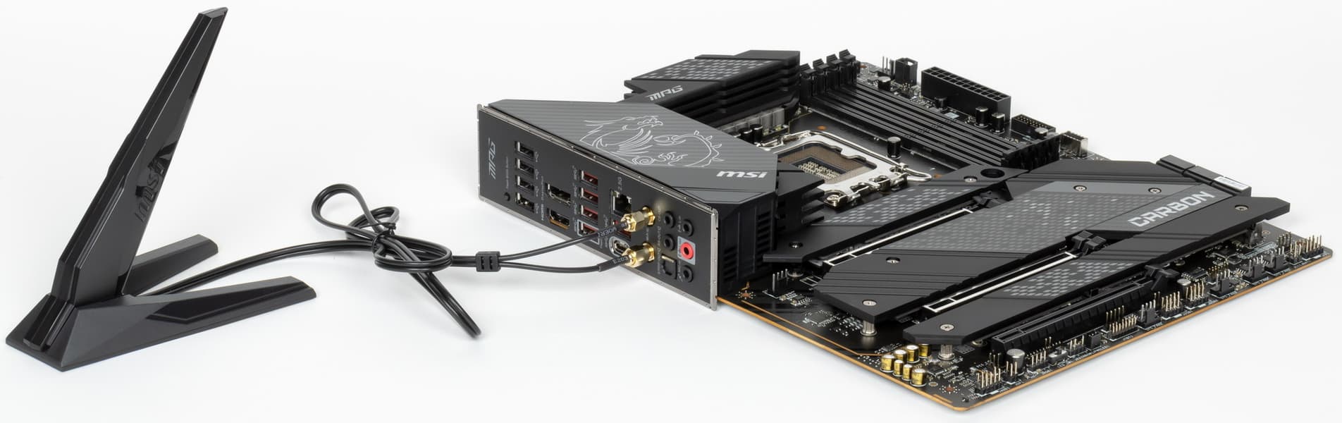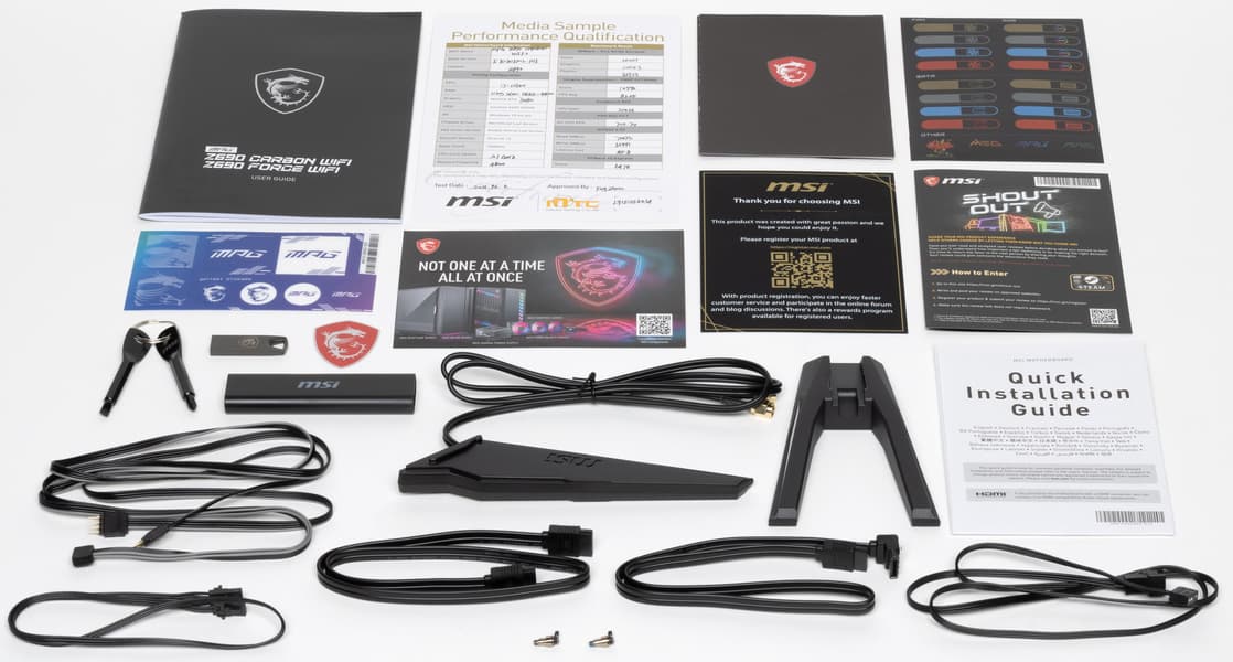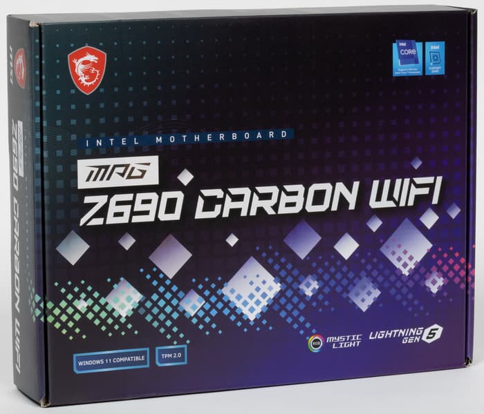 MSI MPG Z690 Carbon WiFi поставляется в стандартной коробке фирменного дизайна серии MPG. Комплект размещен под платой в отдельном отсеке (только лишь антенна беспроводной связи закреплена над материнкой).