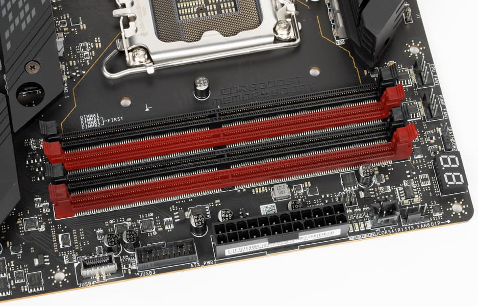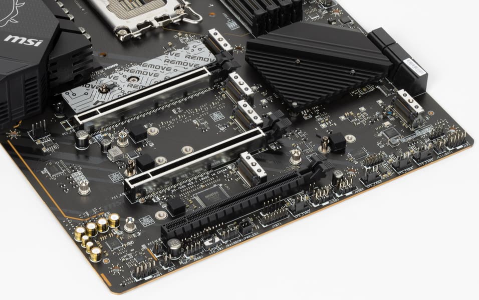 Для установки модулей памяти на плате MSI имеется четыре DIMM-слота (для работы памяти в Dual Channel в случае использования всего 2 модулей их следует устанавливать в А2 и B2. Плата поддерживает небуферизованную память DDR5 (non-EСС), а максимальный объем памяти составляет 128 ГБ. Разумеется, поддерживаются профили XMP.