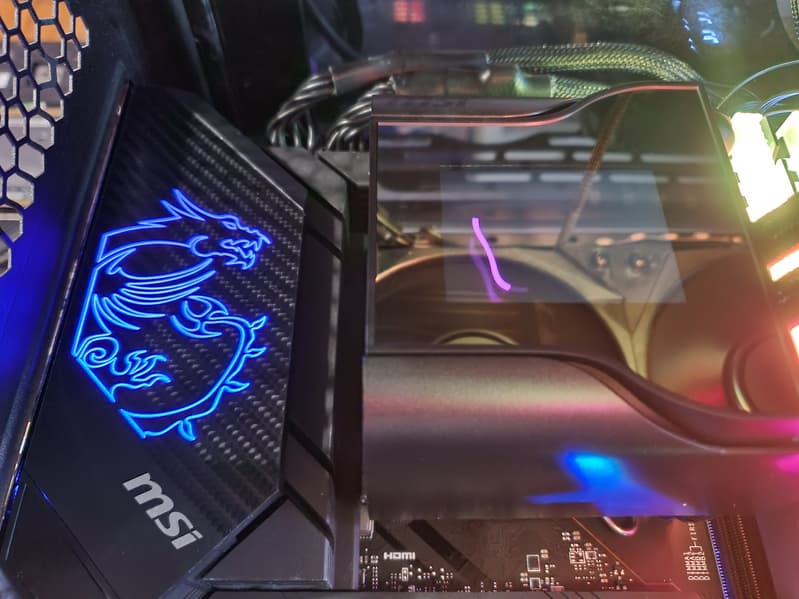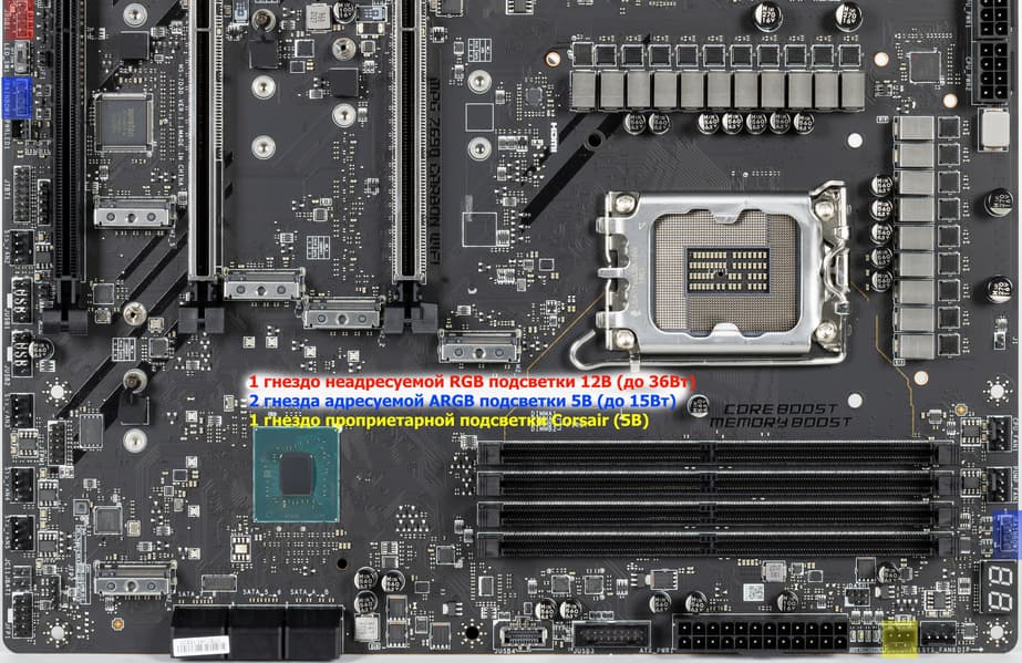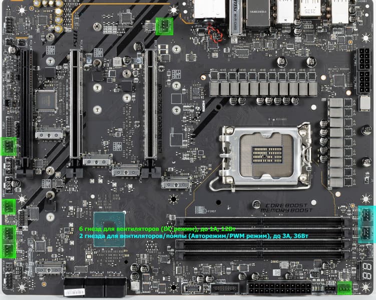 Еще у этой модели 6 портов SATA и 8 разъемов для вентиляторов. Несмотря на то что плата относится к серии MPG (а не к топовой серии MEG), система питания процессора у нее очень мощная, она способна обеспечить работу любых совместимых процессоров с запасом на разгон. Также мы видим очень грамотную систему охлаждения каждого потенциально греющегося элемента, включая накопители в слотах M.2. Сетевые возможности хорошие: быстрый проводной контроллер 2,5 Гбит/с, а также один самый современный беспроводной. В числе плюсов платы можно упомянуть неплохую подсветку, включая широкие возможности для подключения дополнительных RGB-устройств.