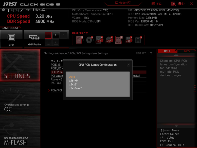 Теперь посмотрим выше на то, как работают процессоры в данной конфигурации. У CPU 12-го поколения всего 20 линий PCIe, 4 из них версии PCIe 4.0 отведены на порт М.2 (M2_1). Оставшиеся 16 линий PCIe 5.0 надо делить на два слота PCIe x16 (_1 и _2). Вариантов переключения несколько: