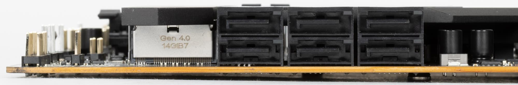 Всего у платы 6 разъемов Serial ATA 6 Гбит/с + 5 (пять!) слотов для накопителей в форм-факторе M.2. Порты SATA странно промаркированы, начиная с 5 ( 5, 6, 7, 8), 4 из них реализованы через чипсет Z690 и поддерживают создание RAID. При этом порт SATA 7 делит ресурсы с портом М.2_4.