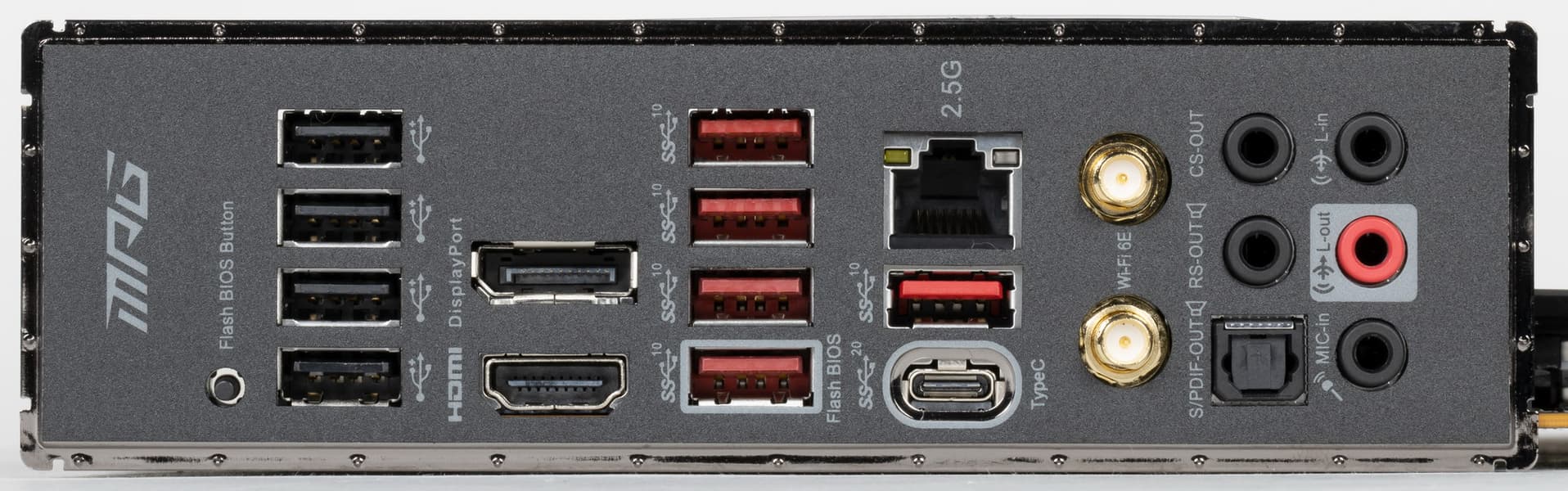 | Разъемы на задней панели | 1 × USB 3.2 Gen2 (Type-C) 5 × USB 3.2 Gen2 (Type-A) 4 × USB 2.0 (Type-A) 1 × RJ-45 5 аудиоразъемов типа миниджек 1 разъем S/PDIF 2 антенных разъема 1 разъем HDMI out 1 разъем Display Port out кнопка перепрошивки BIOS — Flash BIOS |
