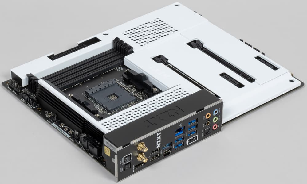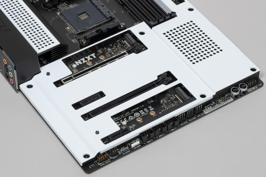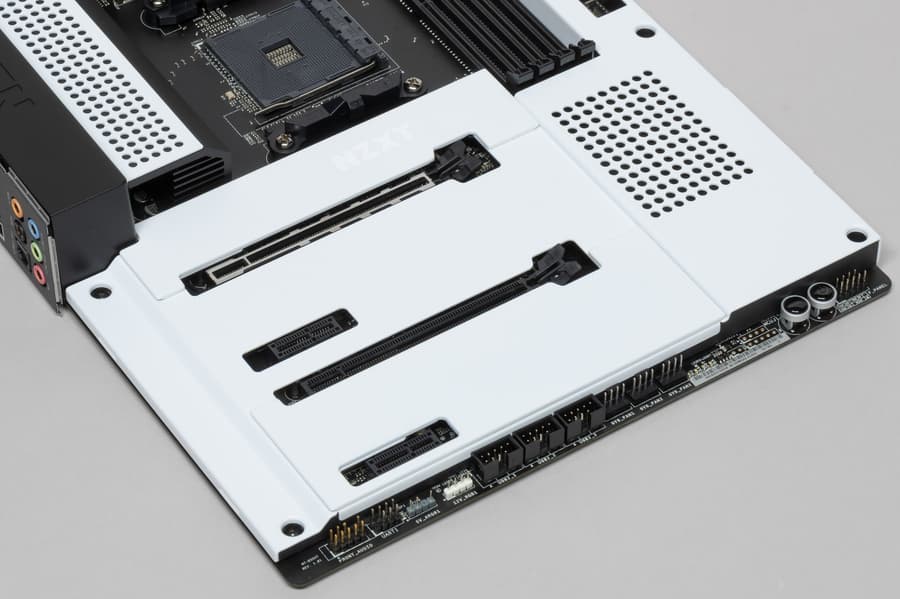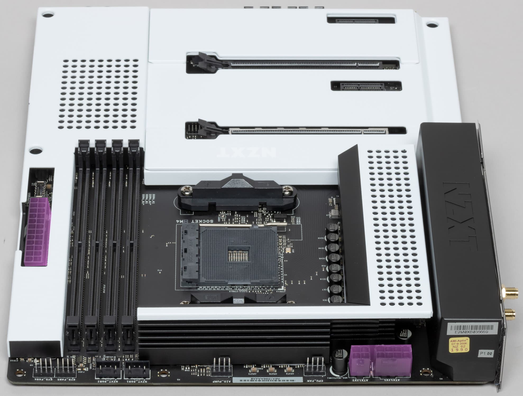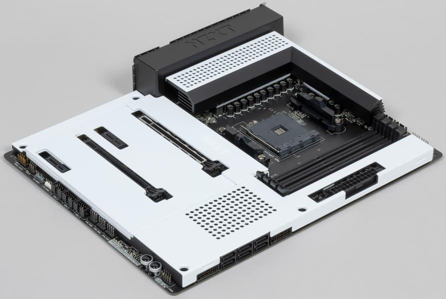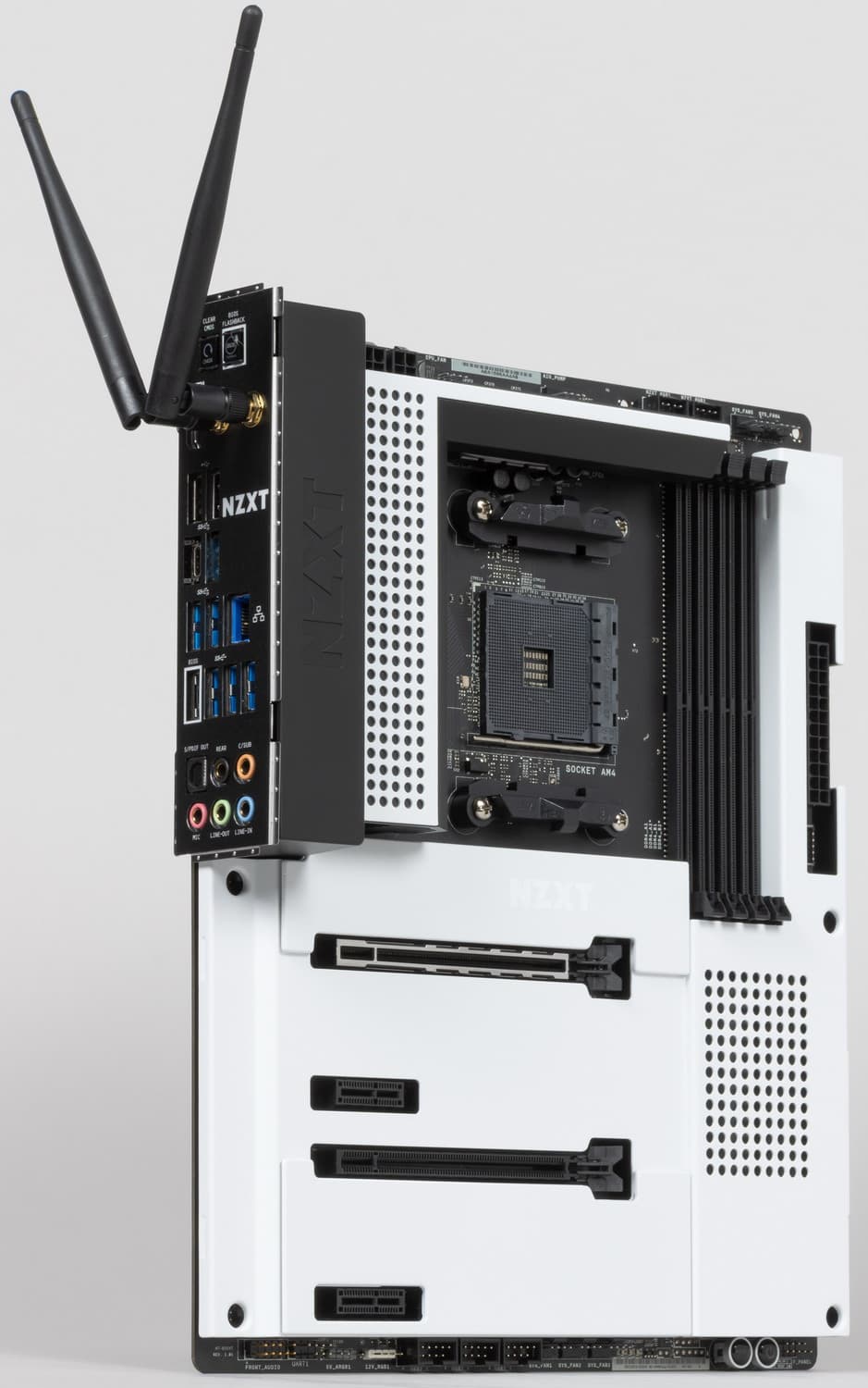 NZXT N7 B550 — очень оригинальная и стильная материнская плата на среднебюджетном чипсете. У нее добротная система питания, обеспечивающая стабильную работу даже таких флагманских процессоров, как Ryzen 9 5950X, в том числе с авторазгоном в рамках AMD PBO (но этот режим предполагает значительную перестраховку, поэтому для полноценного авторазгона лучше использовать программу AMD Ryzen Master).