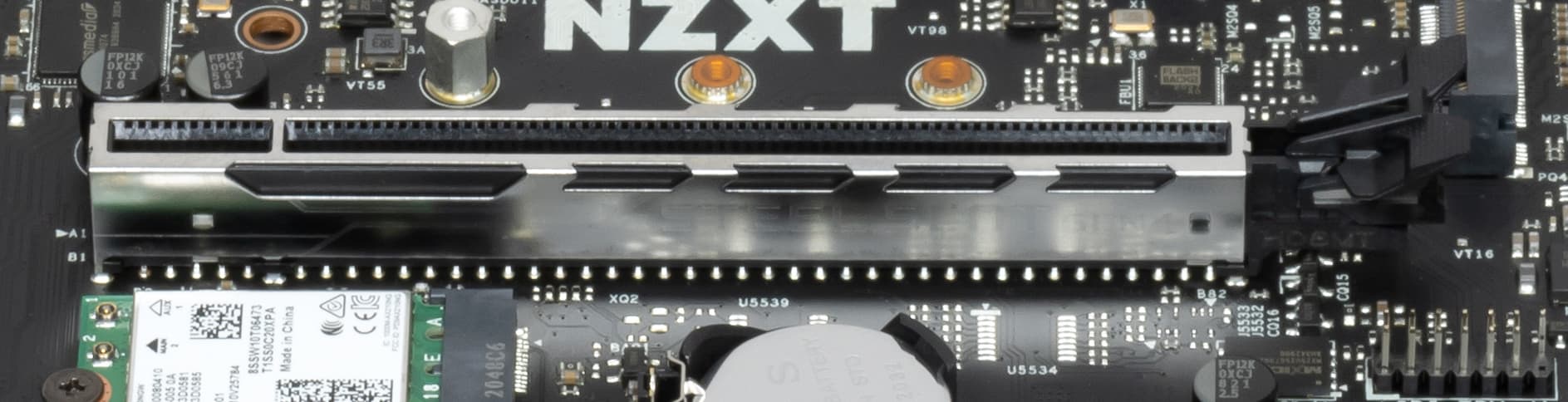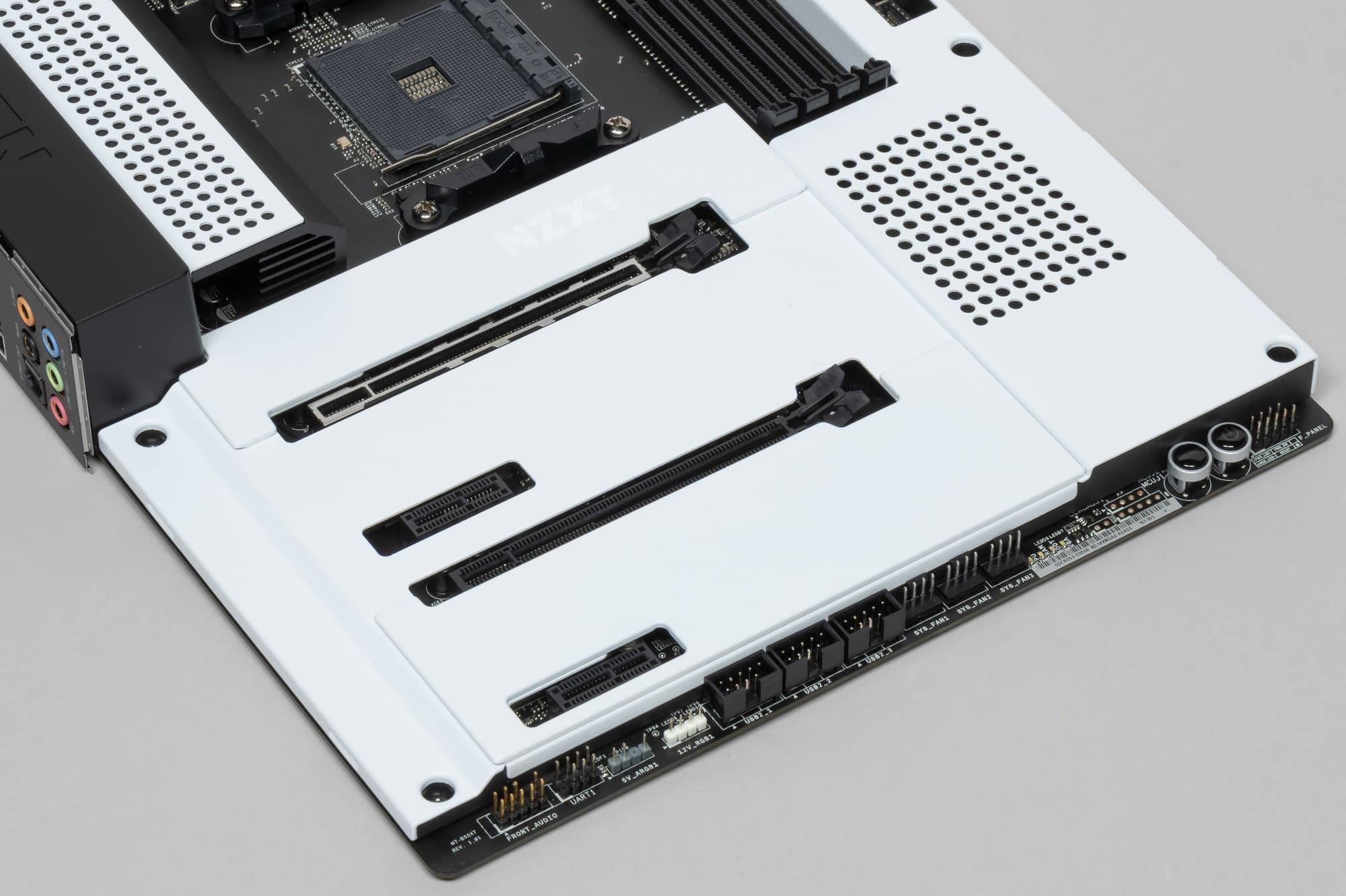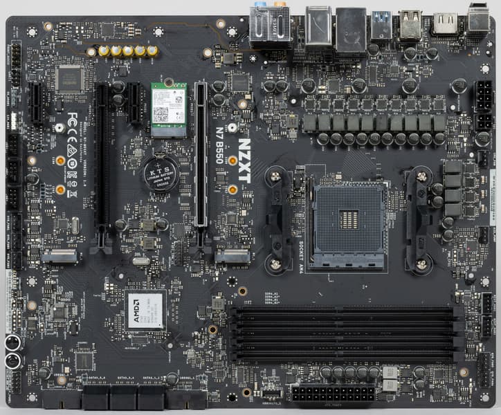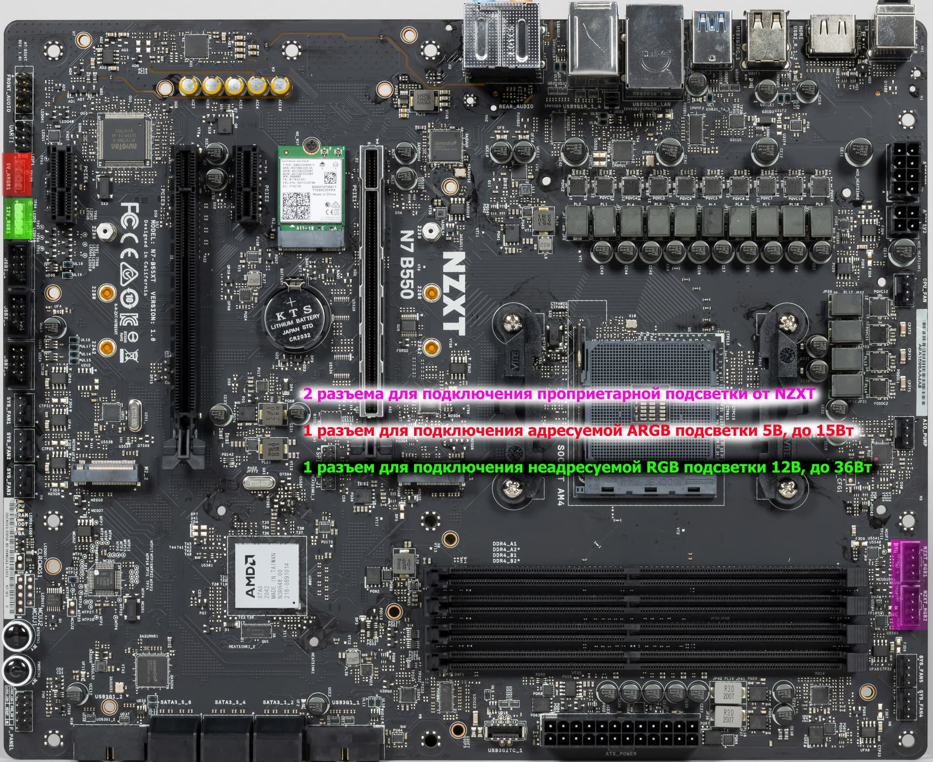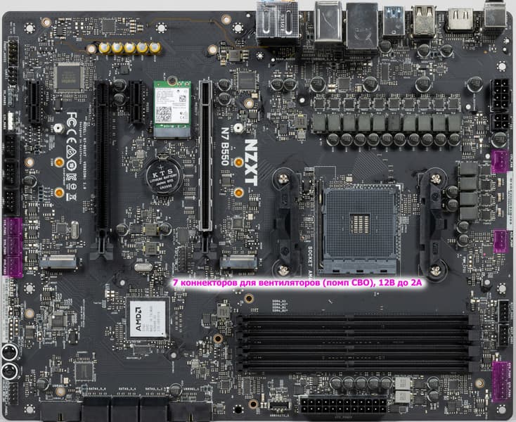 Функциональность у NZXT N7 B550 для своей ниши прекрасная. Плата имеет аж 21 (!) порт USB разных видов (включая 5 (пять!) USB 3.2 Gen2), 2 слота PCIe х16 (из которых первый получает 16 линий PCIe от процессора) с возможностью объединения видеокарт в AMD CrossFire, 2 слота PCIe x1 для карт расширения, 2 слота M.2, 6 портов SATA, 7 разъемов для подключения вентиляторов и помп. Есть как высокоскоростной проводной 2,5-гигабитный контроллер, так и современный беспроводной с поддержкой Wi-Fi 6 и Bluetooth 5.2. Можно подключать ARGB/RGB-устройства для управления подсветкой. Сама плата на радость определенной категории пользователей подсветки не имеет.