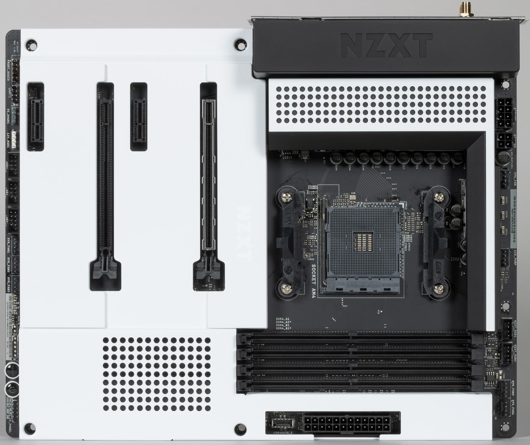 Форм-фактор ATX имеет размеры до 305×244 мм, а E-ATX — до 305×330 мм. Материнская плата NZXT N7 B550 имеет размеры 305×244 мм, поэтому выполнена в форм-факторе ATX, и на ней имеются 10 монтажных отверстий для установки в корпус, однако реально можно использовать — 9 (10е скрыто декоративным «панцирем»).