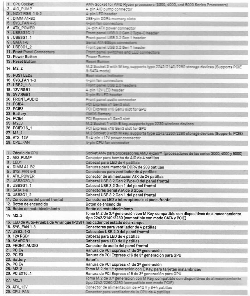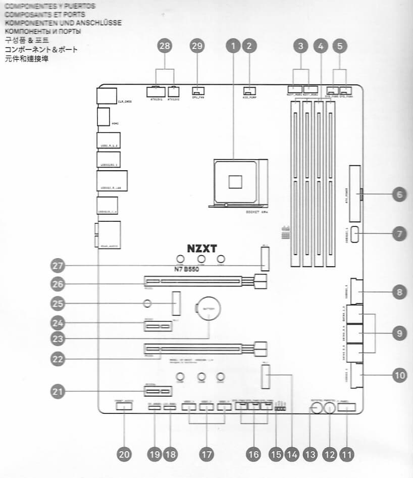 | Прочие внутренние элементы | 24-контактный разъем питания ATX 1 8-контактный разъем питания EPS12V 1 4-контактный разъем питания EPS12V 1 слот M.2 (E-key) c адаптером беспроводных сетей 2 разъема для подключения 4 портов USB 3.2 Gen1 3 разъема для подключения 6 портов USB 2.0 7 разъемов для подключения 4-контактных вентиляторов и помп ЖСО 1 разъем для подключения неадресуемой RGB-ленты 1 разъем для подключения адресуемой ARGB-ленты 2 разъема для подключения подсветки от NZXT 1 разъем аудио для передней панели корпуса 2 разъема для подключения управления с передней панели корпуса |