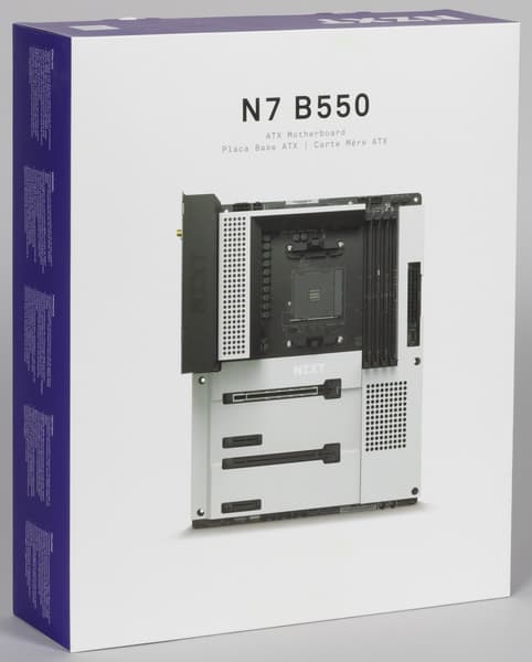 NZXT N7 B550 поставляется в обычной картонной коробке, которая в свою очередь упакована в фирменный супер. Внутри коробки есть традиционные отсеки: для самой материнской платы, и остального комплекта.