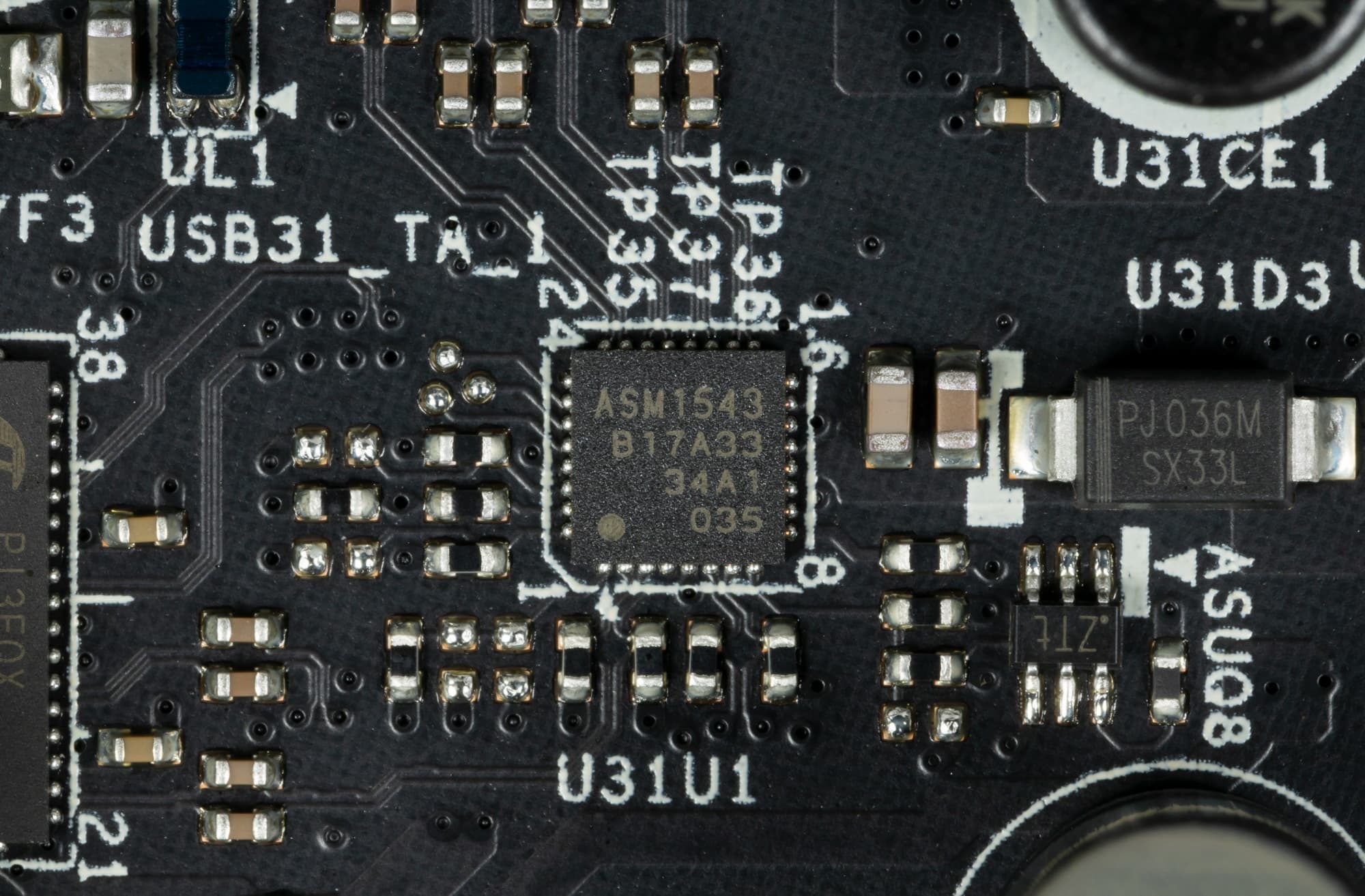 А для нужд быстрой зарядки порт Type-C на задней панели и аналогичный внутренний порт для вывода на переднюю панель имеют редрайверы от ASMedia ASM1543.