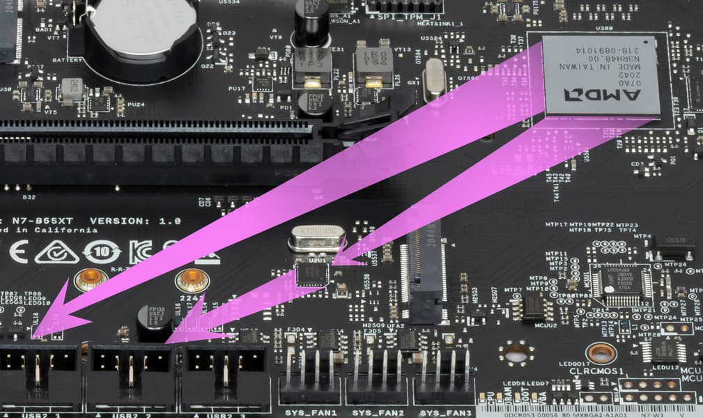 Контроллеры Genesys Logic GL852G (4 USB 2.0 на 2х внутренних разъемах), два ASMedia ASM1074 (6 USB 3.2 Gen1) используют линии портов USB. Подробнее в разделе по USB-портам.