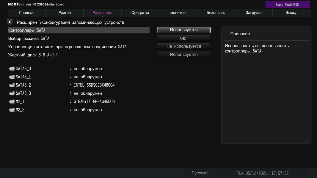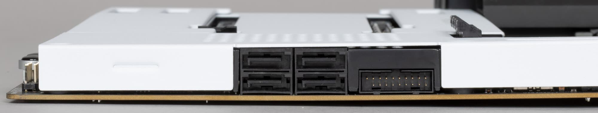 Всего у платы 4 разъема Serial ATA 6 Гбит/с + 2 слота для накопителей в форм-факторе M.2. Еще один слот M.2 предназначен для контроллеров беспроводных сетей Wi-Fi/Bluetooth. Все порты SATA реализованы через чипсет Z590 и поддерживают создание RAID.
