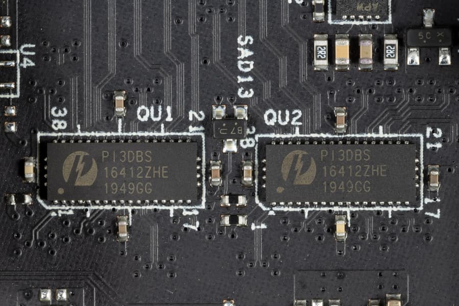 У данной платы перераспределения линий PCIe между слотами в случае использования более одной видеокарты нет,. Однако есть нужда в переключении слота М2_1 в зависимости от поколения вставленного в матплату процессора, поэтому имеются мультиплексоры.