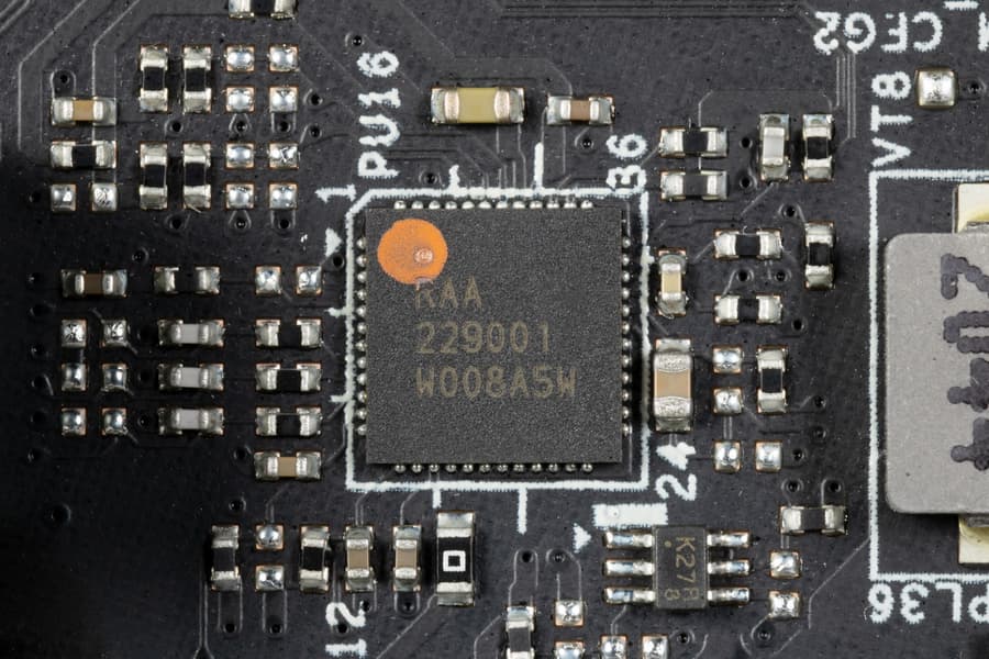 Для управления 12 фазами питания VCore используется ШИМ-контроллер RT3609BE от Richtek, и он работает с фазами по-парно (то есть по сути управляет 6-ю фазами). Он уже управляет и двумя фазами питания VCCSA.