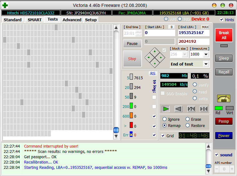 В случае неудачи чтения как с remap, так и с Advanced remap, стоит попробовать запустить последовательную запись в тех же Victoria или MHDD. Учитывайте, что операция записи стирает данные, поэтому перед её применением обязательно делайте бэкап!