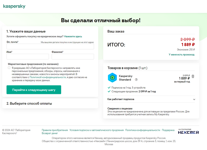 Классическая версия ПО доступна на сайте производителя kaspersky.ru. На момент подготовки настоящего обзора цена годовой подписки составляет 1889 рублей (с учетом специальной скидки 210 рублей). Причем нас сразу предупреждают, что через год возобновление произойдет уже по полной стоимости, 2099 рублей.