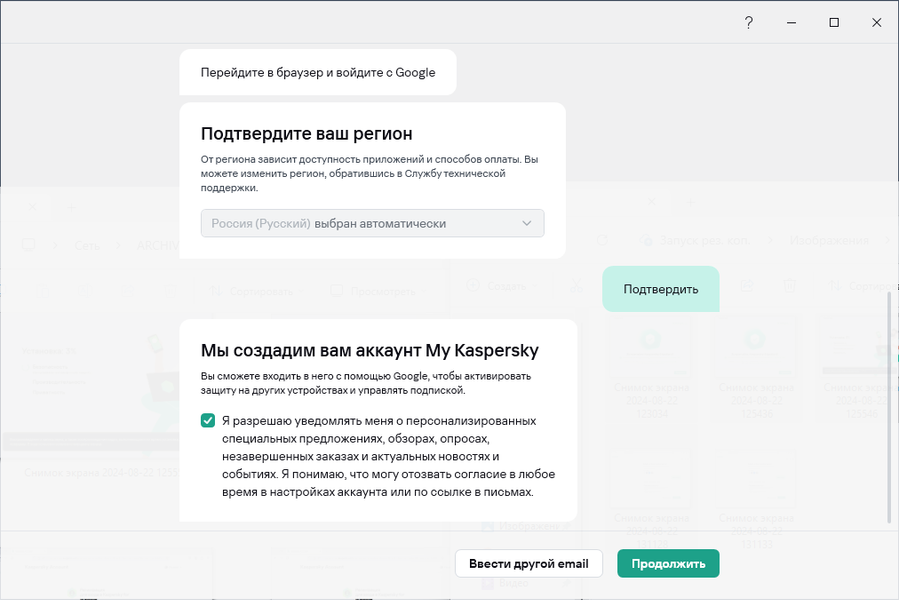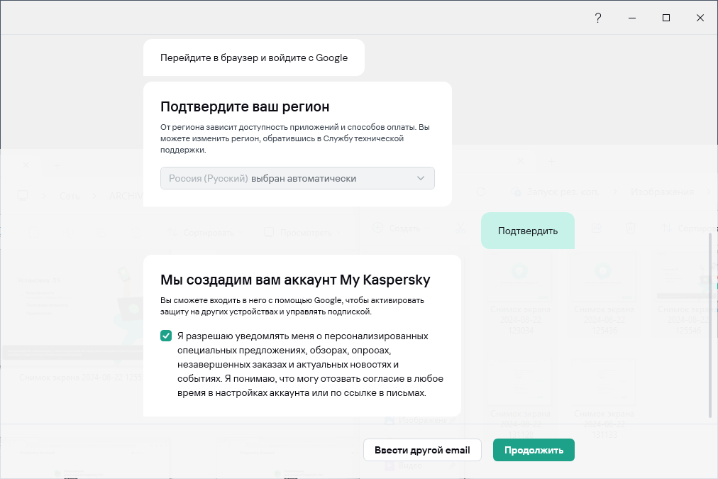 По окончании установки приложение предлагает пользователю войти в его аккаунт Kaspersky. Если рассчитывать на использование продуктов Kaspersky более широко, чем просто для тестирования, аккаунт разумно завести.