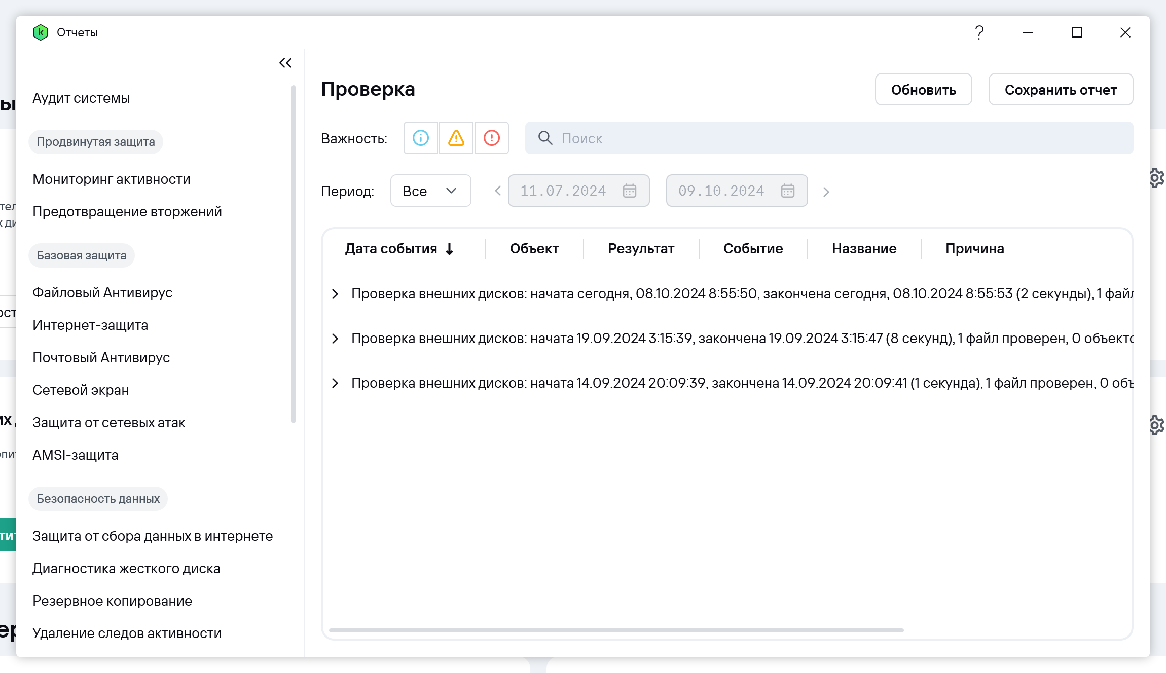 В приложении имеется подраздел Аудит, где можно справиться о том, что происходит и происходило в связи с работой Kaspersky Standard.