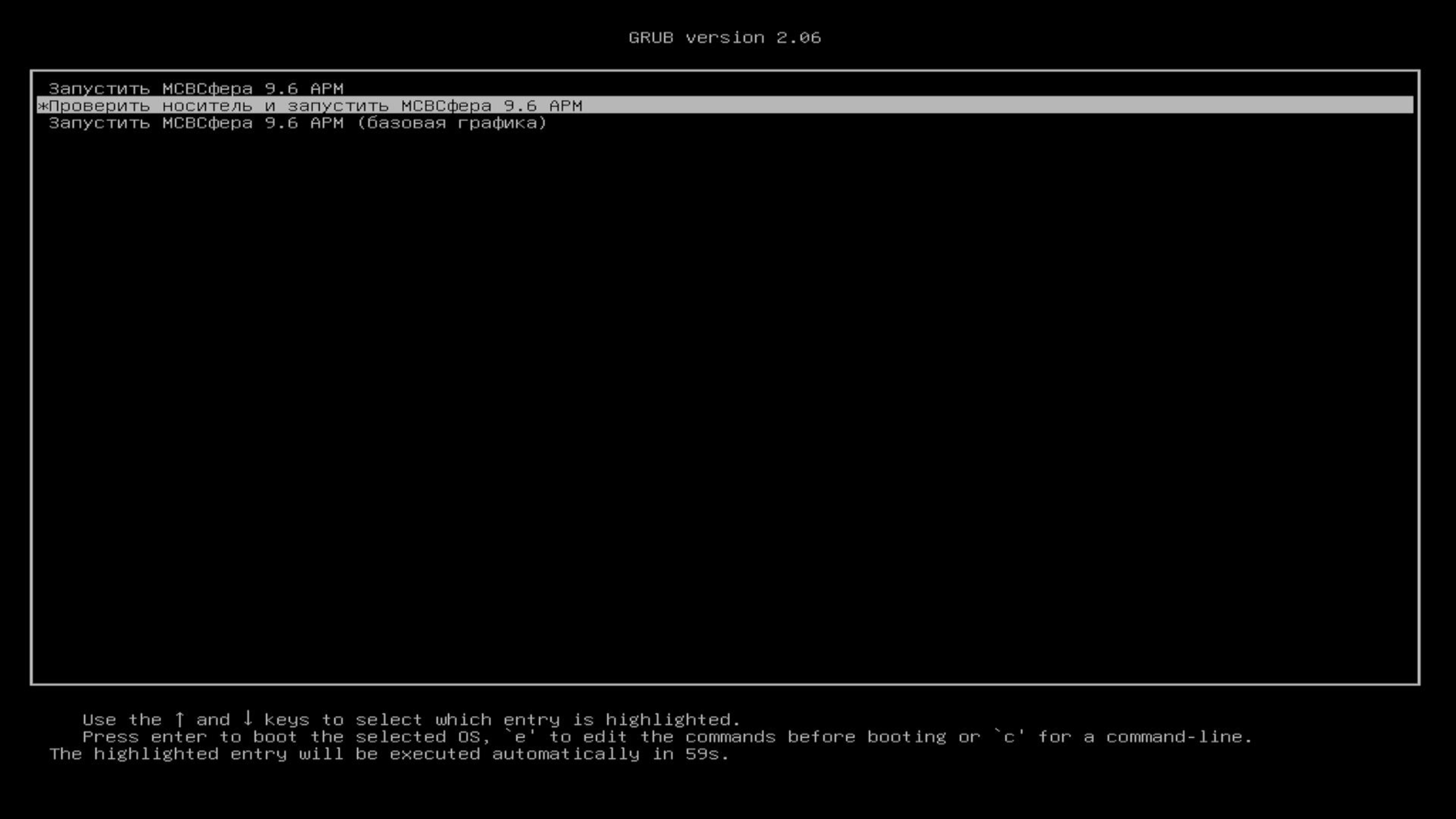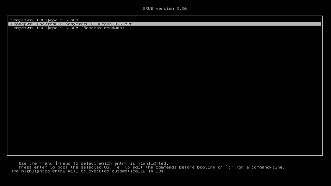 После традиционной стадии с листингом начальных действий попадаем в меню загрузчика GRUB (GNU GRand Unified Bootloader). Выбираем первую опцию (загрузка ОС «МСВСфера» без проверки состояния носителя).