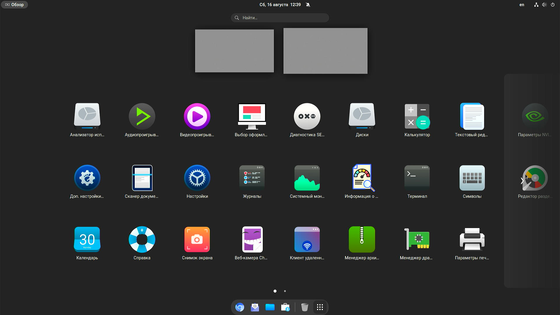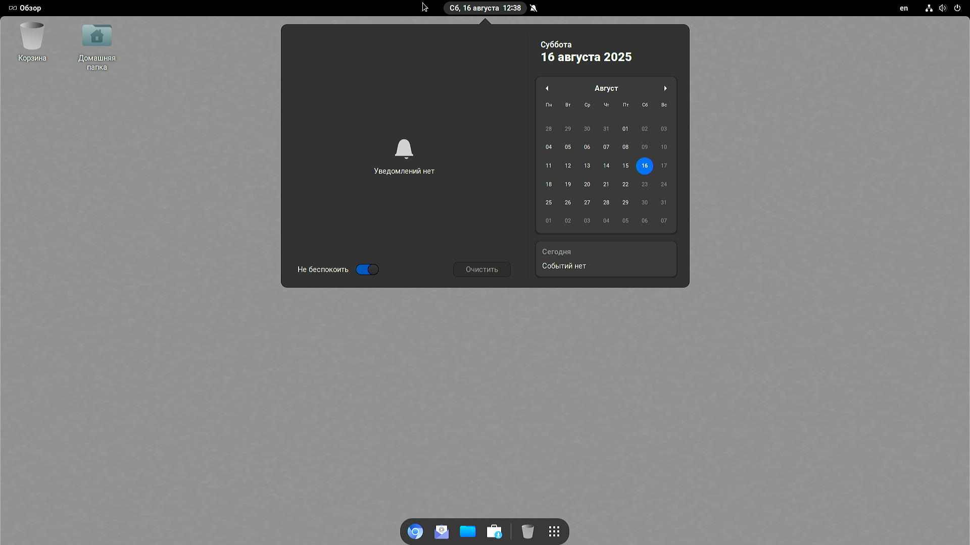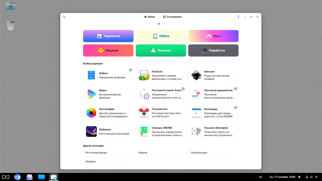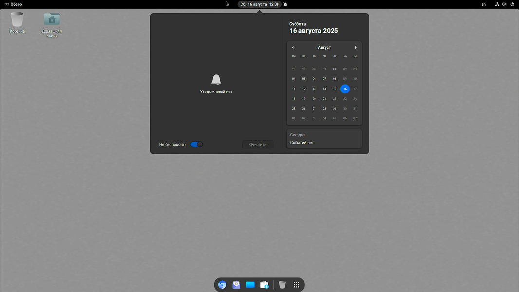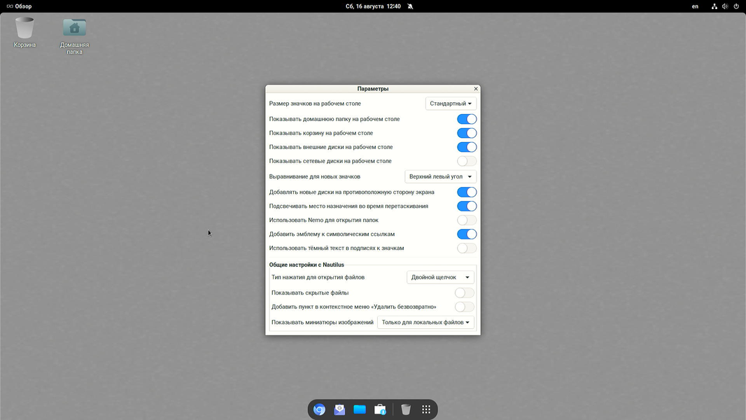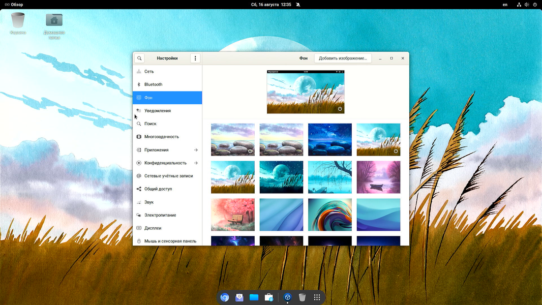 - Gnome Shell с доком и панелью сверху.