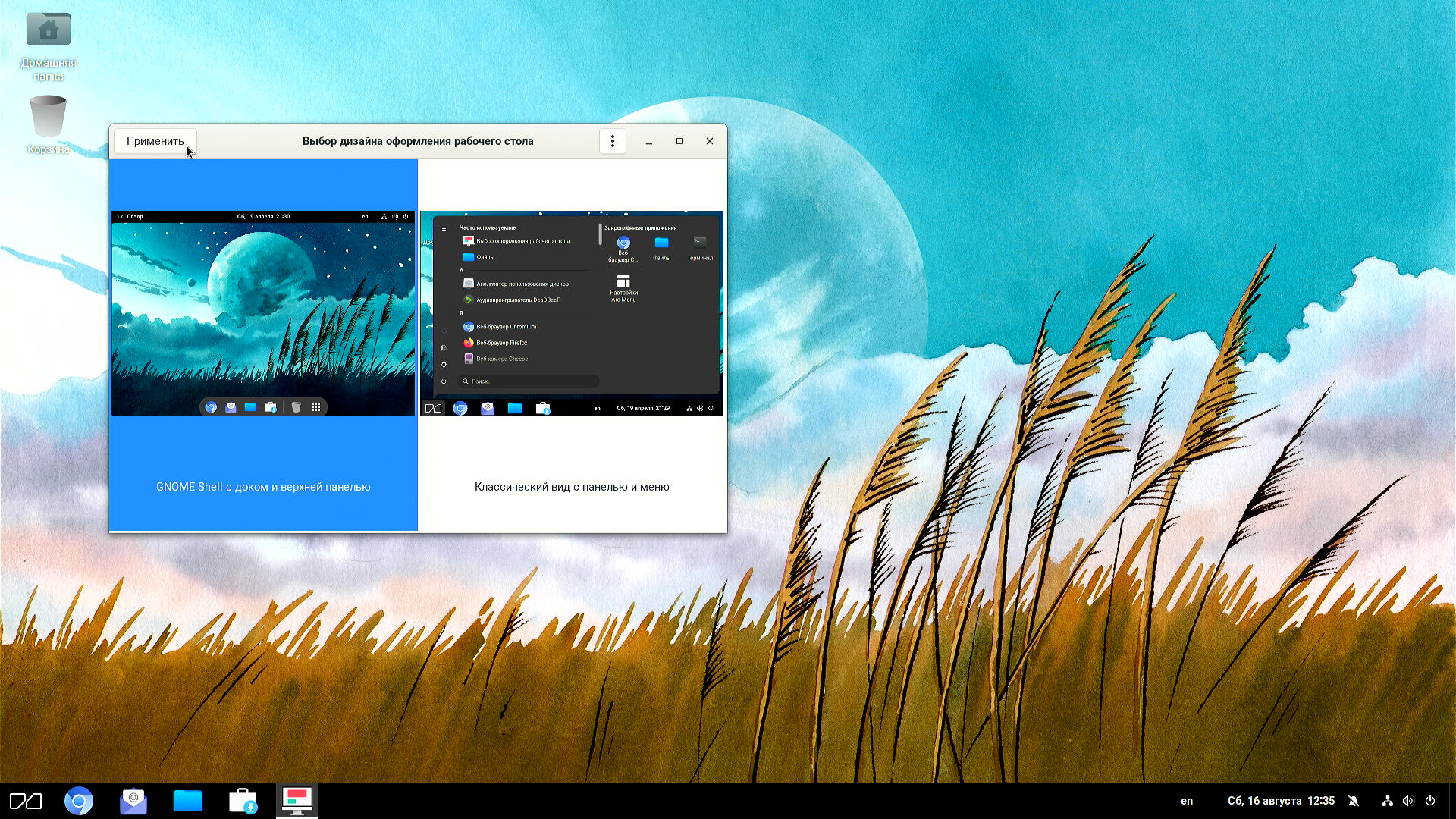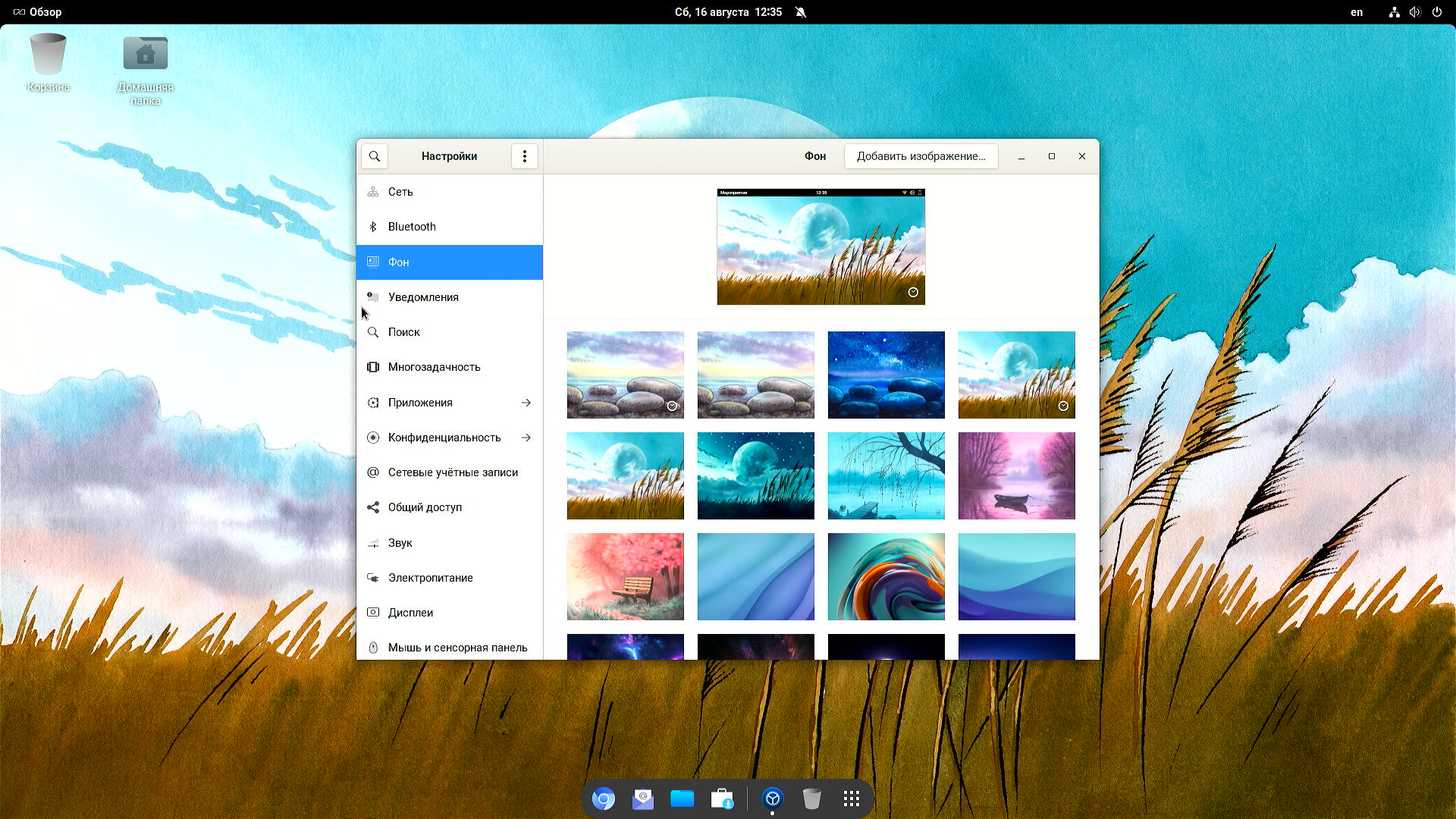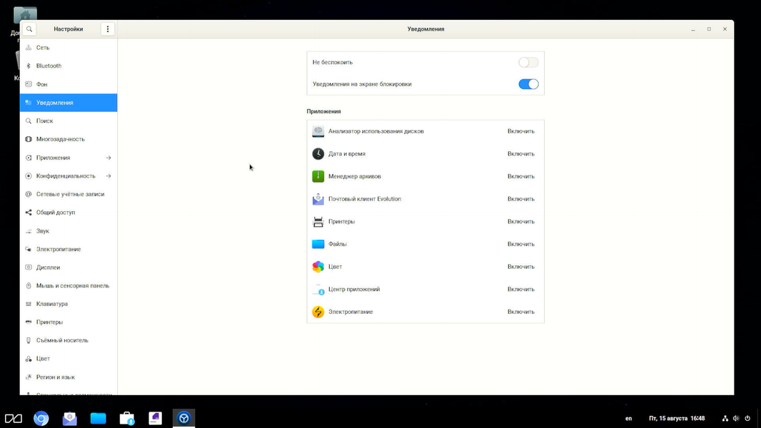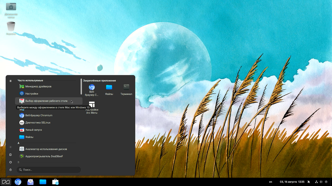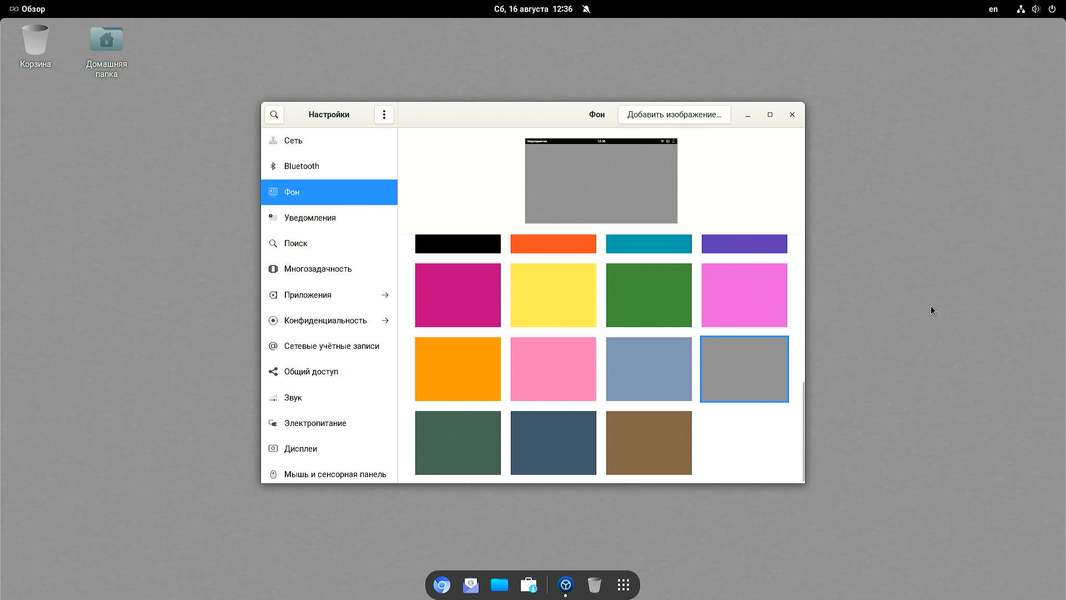 - Gnome Shell с доком и панелью сверху.