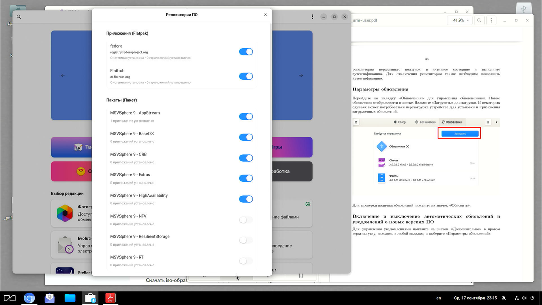 «МСВСфера» 9.6 использует систему управления пакетами DNF, совместимую с репозиториями RHEL и CentOS. Это обеспечивает доступ к широкому спектру приложений: