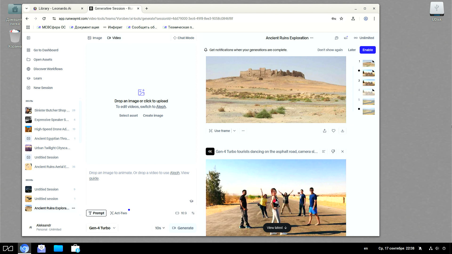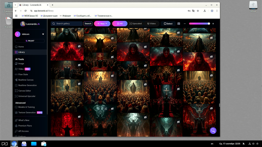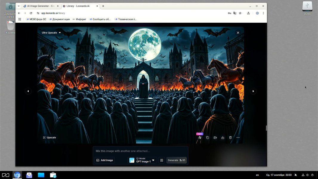 Мы нарочно набросали сюда несколько скриншотов с разными этапами работ по созданию медиаконтента средствами ИИ, так как выше мимоходом указали, что этот вид креативной деятельности (средствами веб-браузера) уравнивает удобство пользования и функциональность Linux и Windows/Mac.