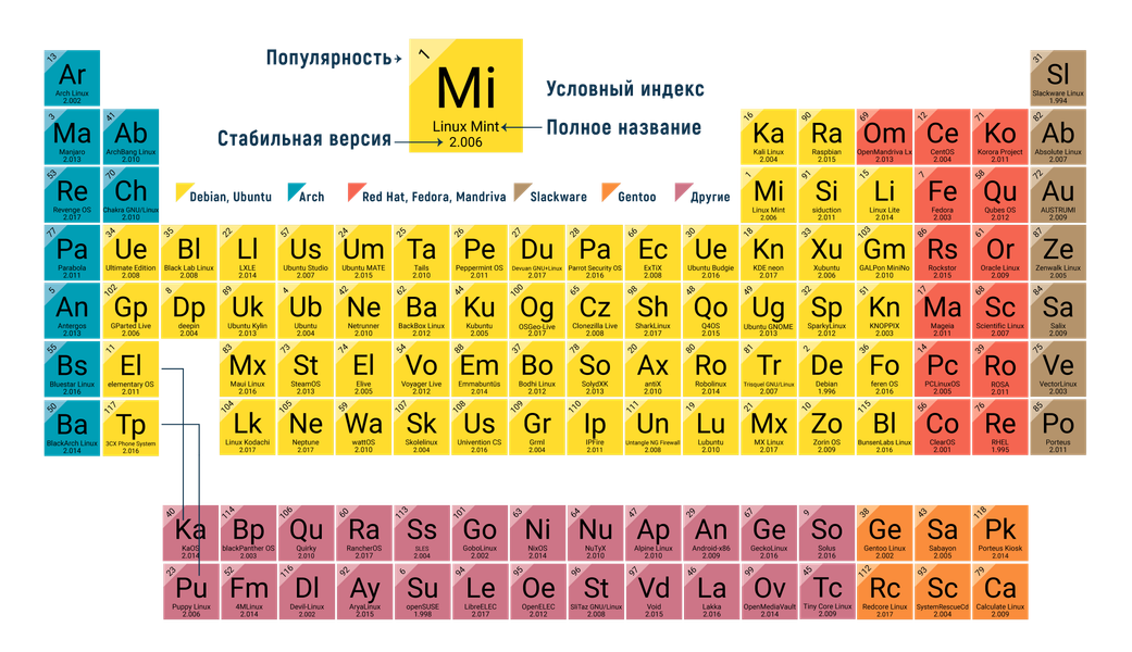 Поскольку Linux, в основном, живет без планирования и развивается без серьезного финансирования, для него нет не только специальных стандартов, но даже каких-либо внутренних соглашений. А эволюционное древо выглядит настолько ветвистым и запутанным, что нам даже не хочется приводить его в обзоре. Мы позаимствовали у сообщества таблицу версий Linux, имитирующую периодическую систему элементов Дмитрия Менделеева. Разумеется, в ней нет главного: изменения свойств в зависимости от положения (в оригинале — от степени заполнения внешних электронных оболочек). Вместо атомных номеров в верхних левых углах квадратов представлена популярность (числа переходов на веб-страницы с соответствующими дистрибутивами), но и здесь не видно главного — непрерывного роста. Впрочем, наглядность искупает отсутствие логики. Приводим таблицу с минимальным переводом.