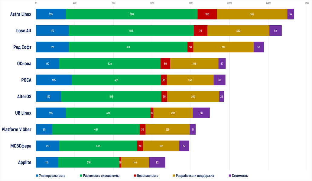 Постараемся определить место «МСВСфера» среди других версий отечественных Linux. В начале июля CNewsMarket опубликовал рейтинг российских ОС. Поскольку никто не в состоянии оценить рыночную долю подобных продуктов, то есть наиболее достоверный критерий их популярности, специалистам пришлось воспользоваться косвенными оценками, критерии которых можно найти в первоисточнике. Мы публикуем пересобранную диаграмму с использованием данных CNewsMarket. Чем больше баллов — тем выше место.