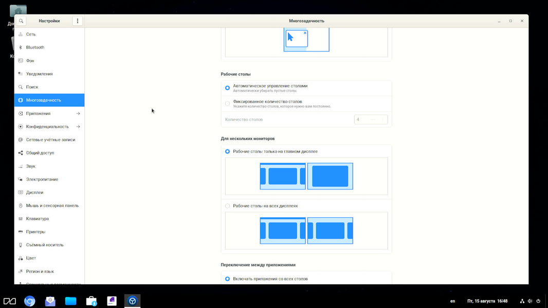 Многозадачность обеспечивается не только одновременной работой приложений в нескольких окнах, но и поддержкой разных «сред обитания» (рабочих столов).
