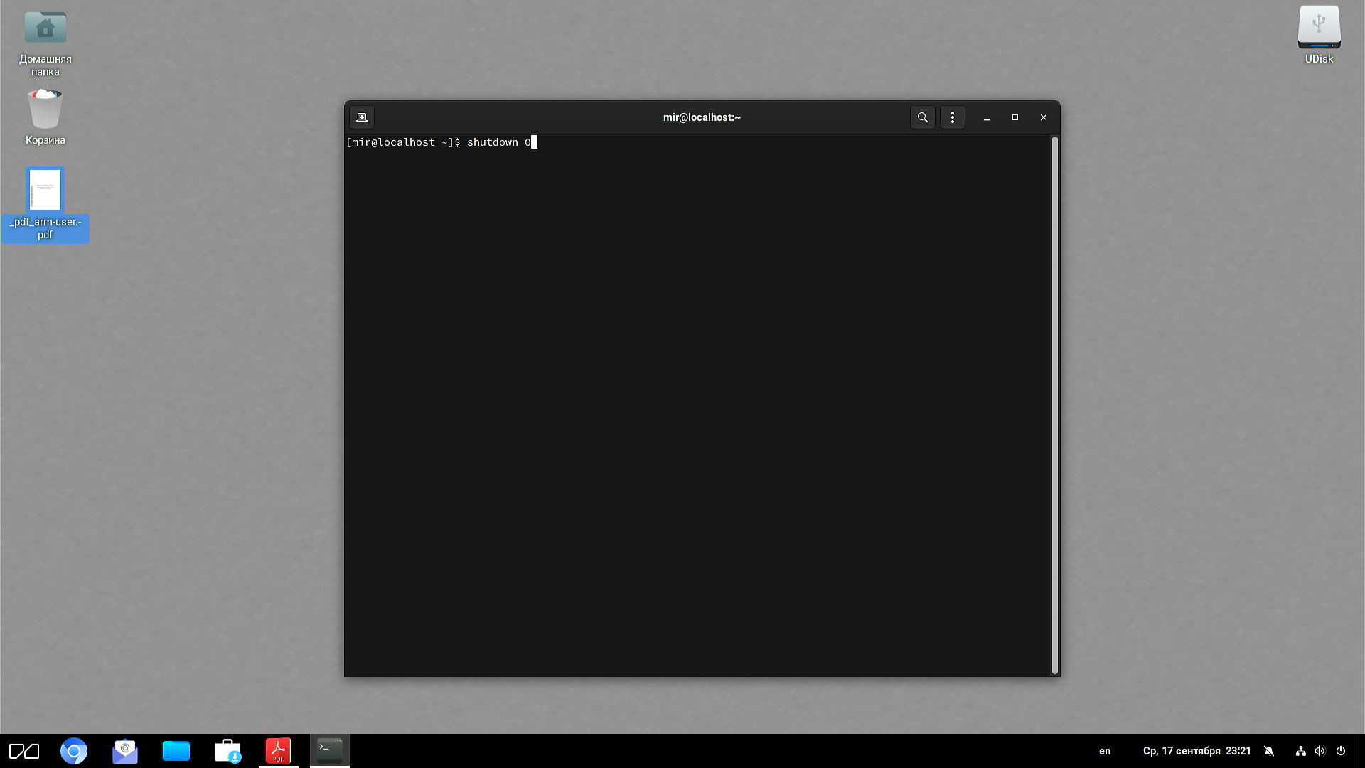 По умолчанию (на кнопке в пусковике) это означает ожидание в течение полуминуты. Но мы ждать не станем; воспользуемся терминалом и введем Shutdown 0 (немедленное завершение).