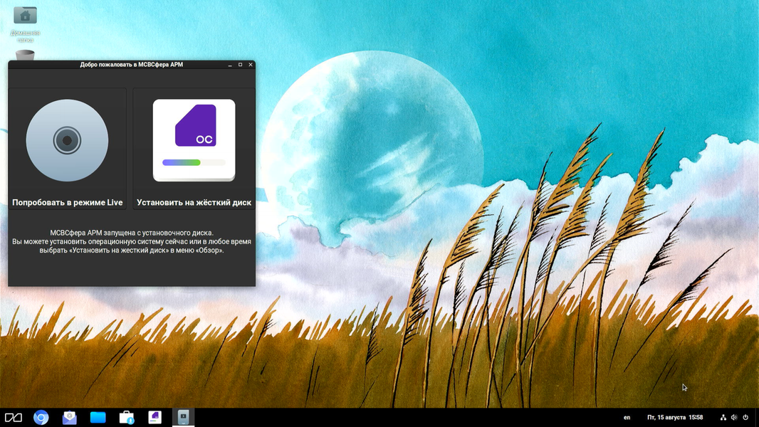 Через несколько секунд на экране нарисуется рабочий стол. На нем следует выбрать один из двух вариантов пользования ОС: с запуском с загрузочной флешки (это, конечно, медленно и нервирует) или с установкой на «нормальный» накопитель (в нашем случае — SATA SSD).