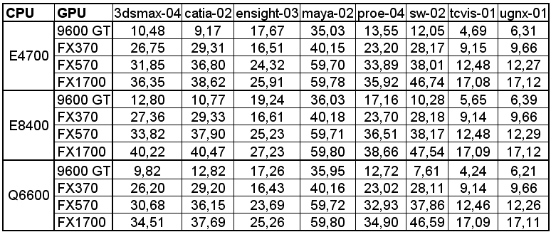 Снова FX 570 уверенно отрывается от FX 370, а вот стимулов присматриваться к более дорогому FX 1700 в очередной раз не обнаруживается. В Maya и EnSight неплохо чувствует себя и GeForce 9600 GT, лишь немного уступая FX 370 в последнем тесте. Различия между центральными процессорами можно было бы и не комментировать, если в предыдущих случаях, еще что-то просматривалось, то здесь и вовсе разница укладывается в погрешность измерения.