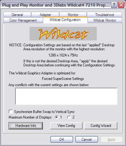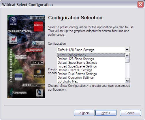 Как видно, драйвера Wildcat 4 7210 позволяют выбрать оптимизацию под конкретное приложение, коих в списке довольно много, а также принудительно форсировать тот или иной режим работы карты.