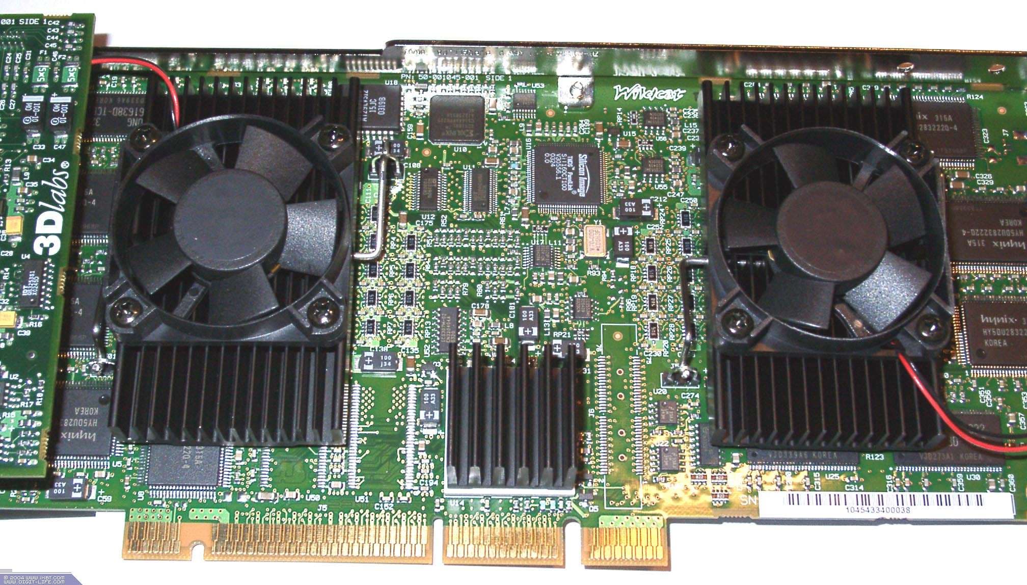 | Карта оборудована слотом AGP Pro 8x и 384 Мб памяти DDR (128 Мб фреймовый буфер плюс 256 Мб текстурный буфер). Микросхемы памяти Hynix (маркировка HYDU283222Q-4). Микросхемы памяти Samsung (маркировка K4H561638D-TCB3). | ![]() |