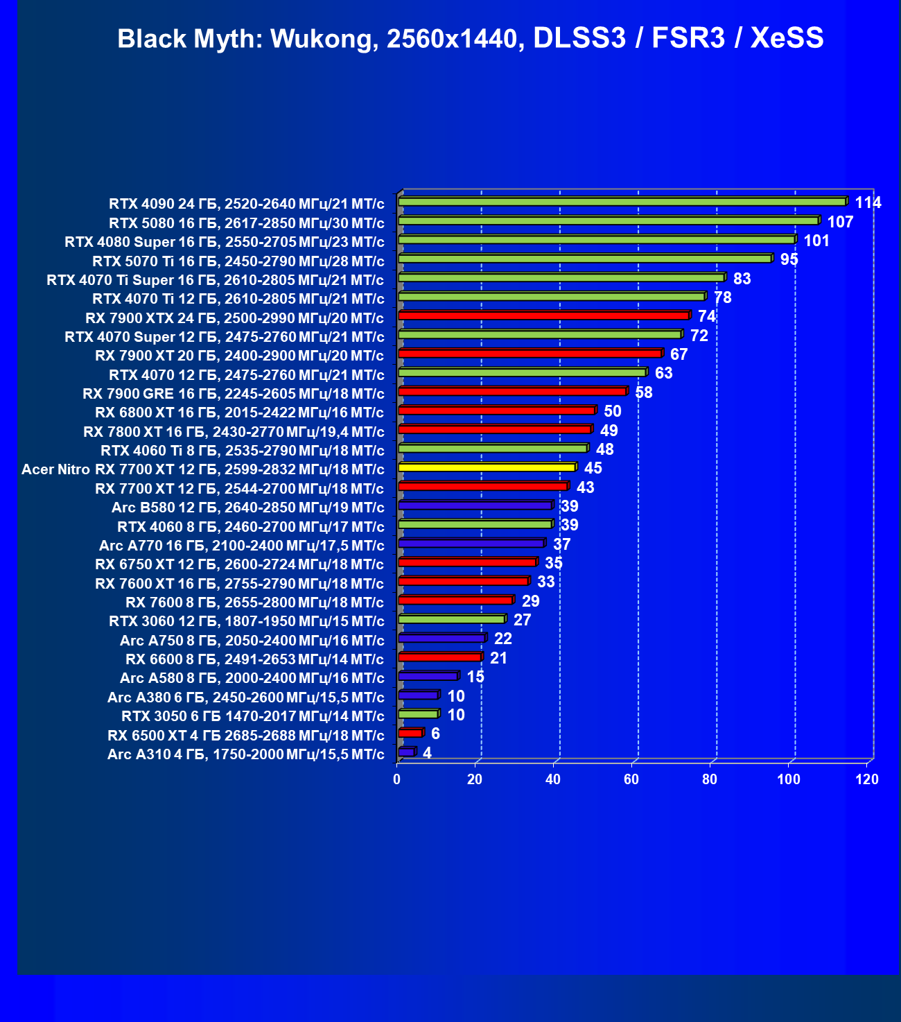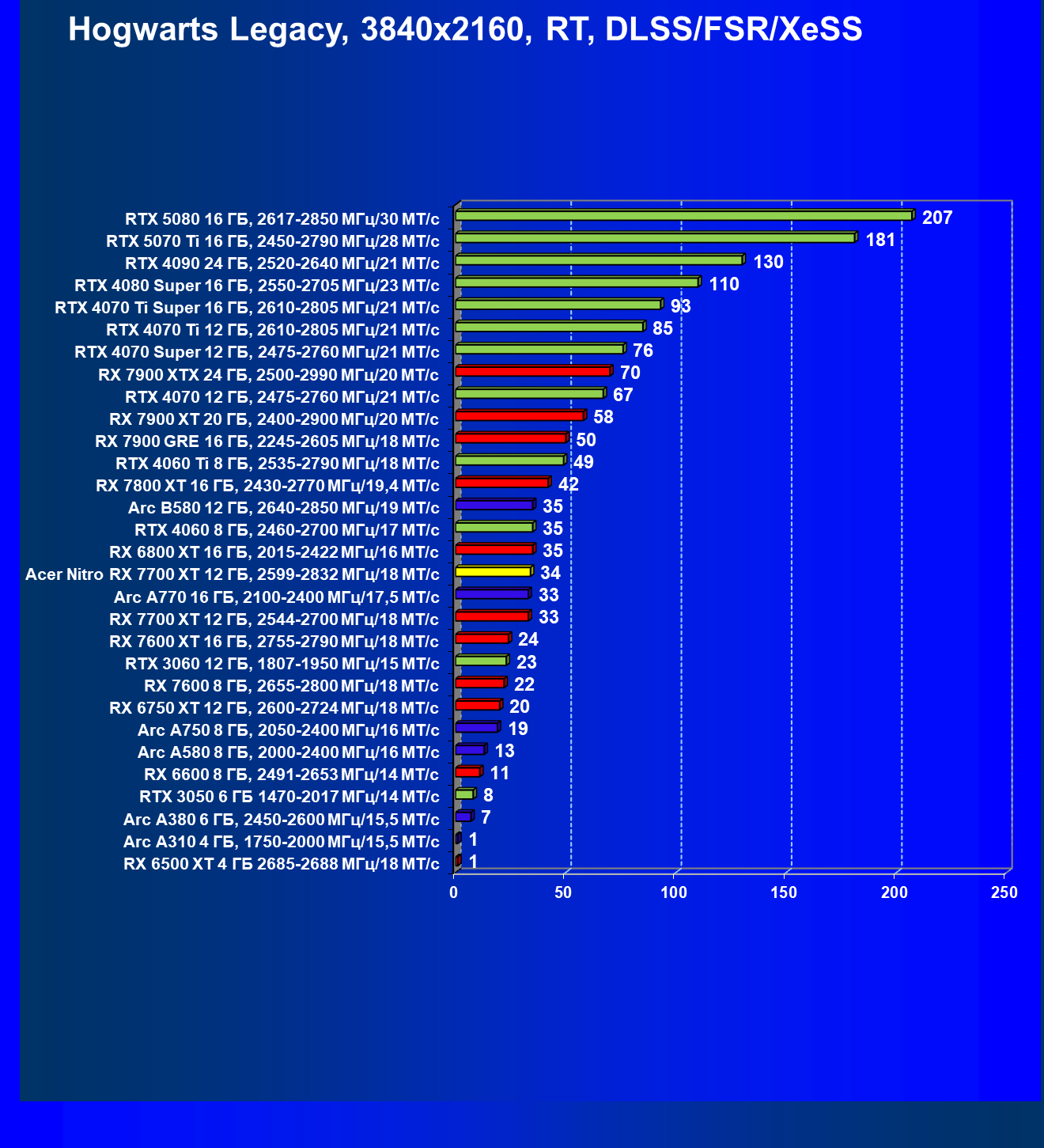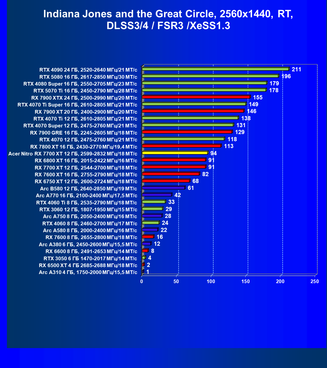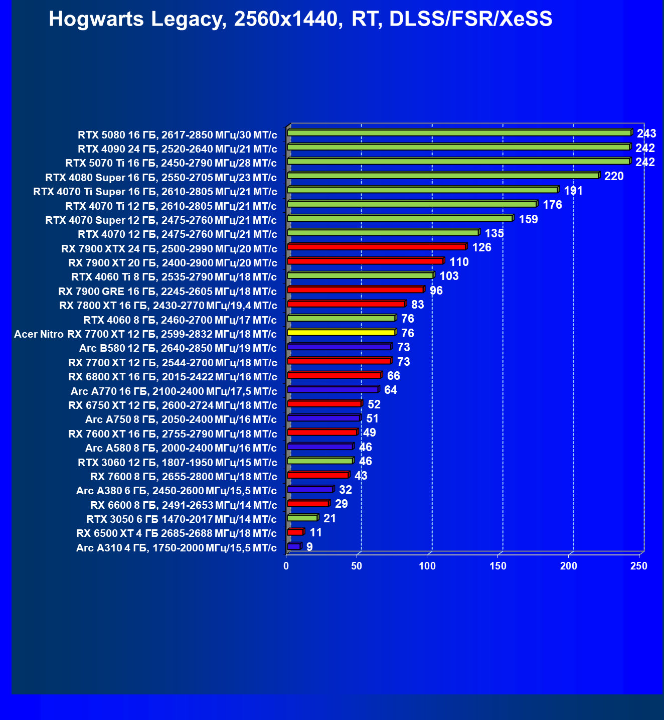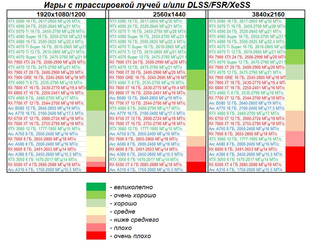 - Результаты тестов со включенной аппаратной трассировкой лучей и/или DLSS/FSR/XeSS в разрешениях 1920×1080, 2560×1440 и 3840×2160