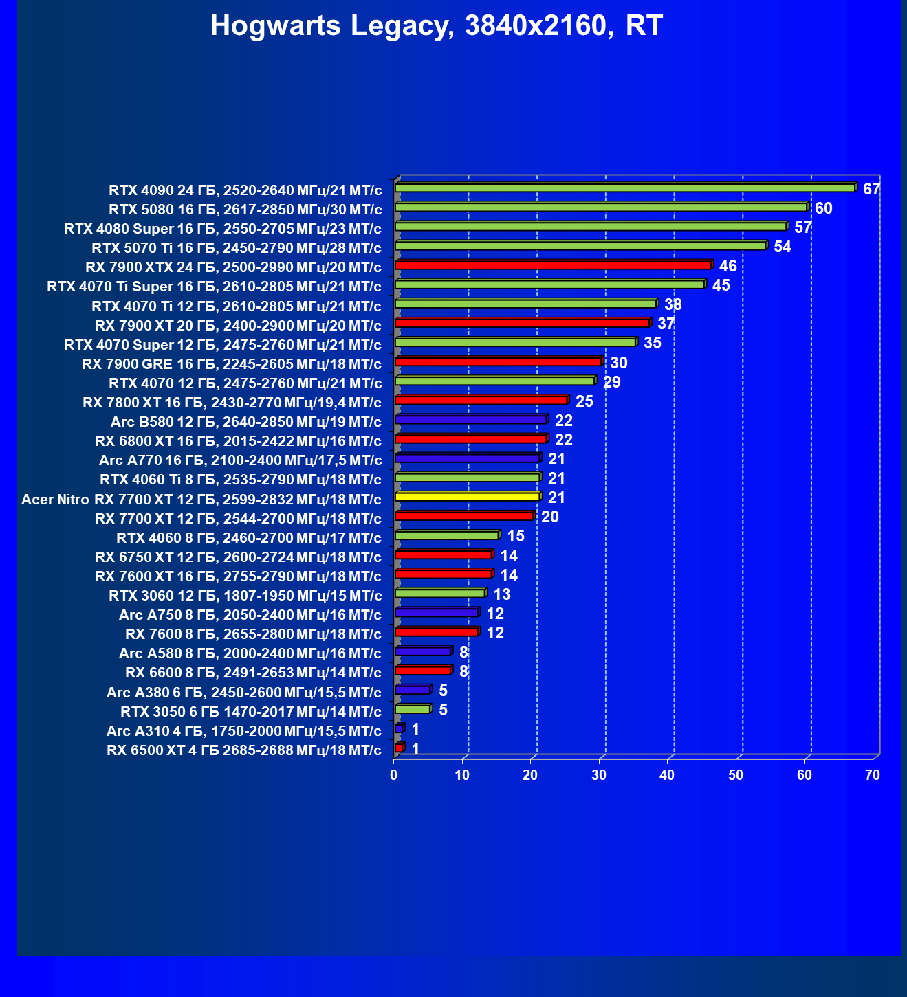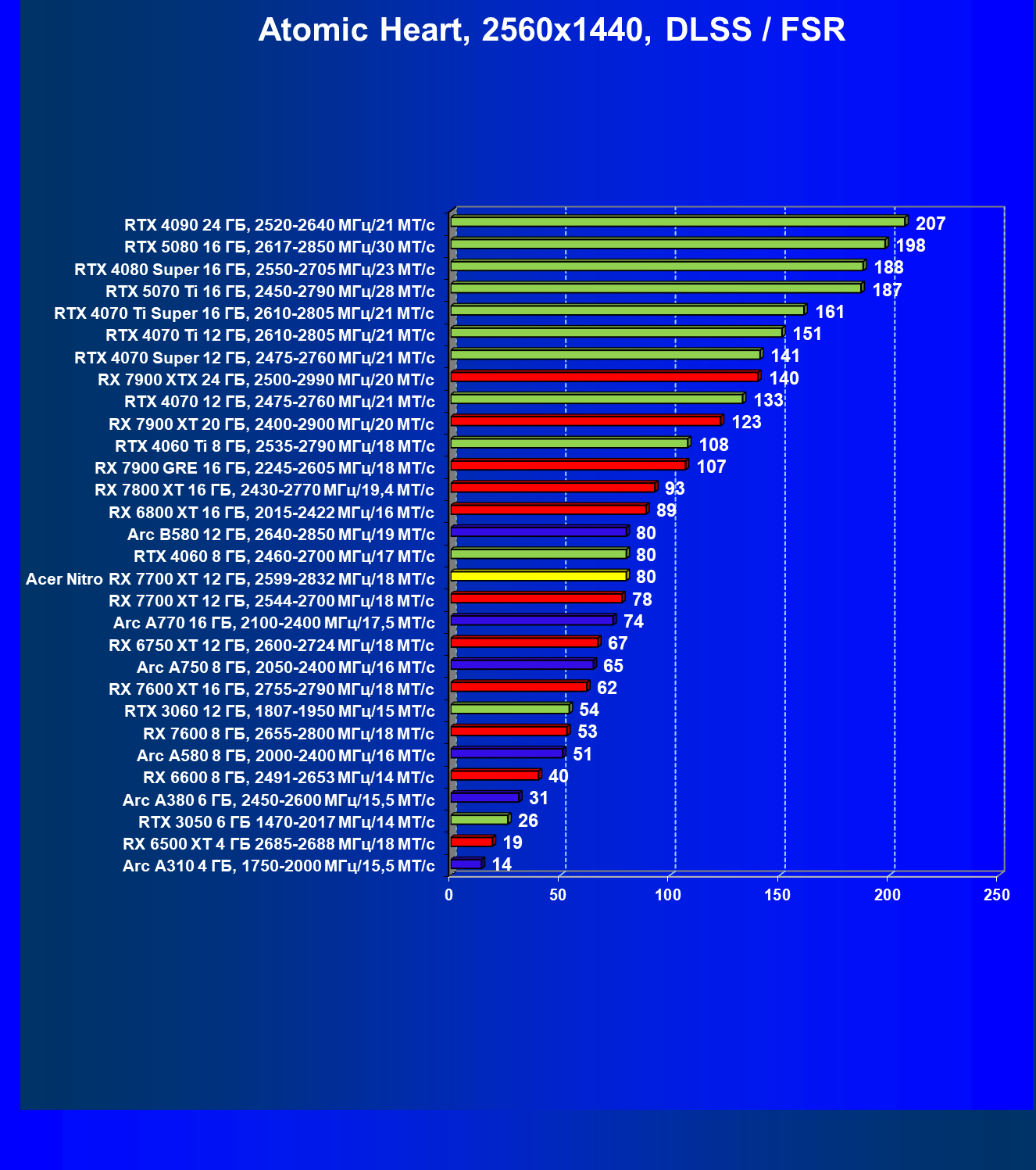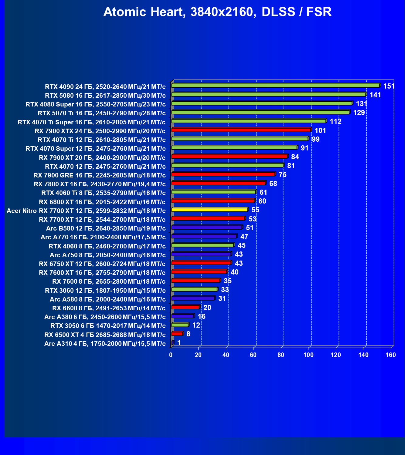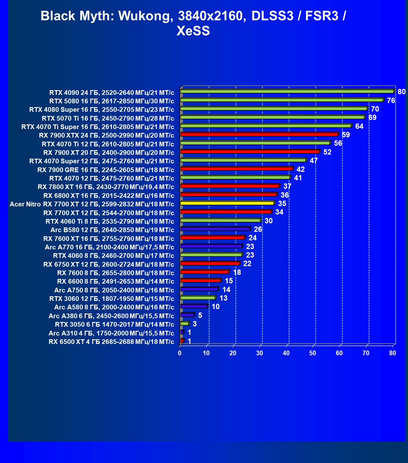 - Результаты тестов со включенной аппаратной трассировкой лучей и/или DLSS/FSR/XeSS в разрешениях 1920×1080, 2560×1440 и 3840×2160