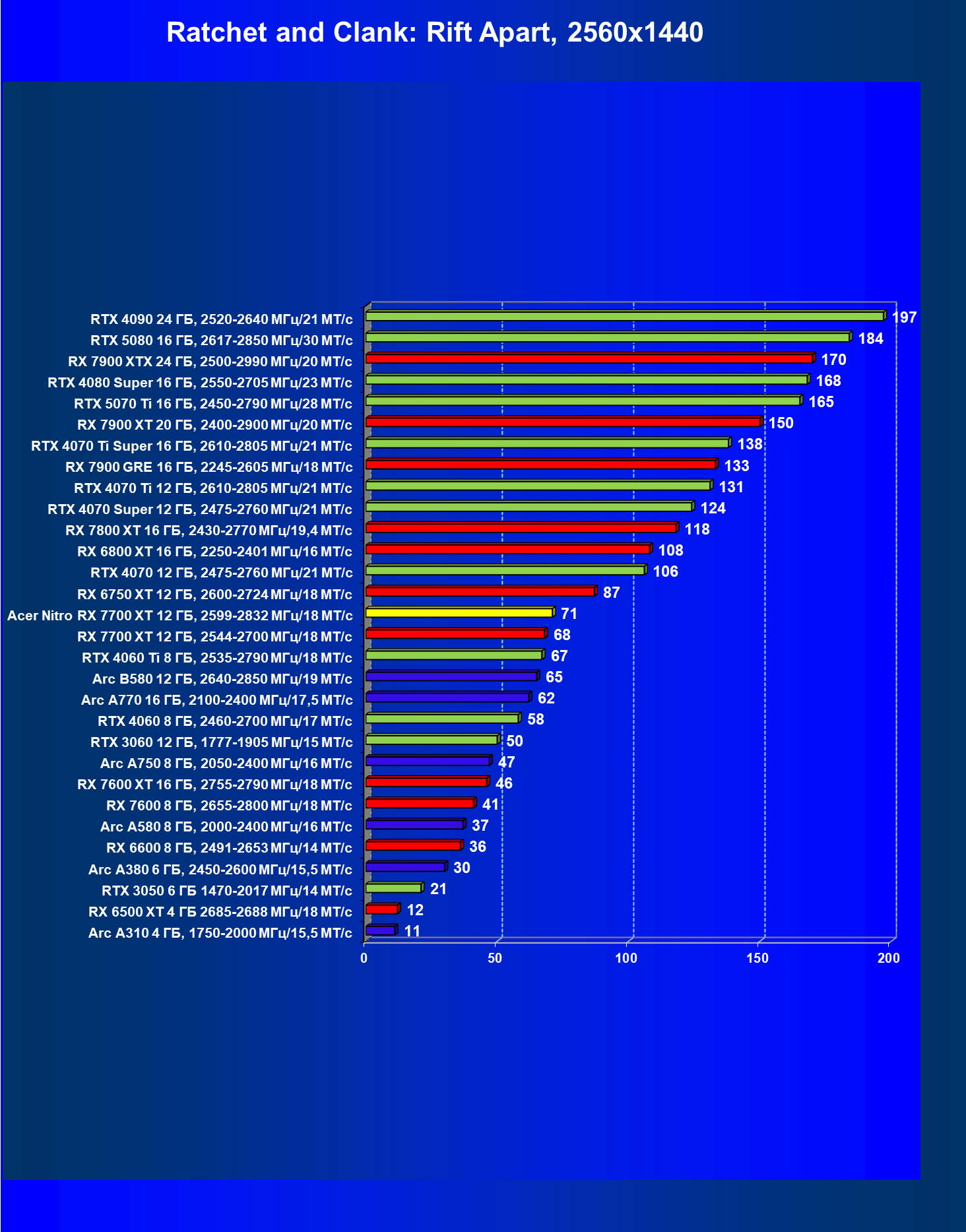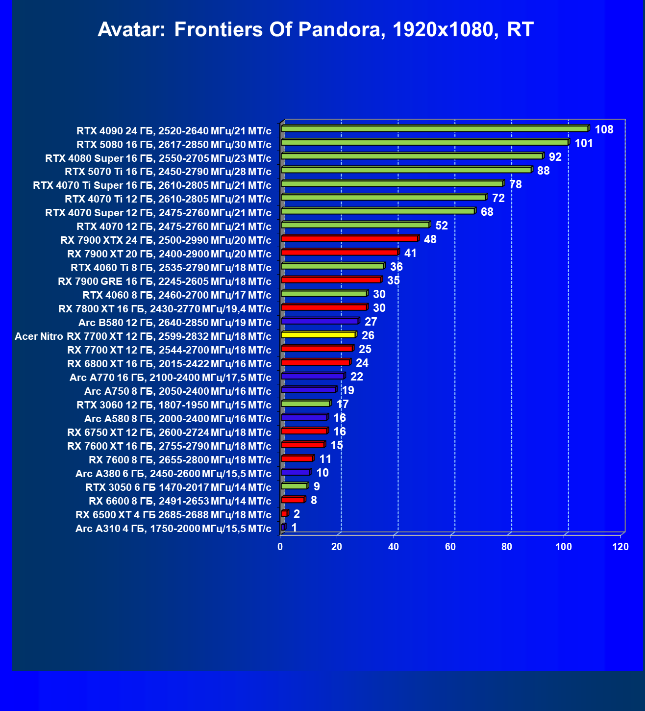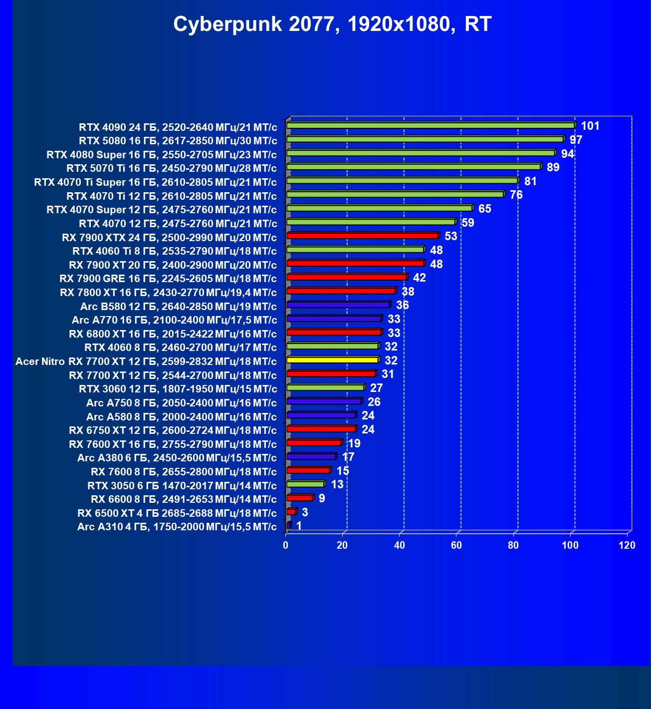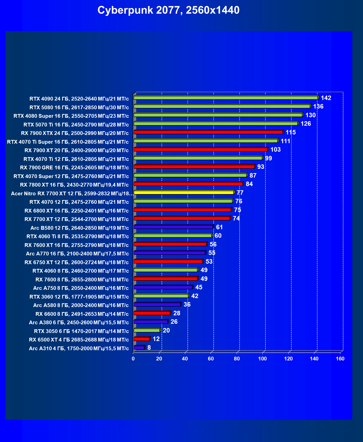 | 14 | Acer Nitro RX 7700 XT 12 ГБ, 2599—2832 МГц/18 МТ/с | 1103 | 208 | 53 000 |