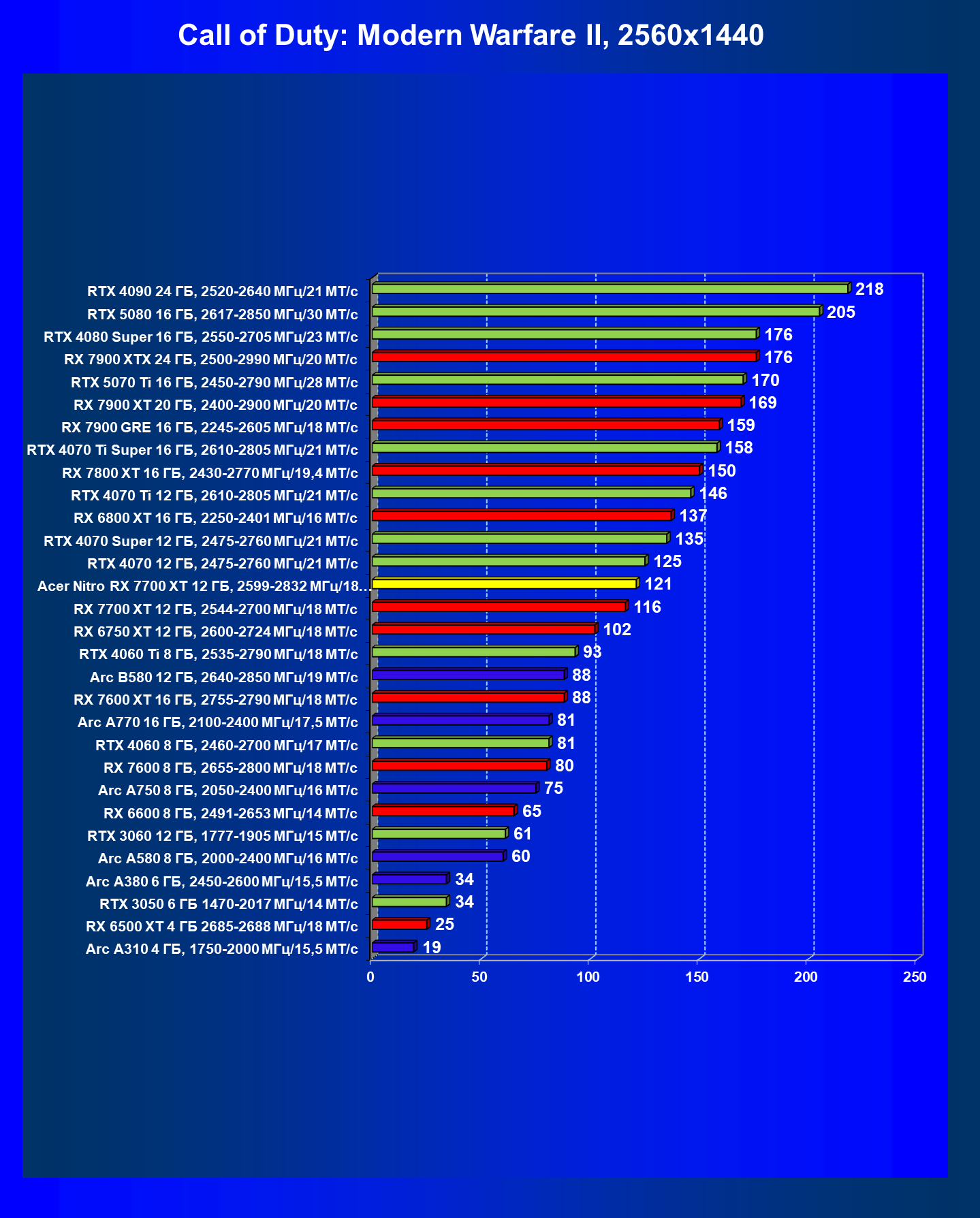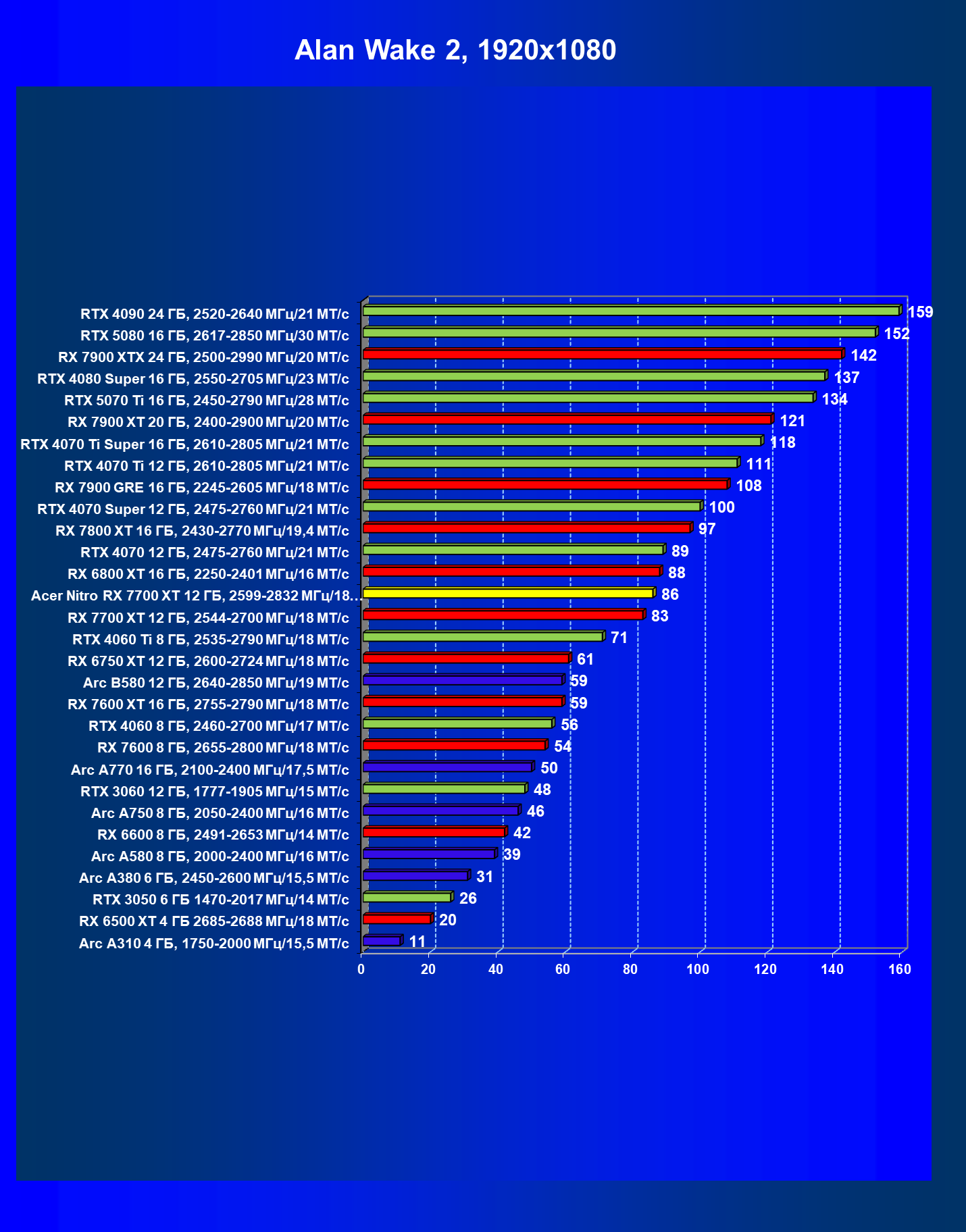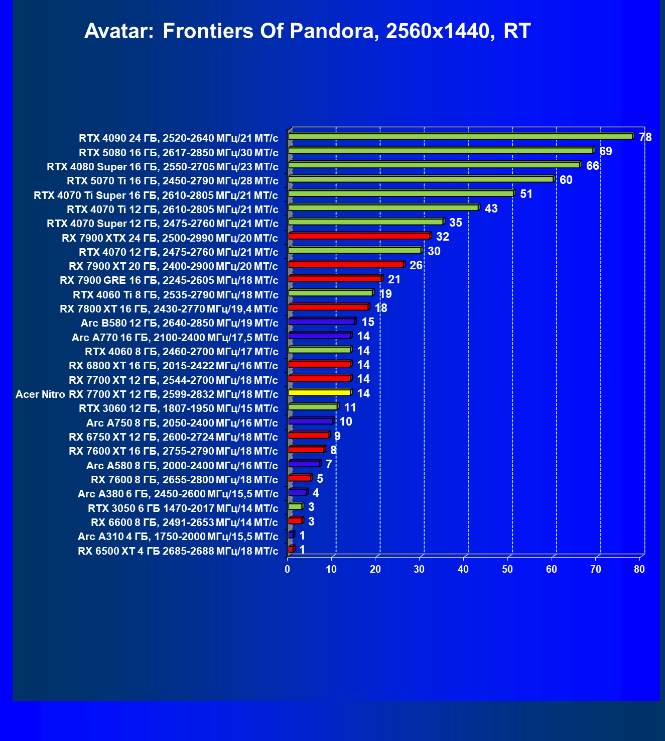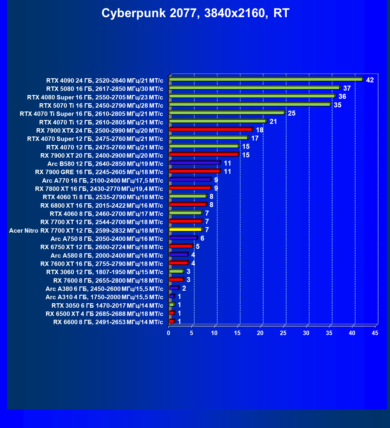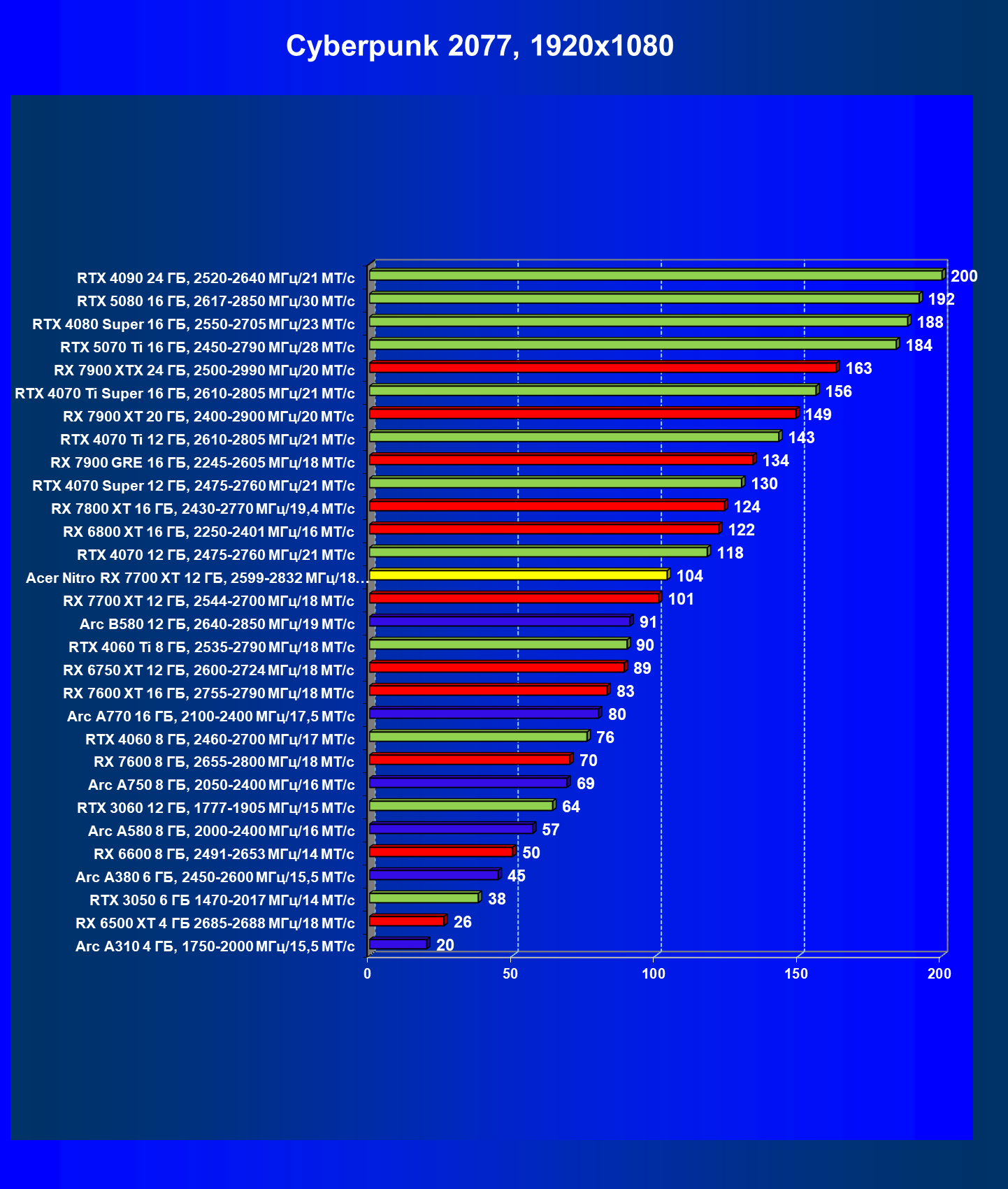 | 14 | Acer Nitro RX 7700 XT 12 ГБ, 2599—2832 МГц/18 МТ/с | 1103 | 208 | 53 000 |