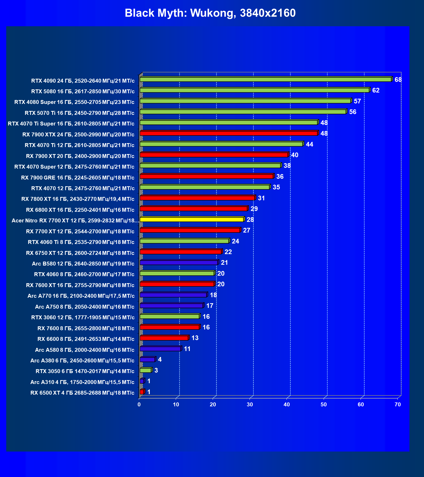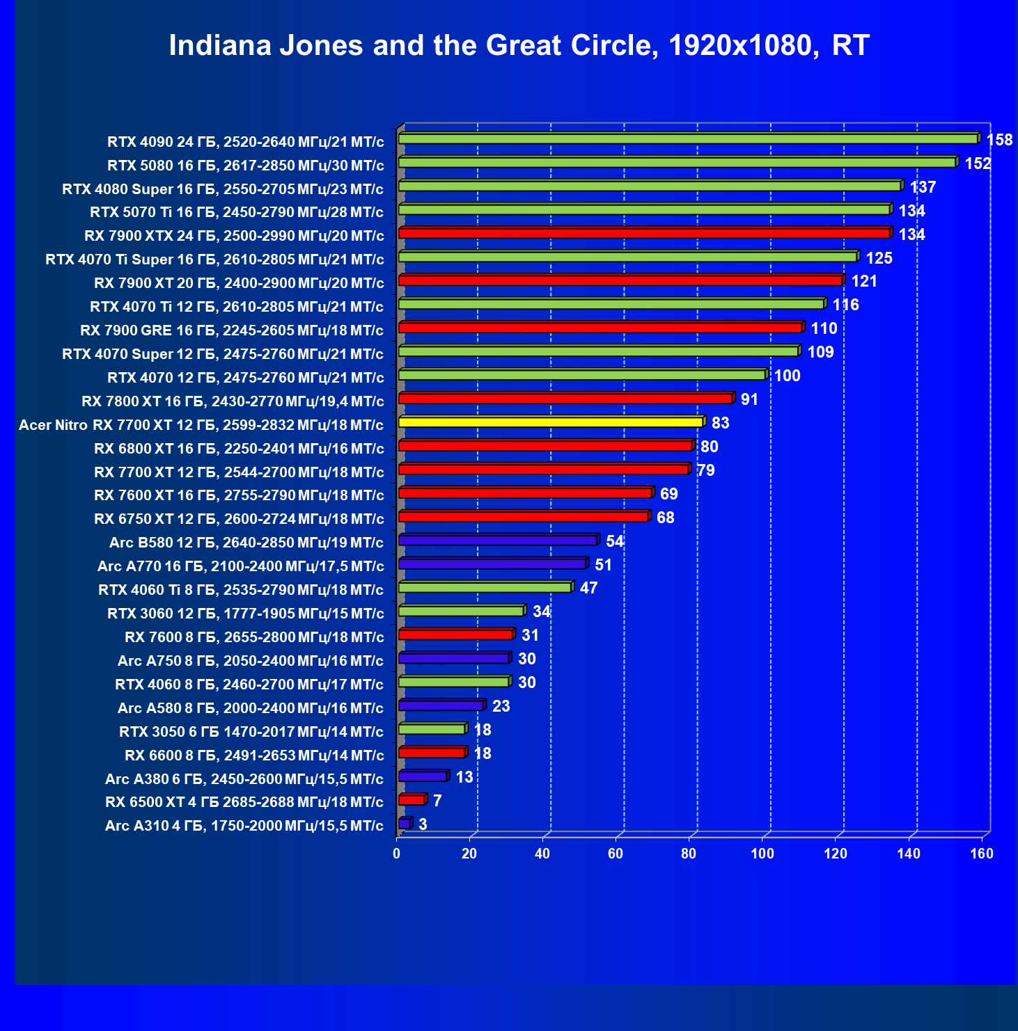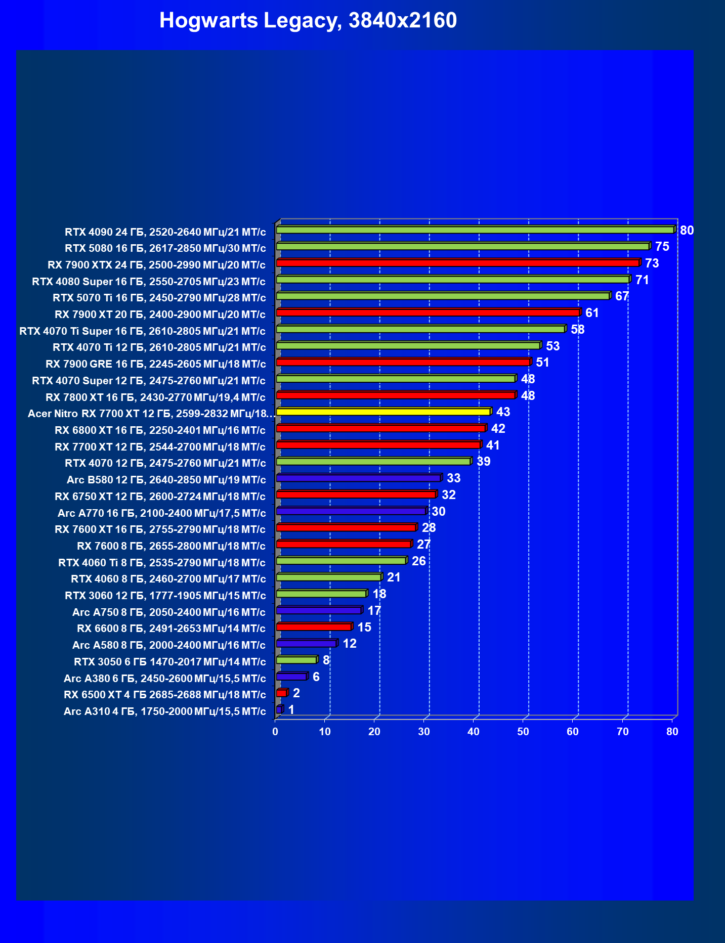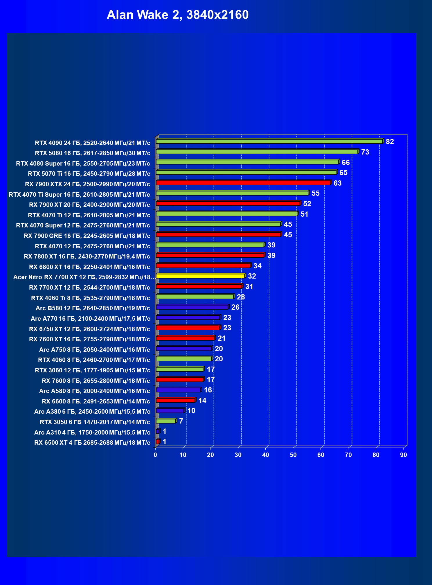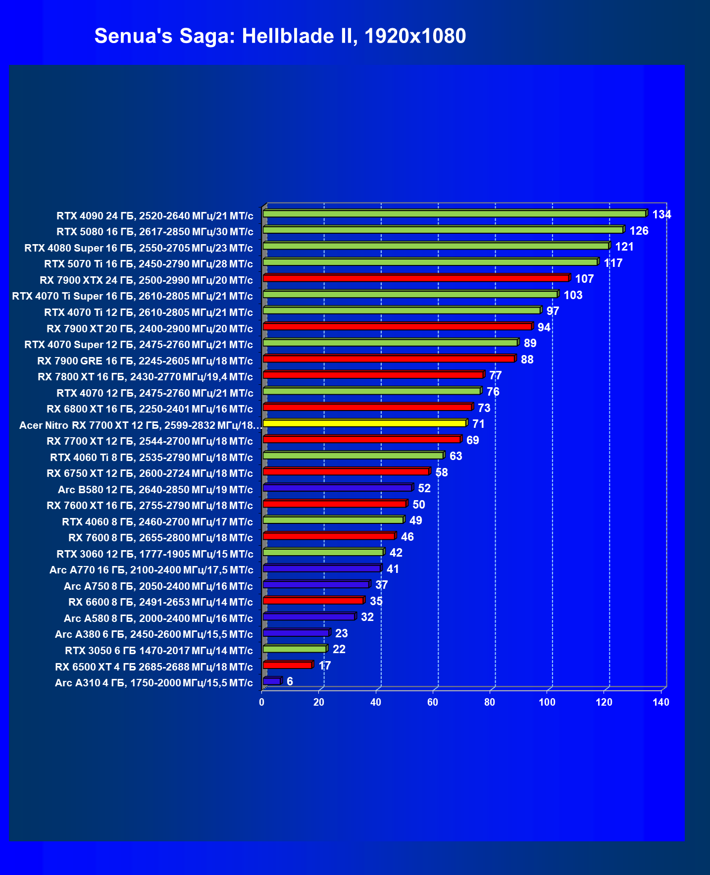 | 16 | RX 7700 XT 12 ГБ, 2544—2700 МГц/18 МТ/с | 1724 | 314 | 55 000 |