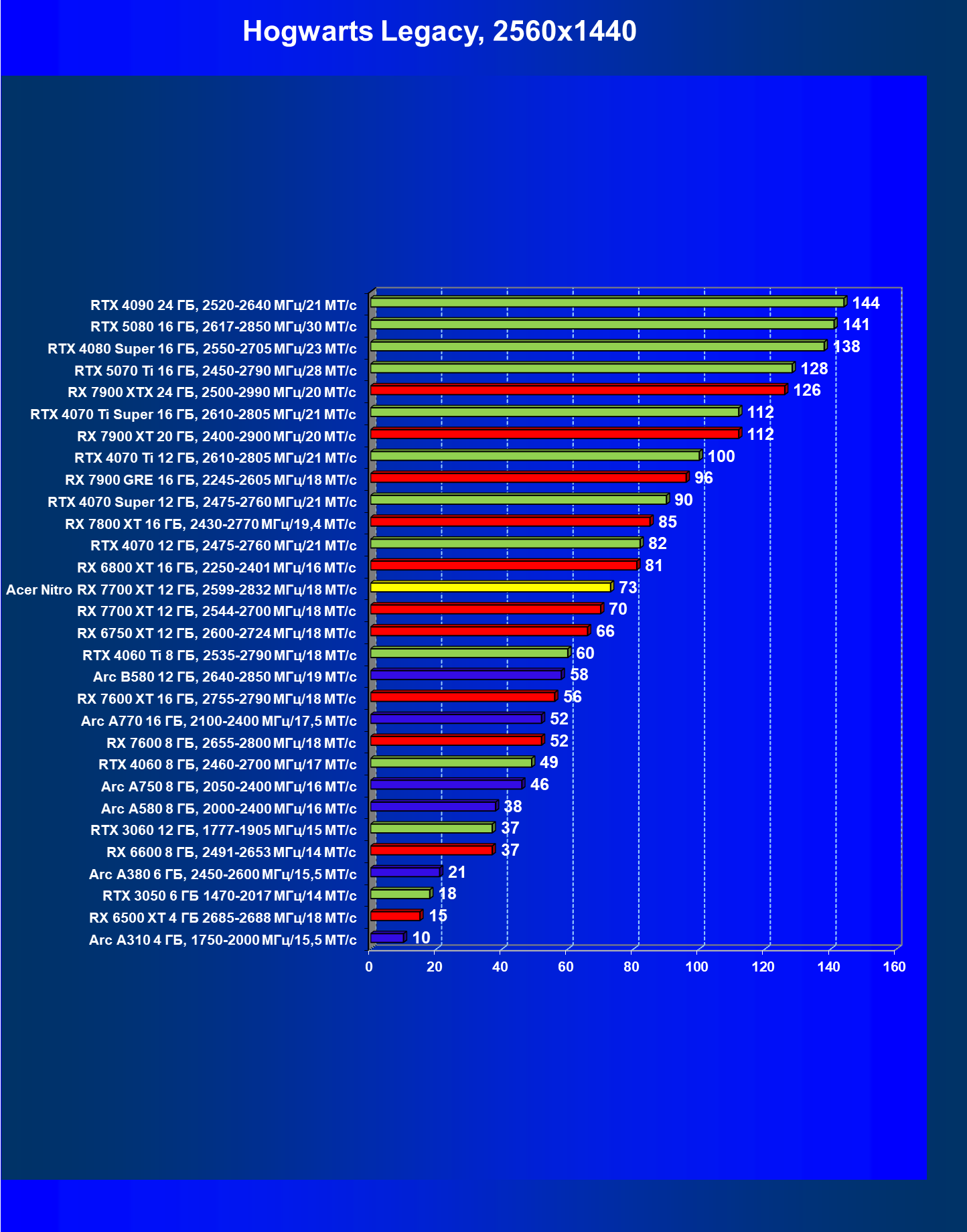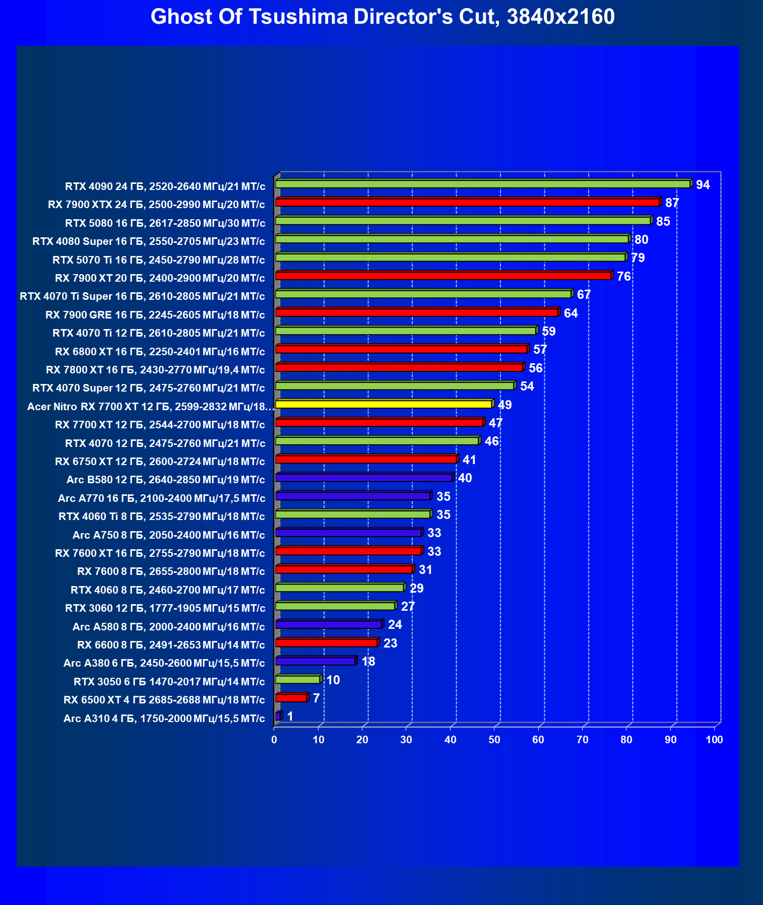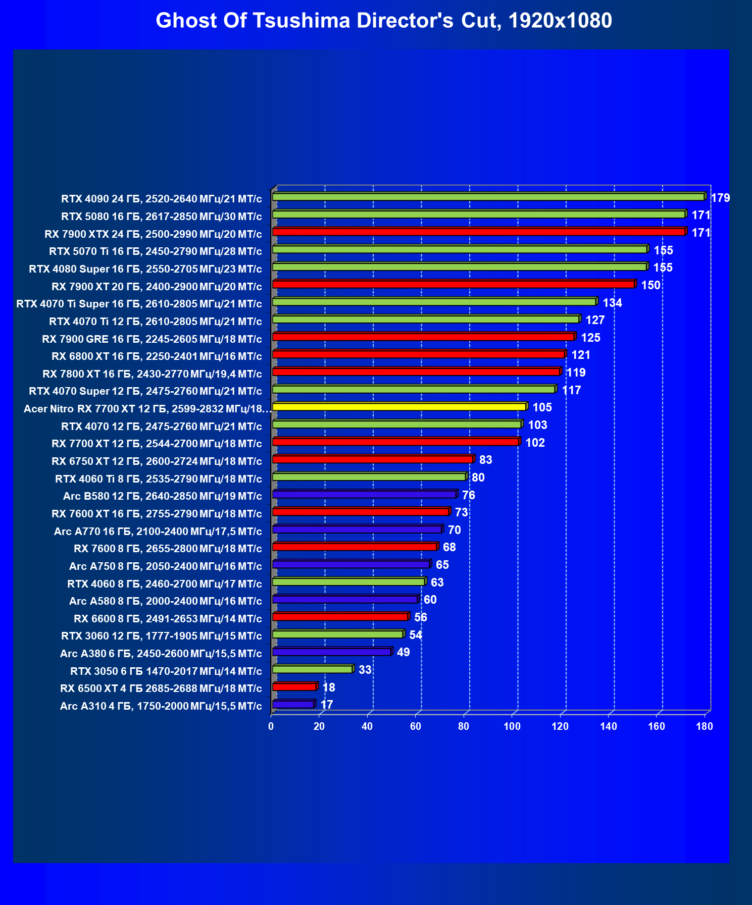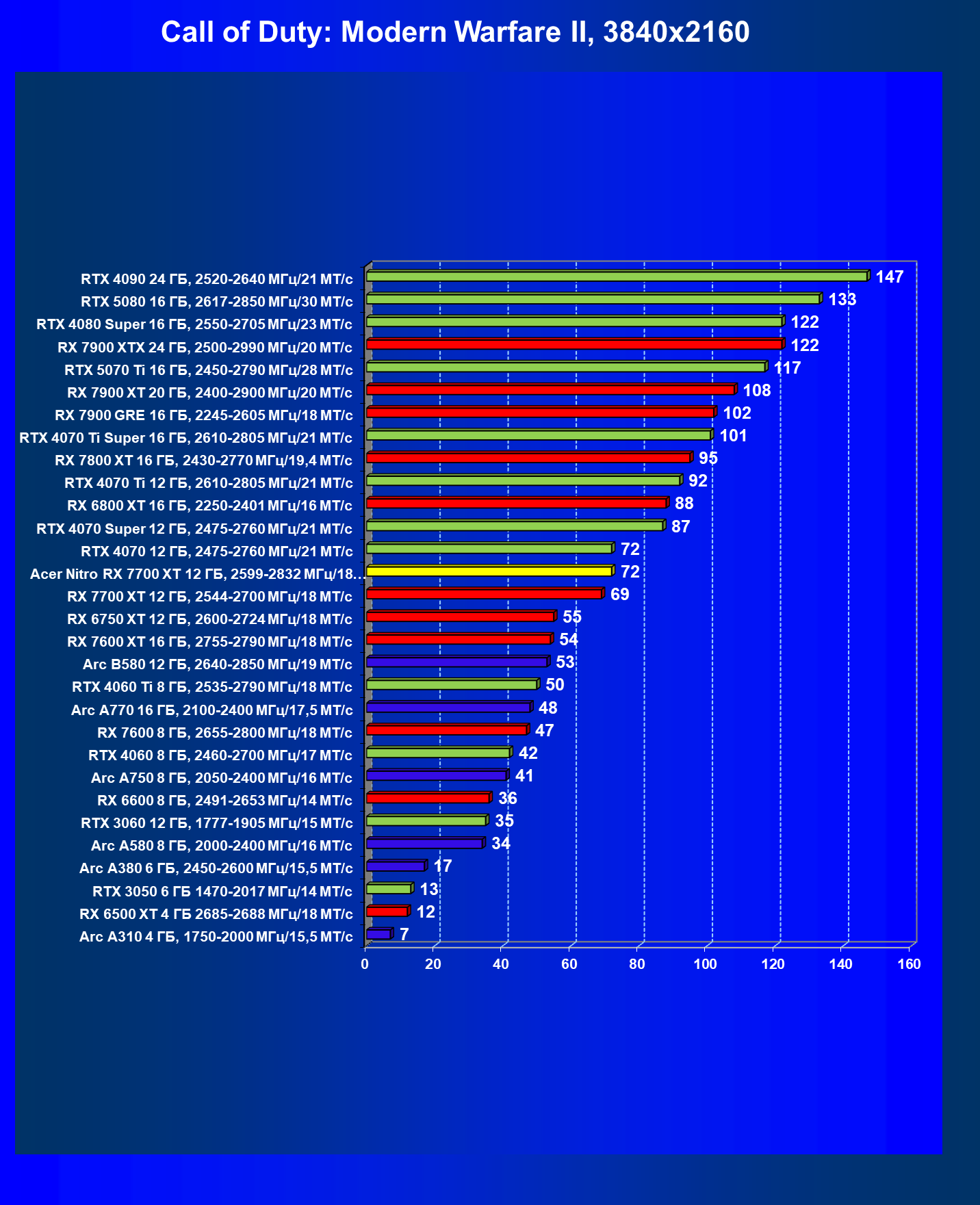 Radeon RX 7700 XT дороже, чем GeForce RTX 4060 Ti, но у него и производительность выше, так что в целом эта пара имеет практически одинаковый рейтинг. Карта Acer одновременно чуть дешевле и чуть быстрее референсного ускорителя, так что она заняла первое место в своей группе.