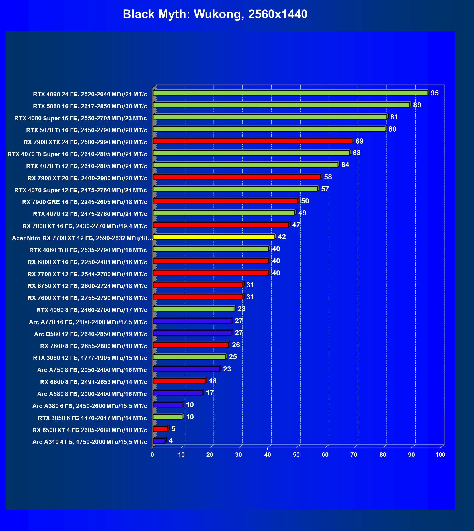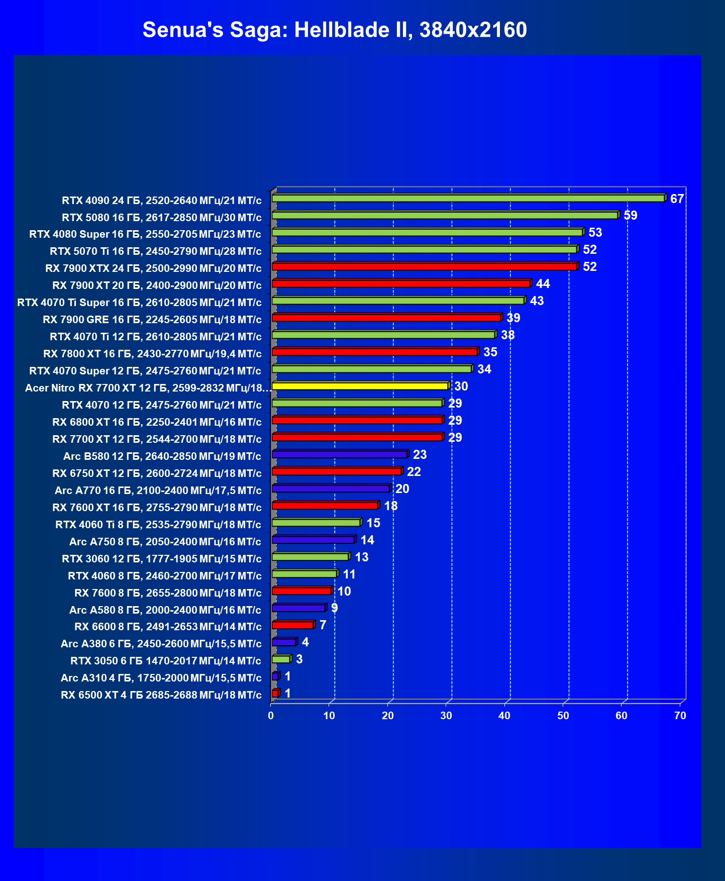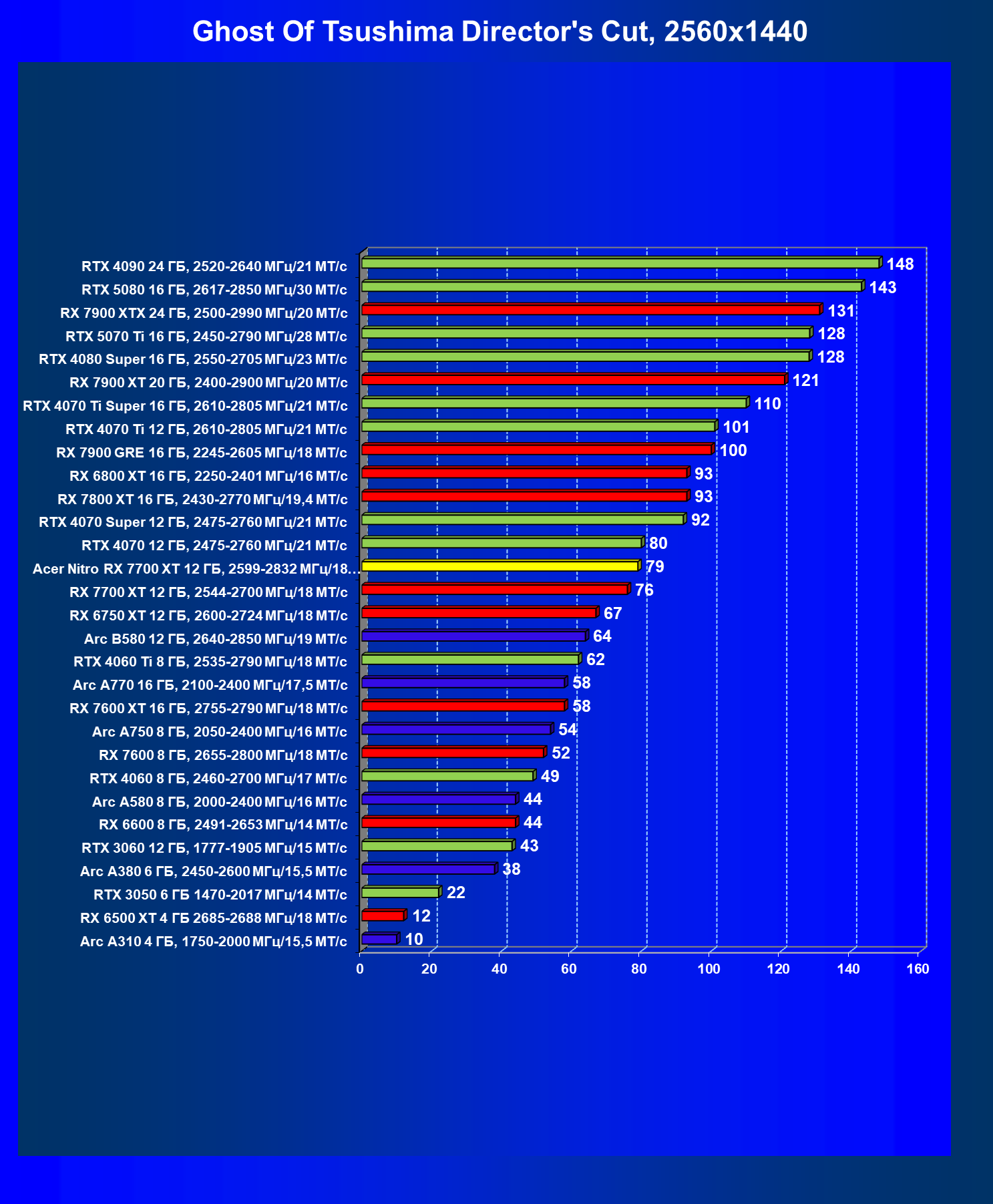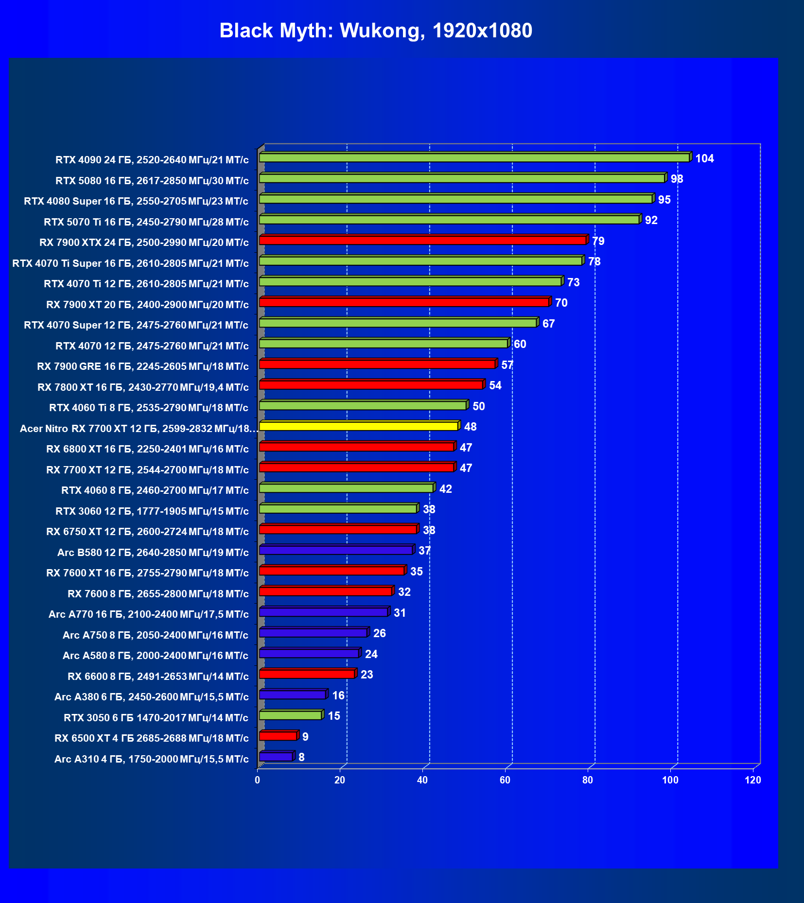 Radeon RX 7700 XT дороже, чем GeForce RTX 4060 Ti, но у него и производительность выше, так что в целом эта пара имеет практически одинаковый рейтинг. Карта Acer одновременно чуть дешевле и чуть быстрее референсного ускорителя, так что она заняла первое место в своей группе.