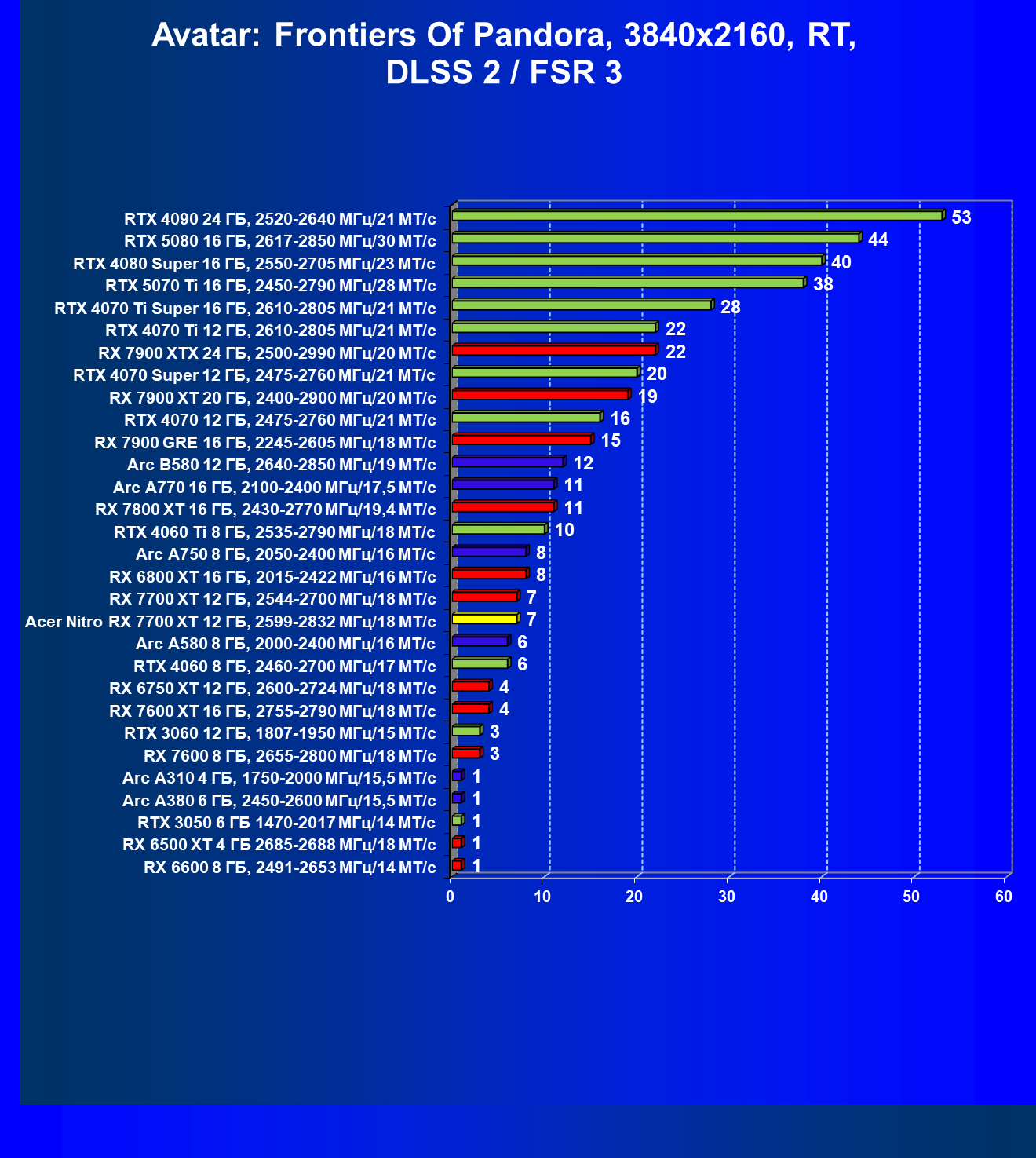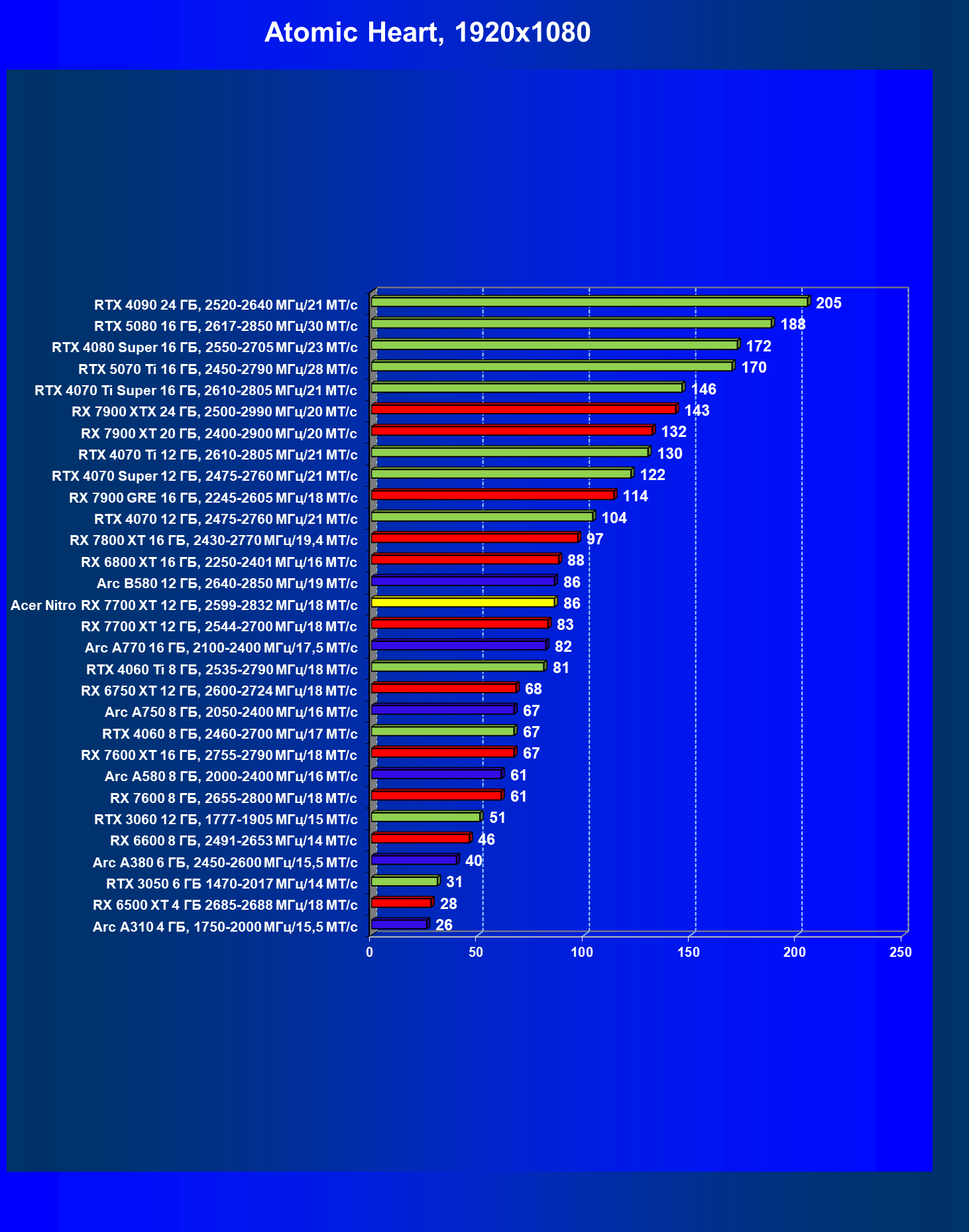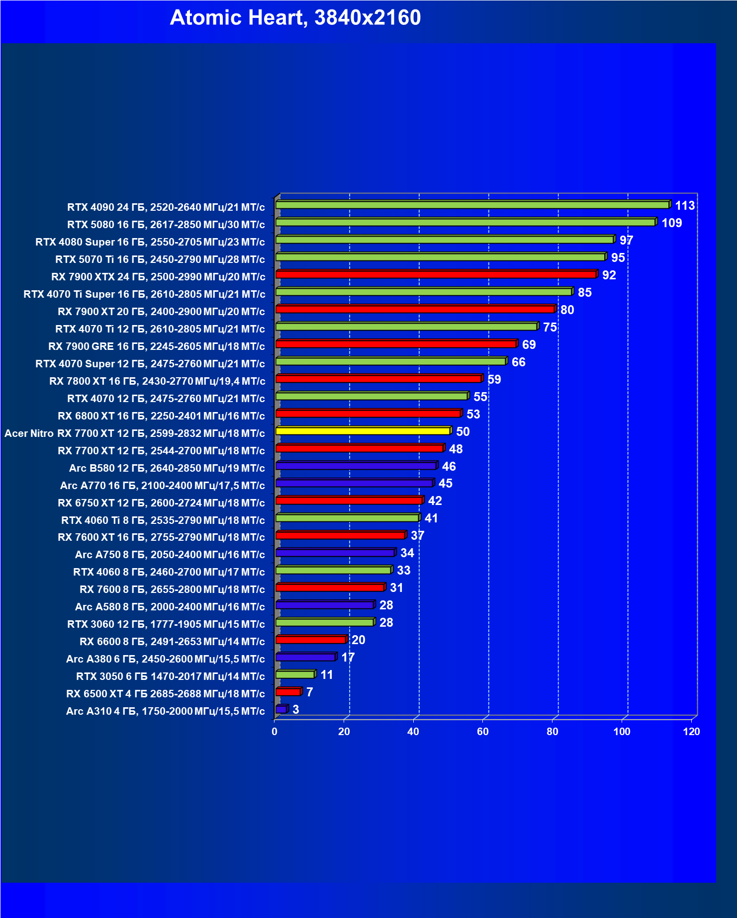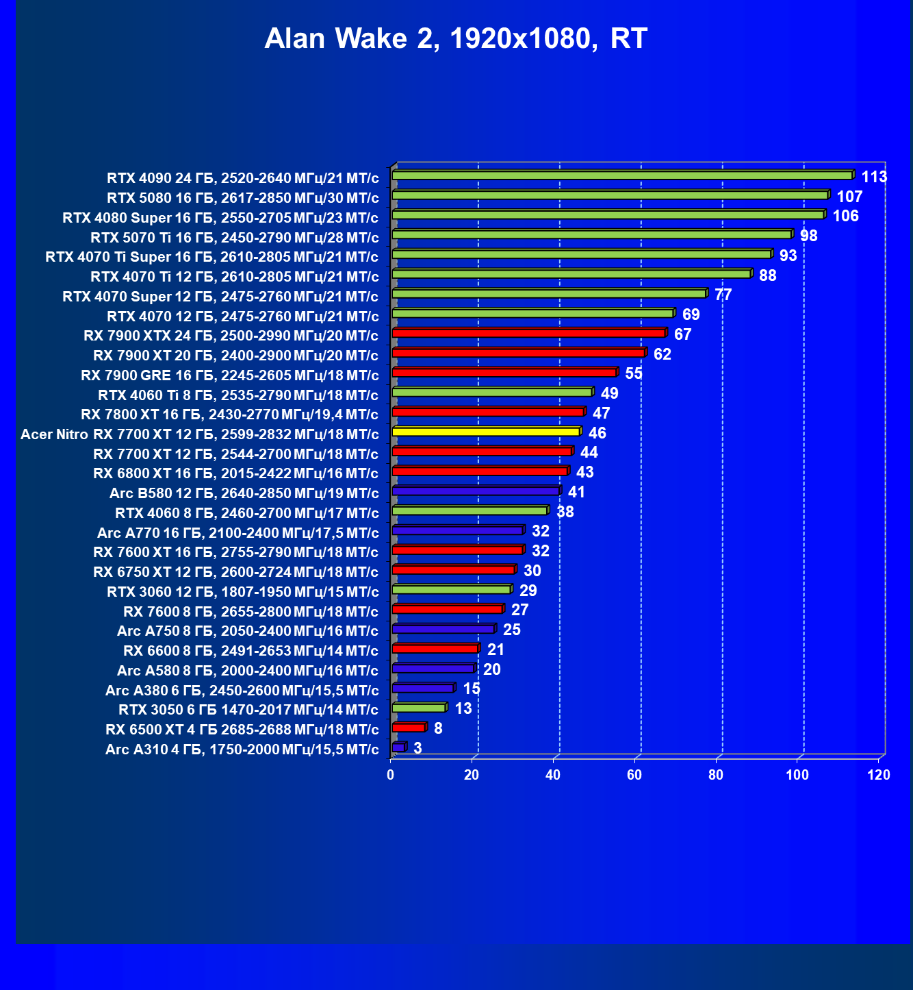 | 03 | Acer Nitro RX 7700 XT 12 ГБ, 2599—2832 МГц/18 МТ/с | 208 | 1103 | 53 000 |
