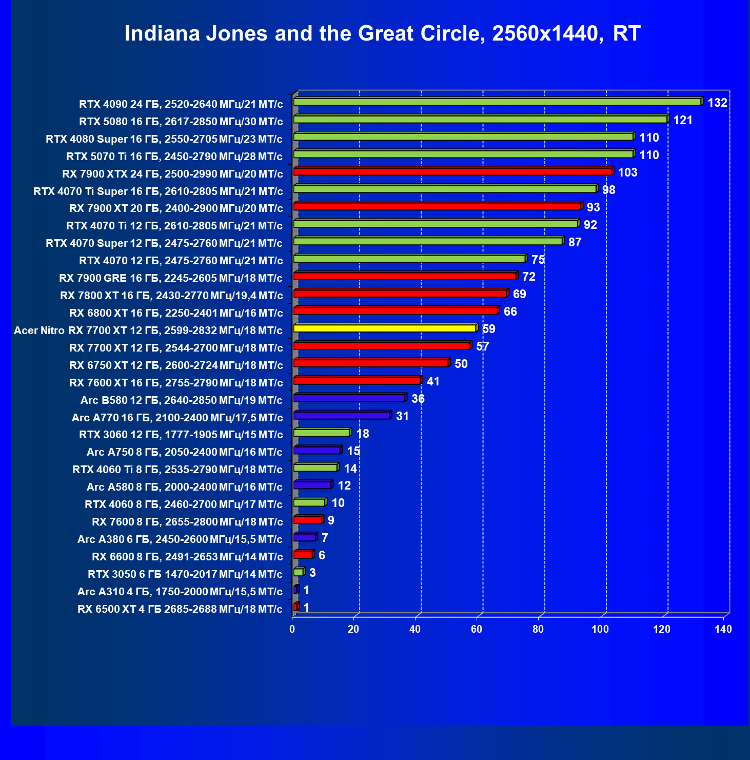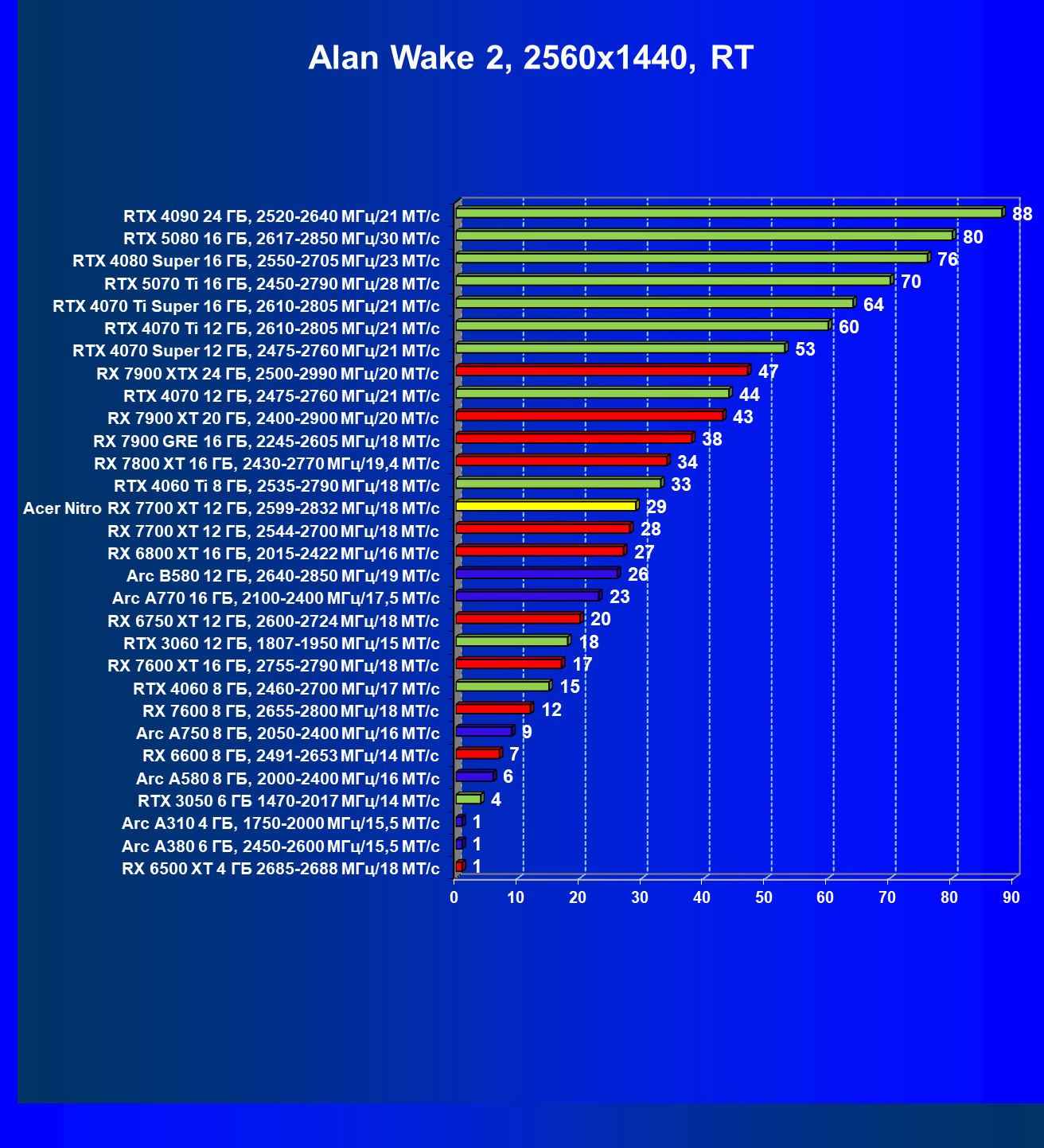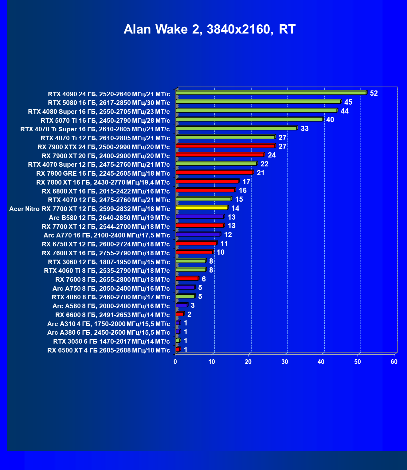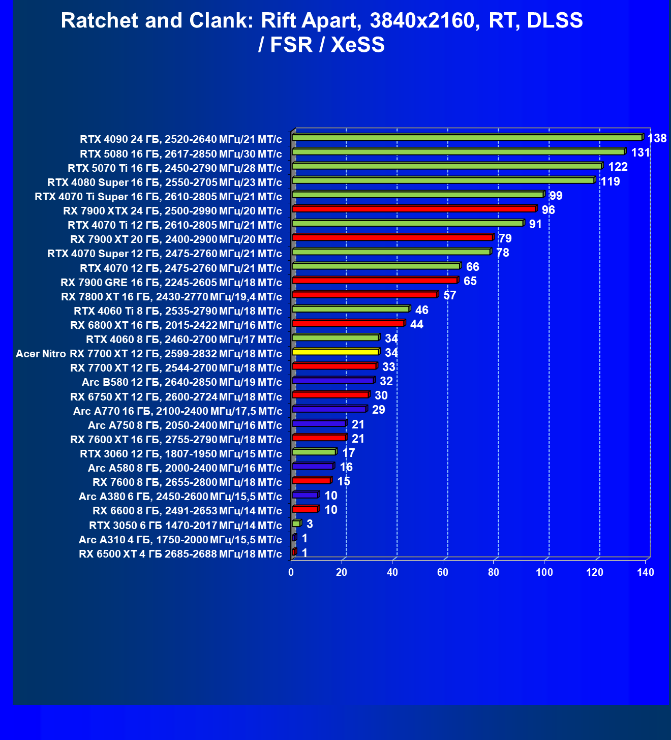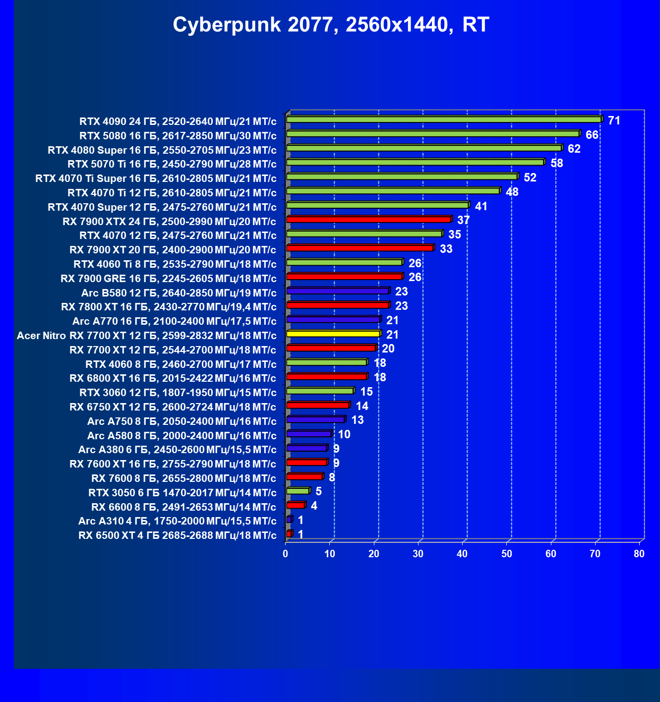 В играх с RT и FSR/XeSS ускоритель Radeon RX 7700 XT обеспечит неплохой комфорт в разрешении 1080p и приемлемый — в 1440p. Для 4K он уже не годится. В таких играх Radeon RX 7700 XT может соперничать с GeForce RTX 4060 (GeForce RTX 4060 Ti в целом быстрее из-за относительно массовой поддержки DLSS 3). Также Radeon RX 7700 XT является конкурентом для ускорителей на базе Intel Arc B580 и A770. Карта Acer имеет чуть более высокую производительность, чем референсная.