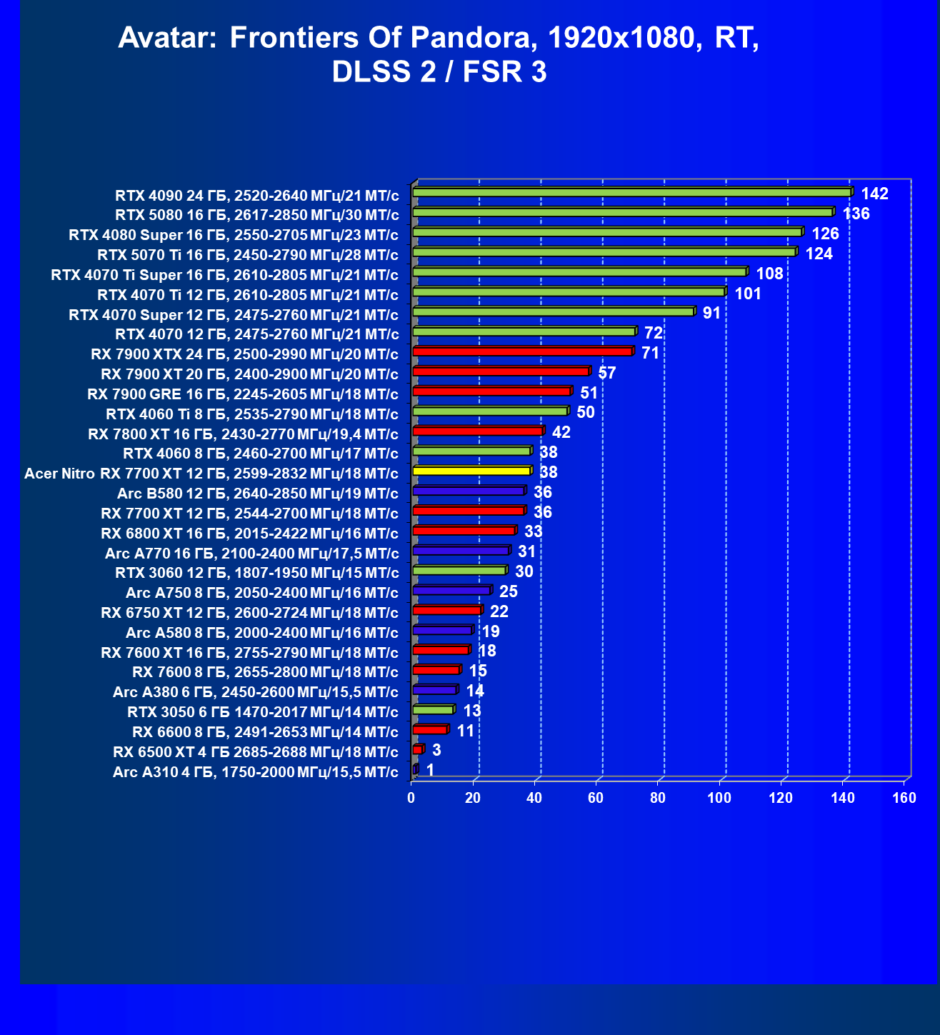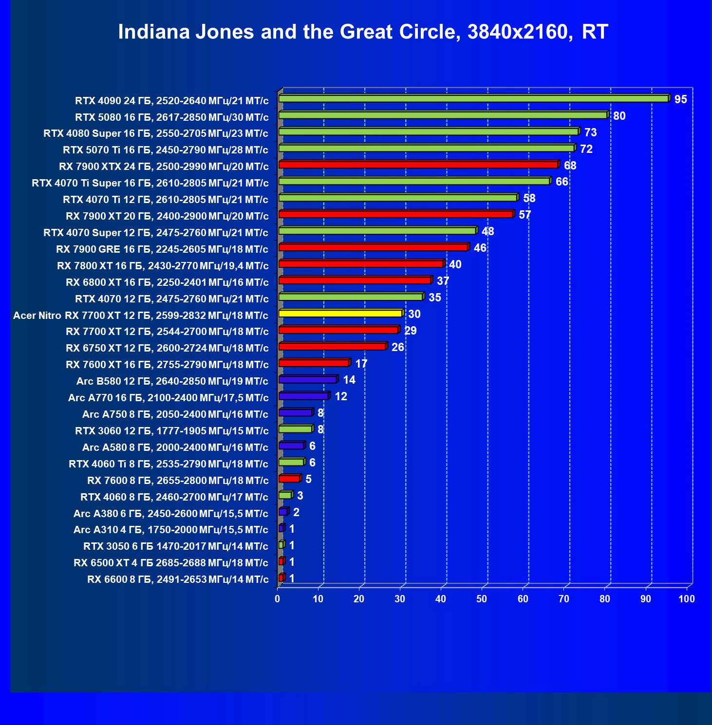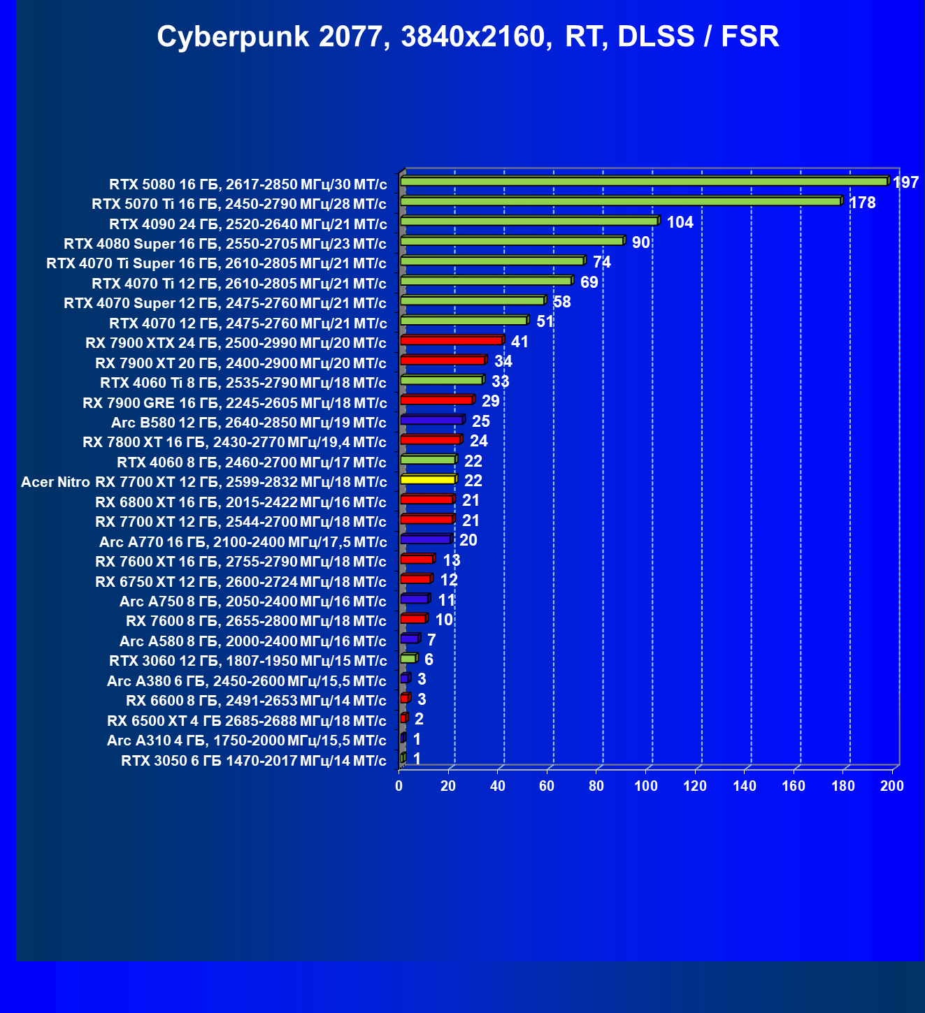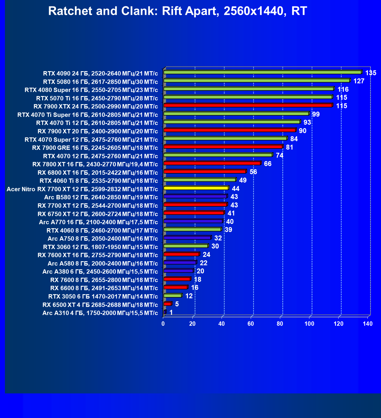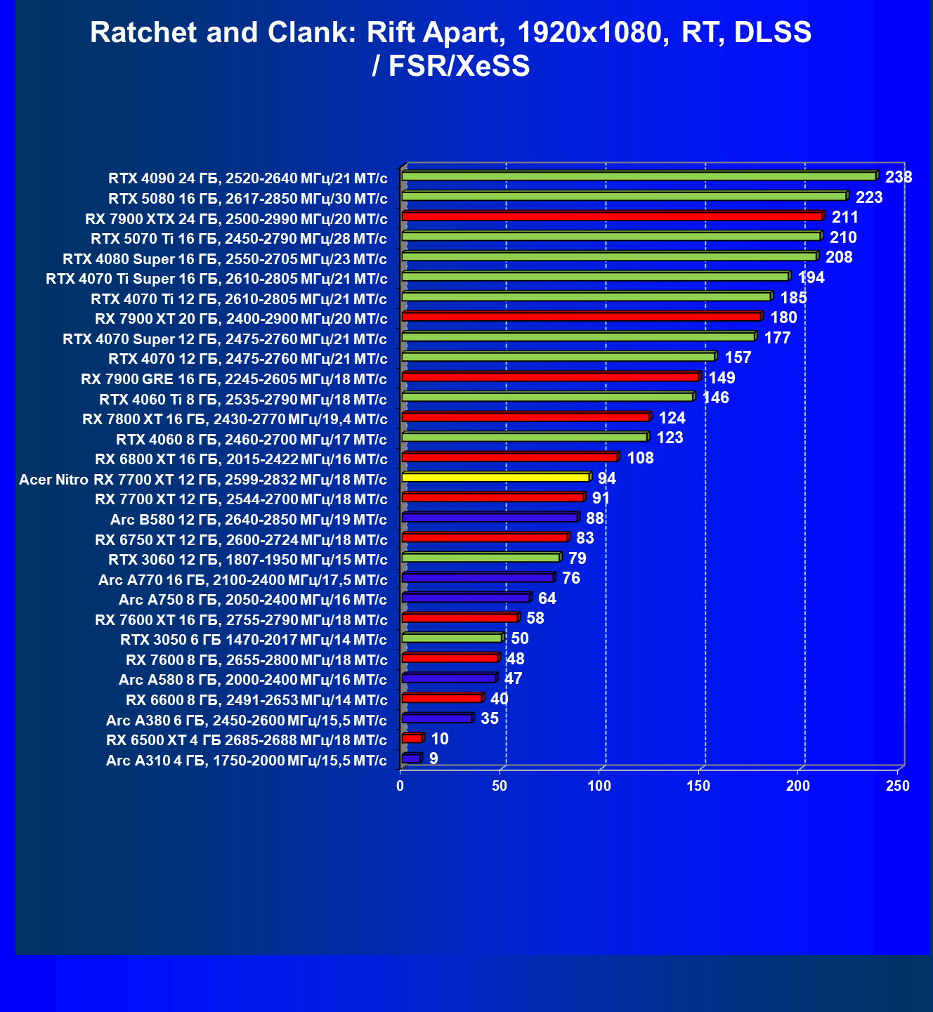 В играх с RT и FSR/XeSS ускоритель Radeon RX 7700 XT обеспечит неплохой комфорт в разрешении 1080p и приемлемый — в 1440p. Для 4K он уже не годится. В таких играх Radeon RX 7700 XT может соперничать с GeForce RTX 4060 (GeForce RTX 4060 Ti в целом быстрее из-за относительно массовой поддержки DLSS 3). Также Radeon RX 7700 XT является конкурентом для ускорителей на базе Intel Arc B580 и A770. Карта Acer имеет чуть более высокую производительность, чем референсная.