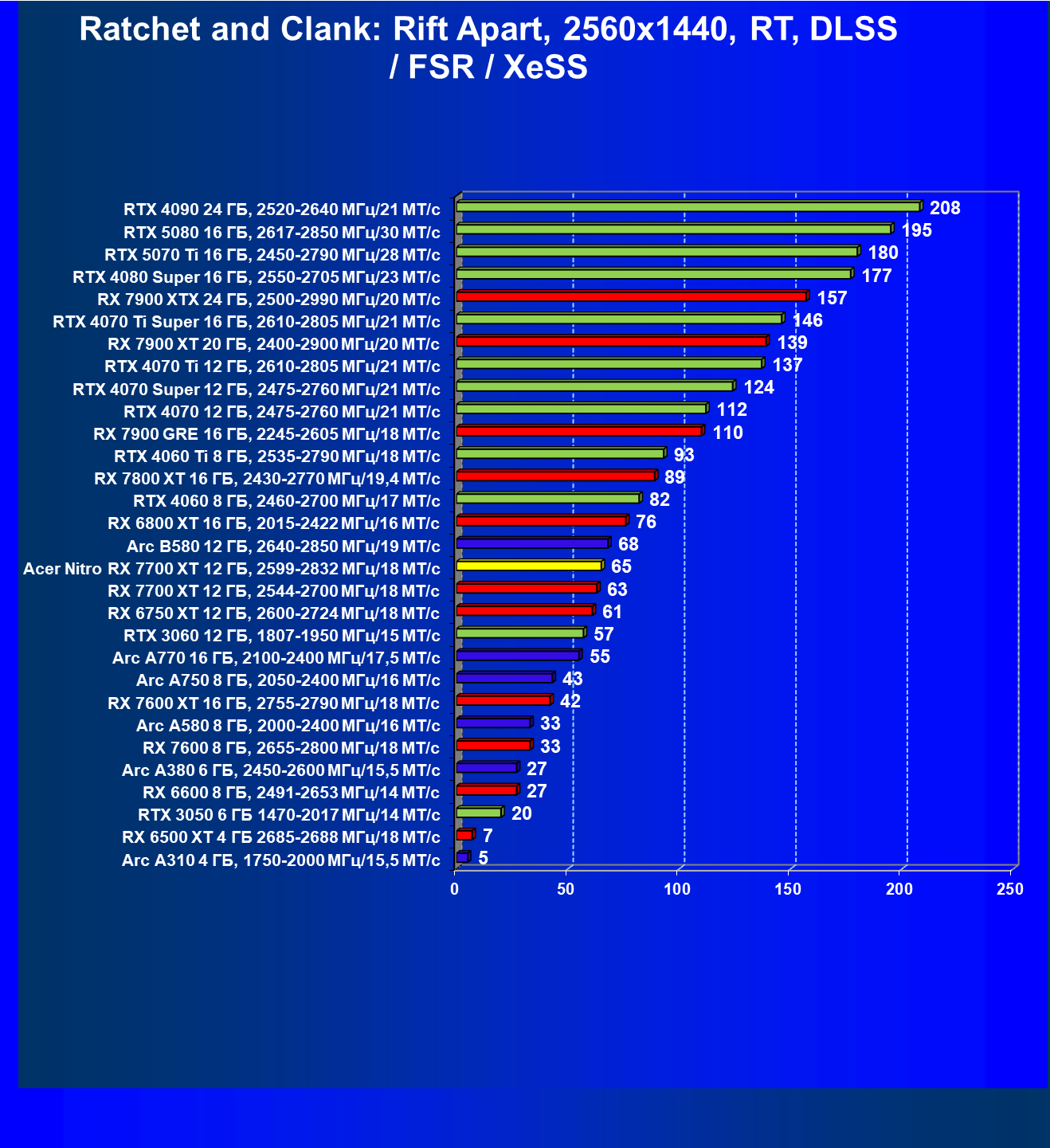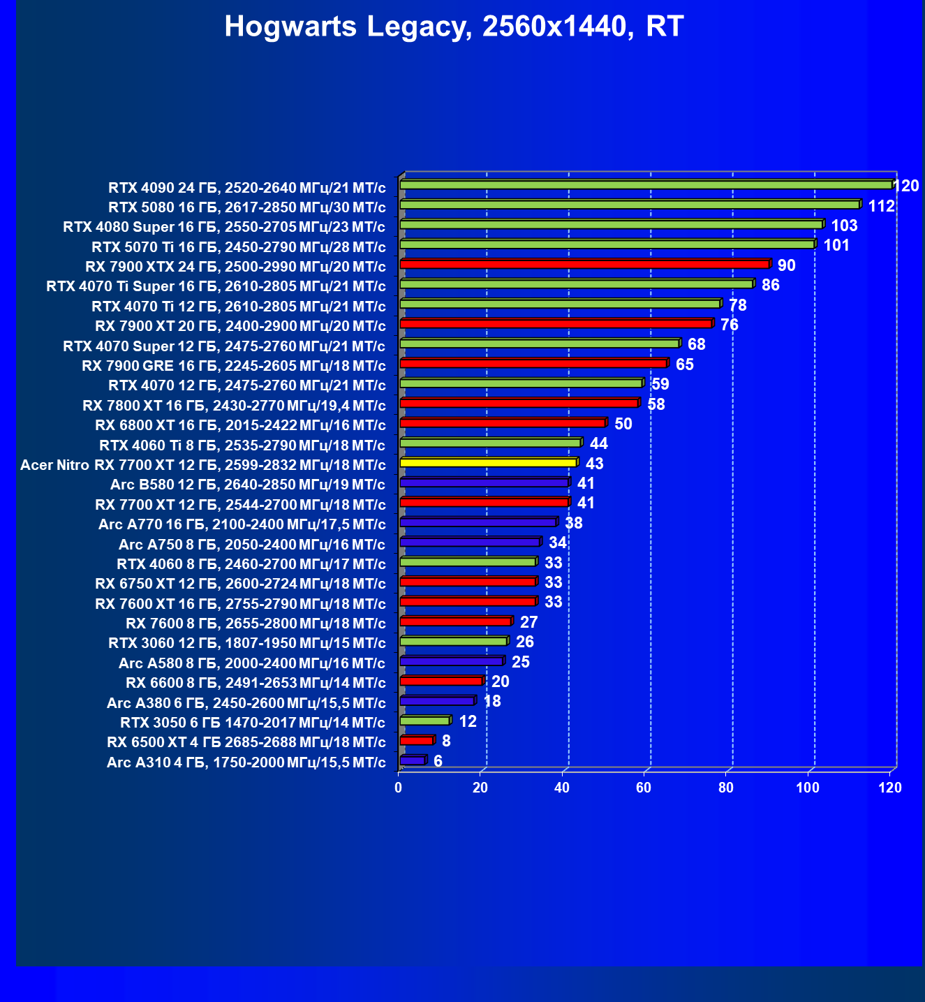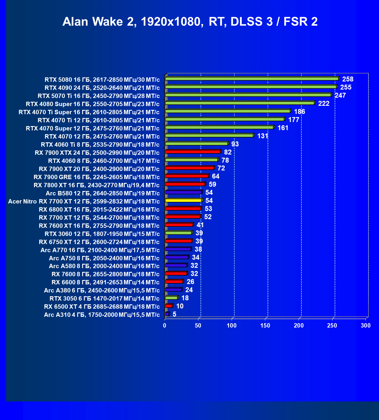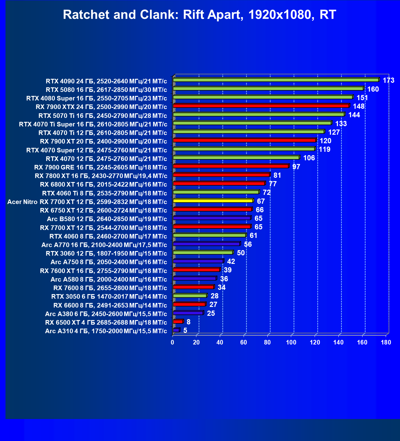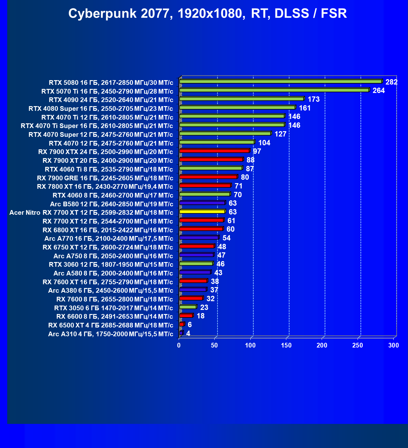 В играх с RT и FSR/XeSS ускоритель Radeon RX 7700 XT обеспечит неплохой комфорт в разрешении 1080p и приемлемый — в 1440p. Для 4K он уже не годится. В таких играх Radeon RX 7700 XT может соперничать с GeForce RTX 4060 (GeForce RTX 4060 Ti в целом быстрее из-за относительно массовой поддержки DLSS 3). Также Radeon RX 7700 XT является конкурентом для ускорителей на базе Intel Arc B580 и A770. Карта Acer имеет чуть более высокую производительность, чем референсная.