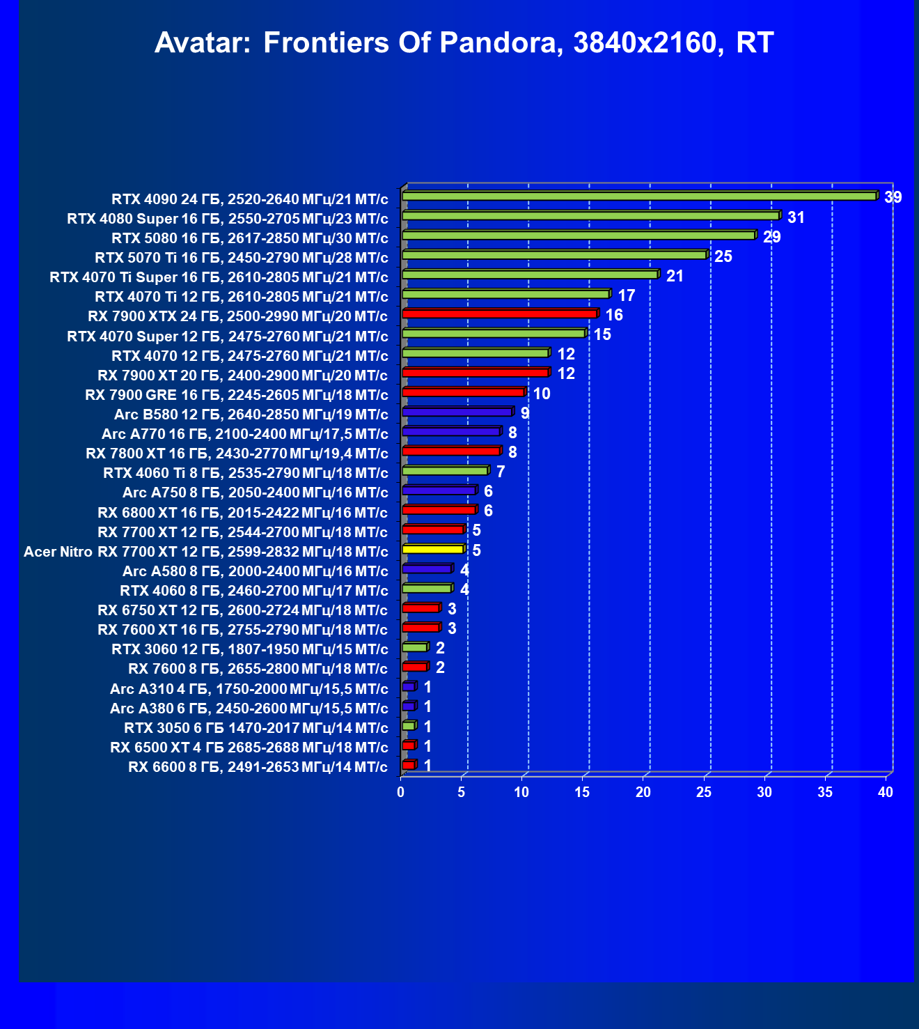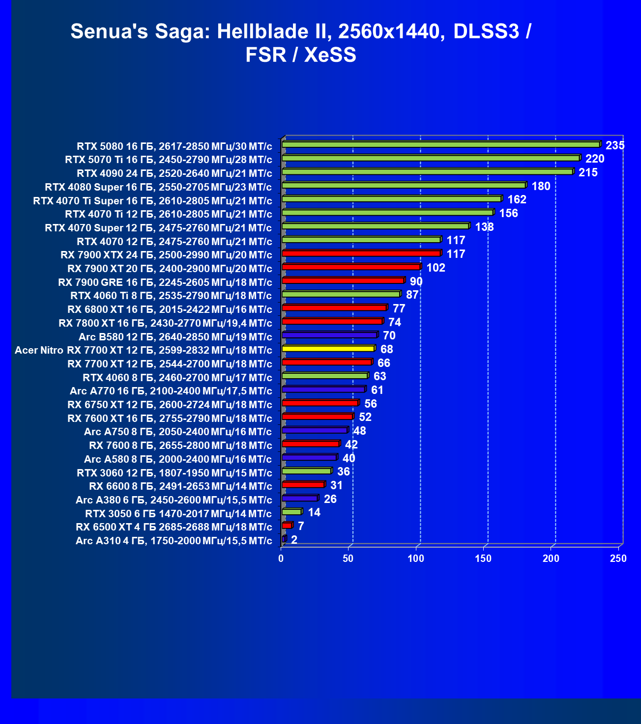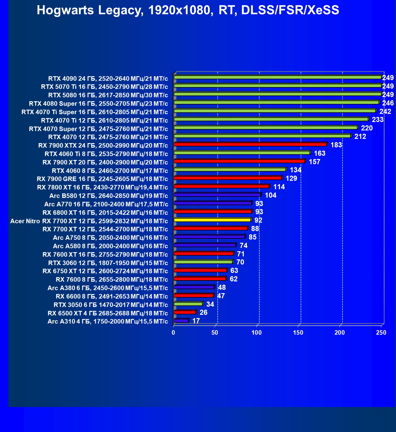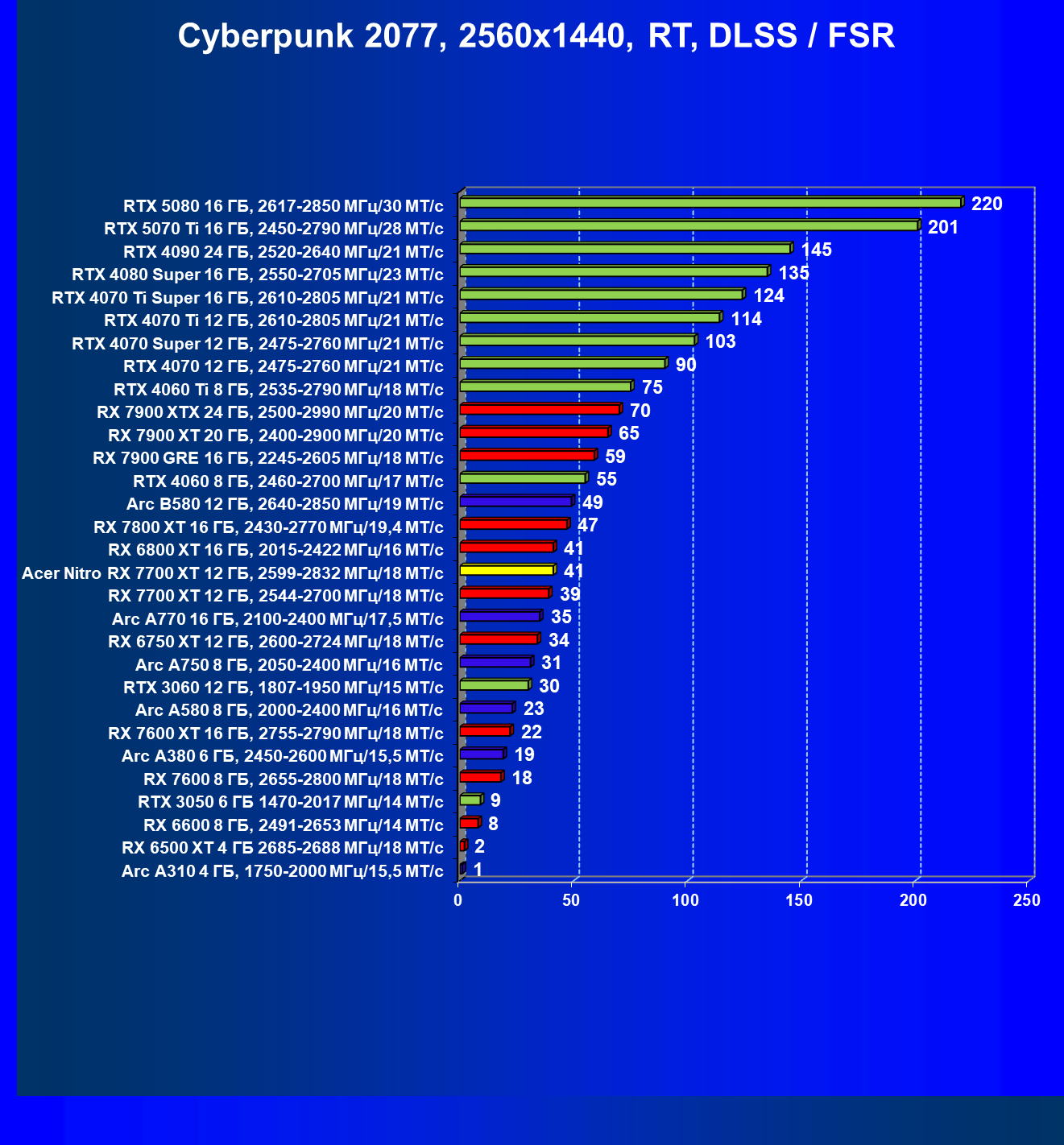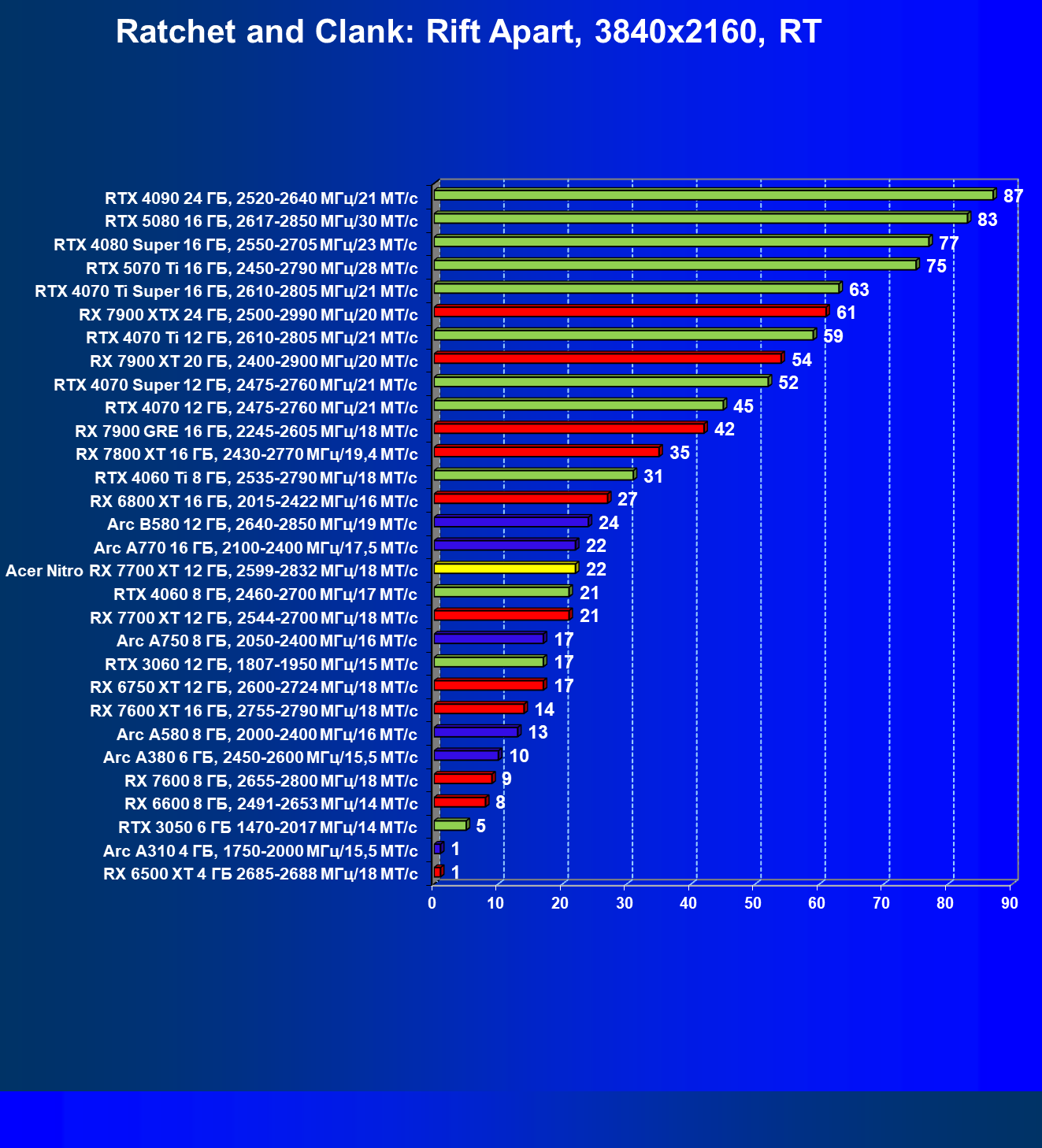 В играх с RT и FSR/XeSS ускоритель Radeon RX 7700 XT обеспечит неплохой комфорт в разрешении 1080p и приемлемый — в 1440p. Для 4K он уже не годится. В таких играх Radeon RX 7700 XT может соперничать с GeForce RTX 4060 (GeForce RTX 4060 Ti в целом быстрее из-за относительно массовой поддержки DLSS 3). Также Radeon RX 7700 XT является конкурентом для ускорителей на базе Intel Arc B580 и A770. Карта Acer имеет чуть более высокую производительность, чем референсная.