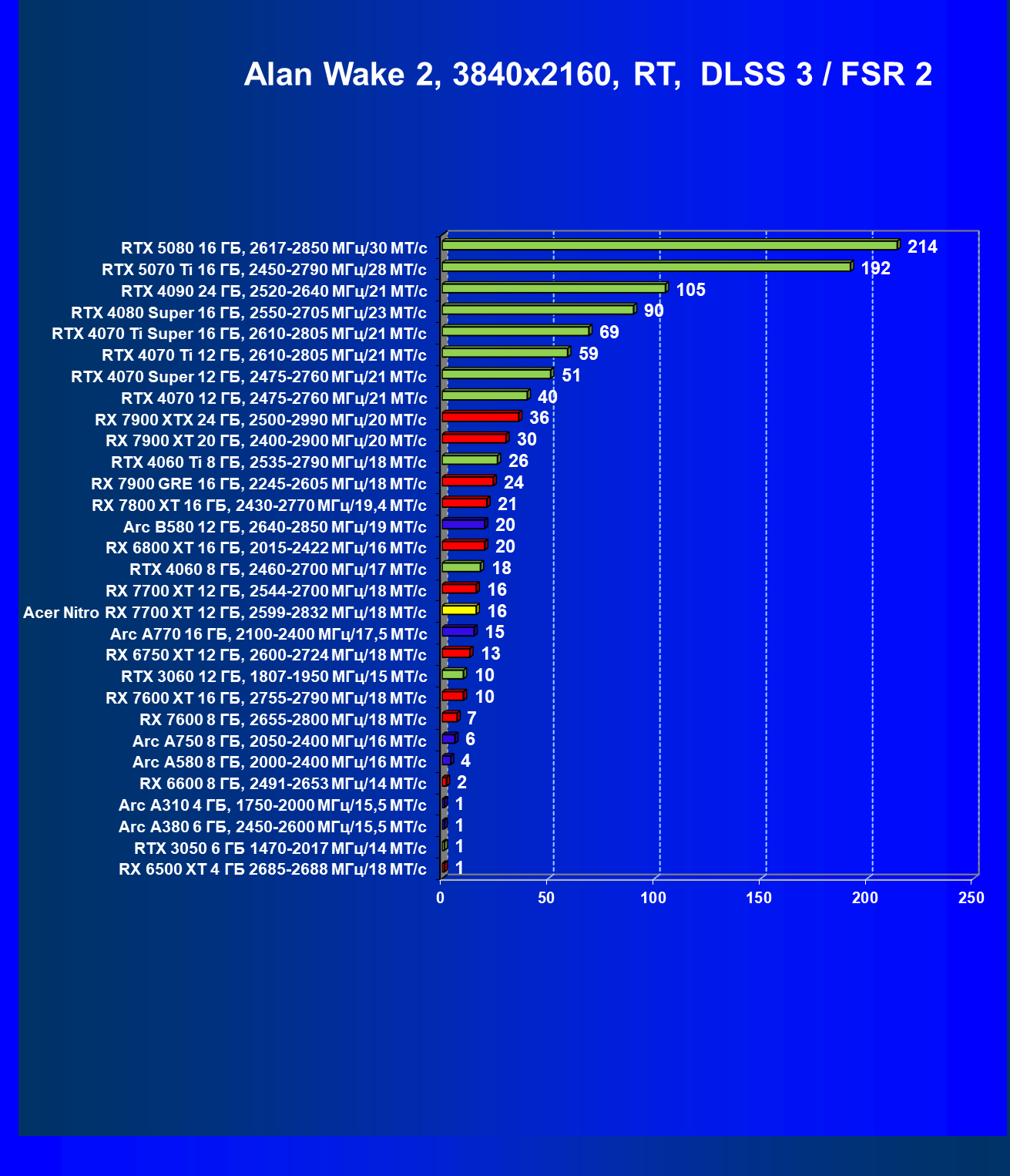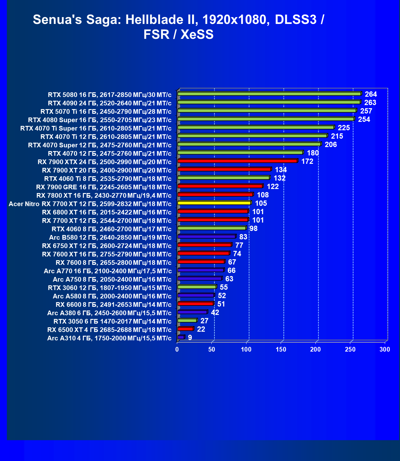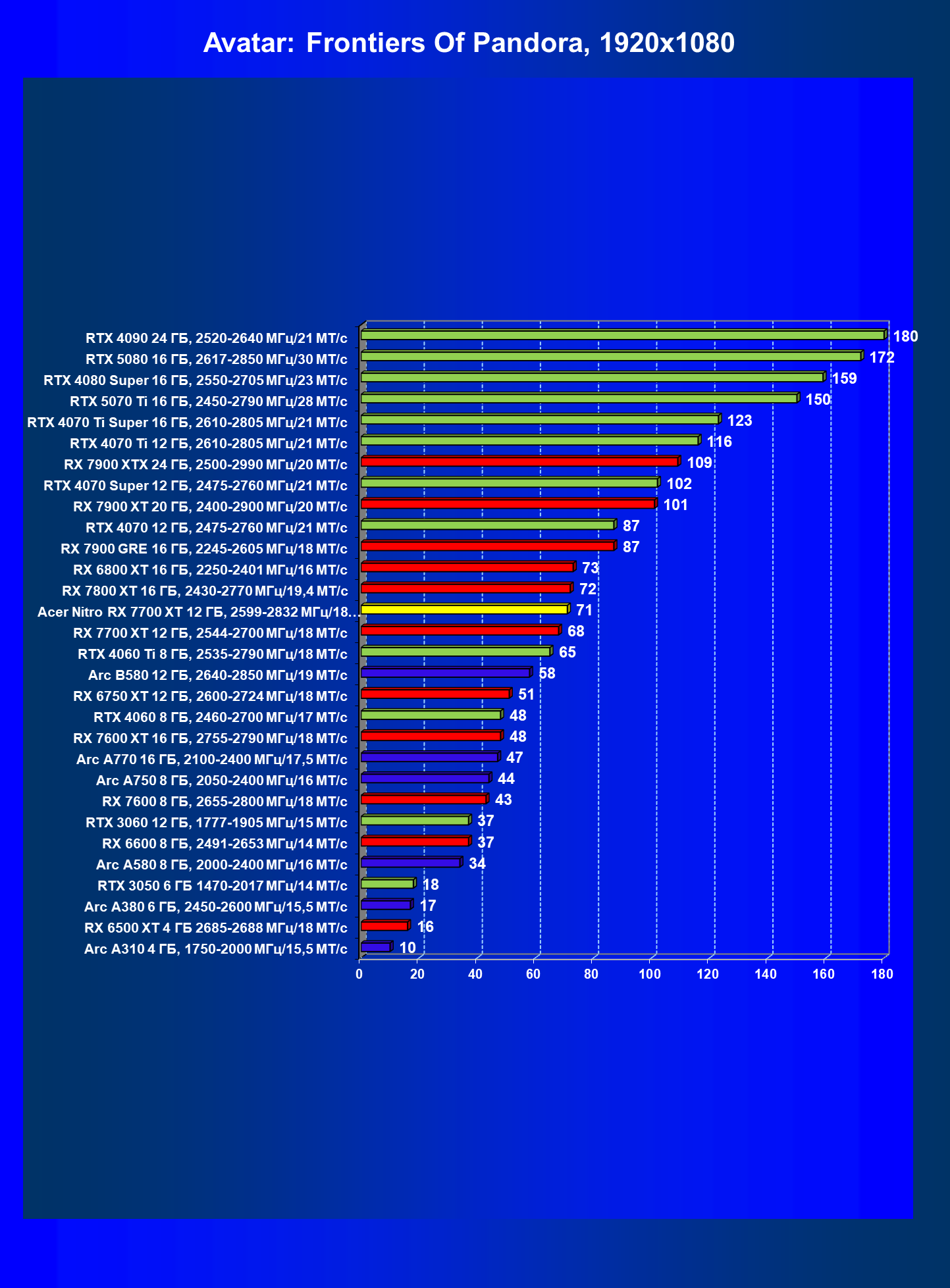 | 15 | RX 7700 XT 12 ГБ, 2544—2700 МГц/18 МТ/с | 314 | 1724 | 55 000 |