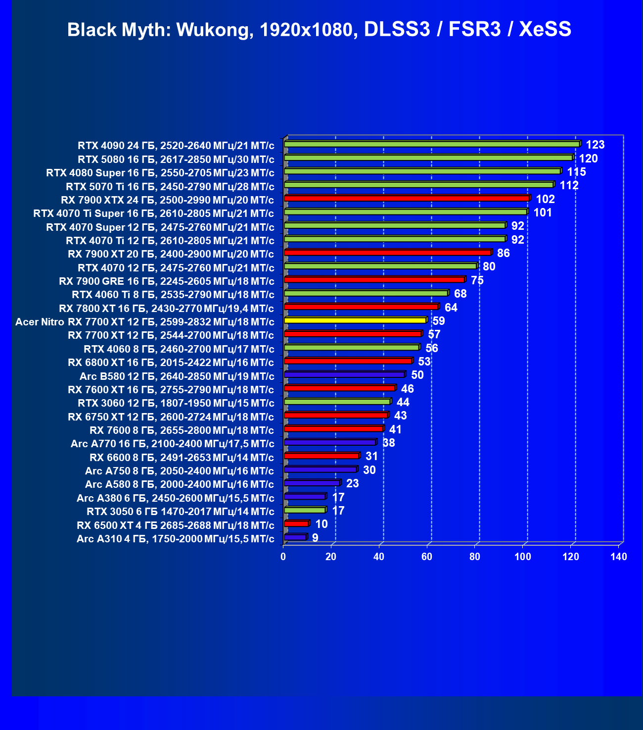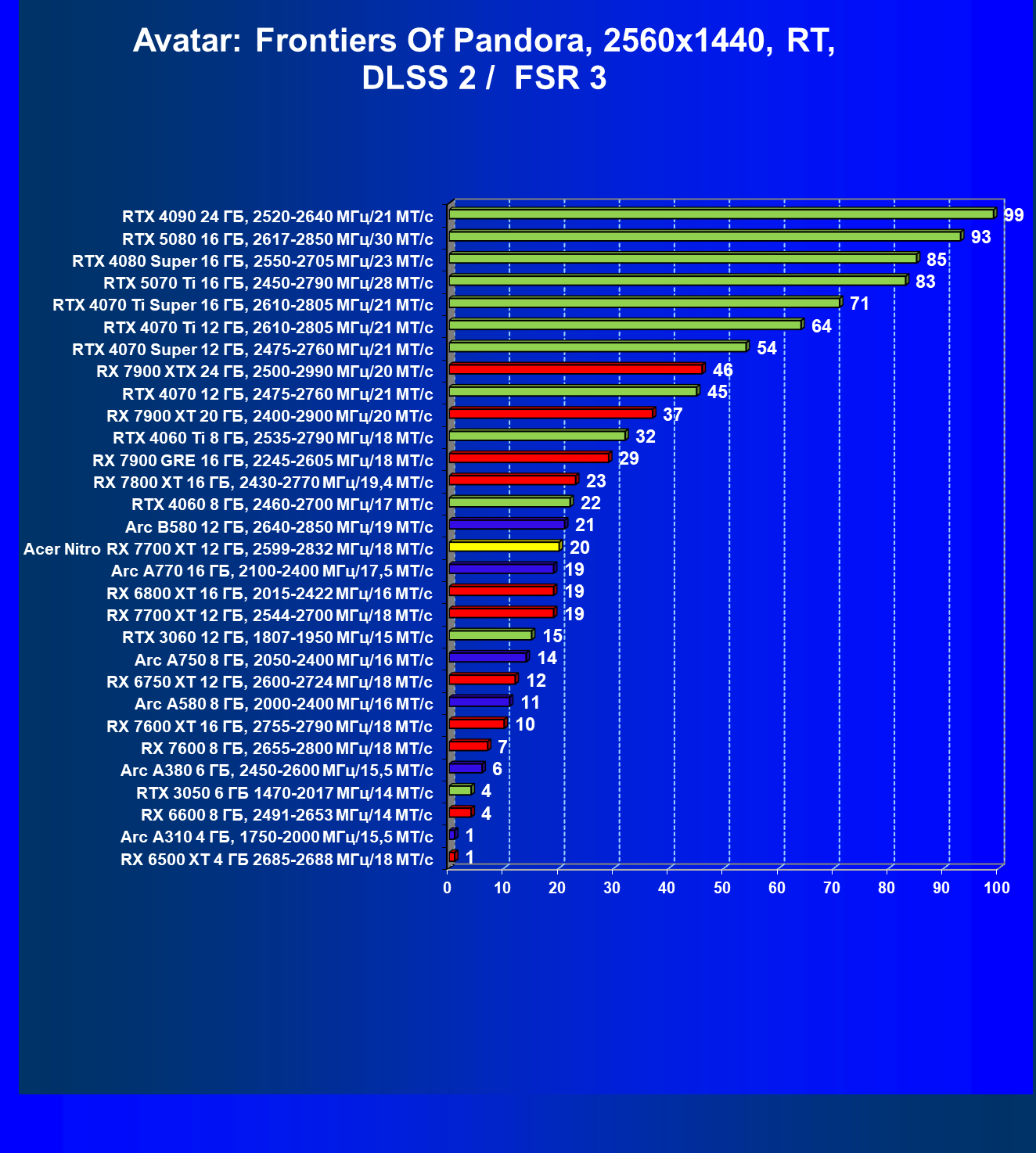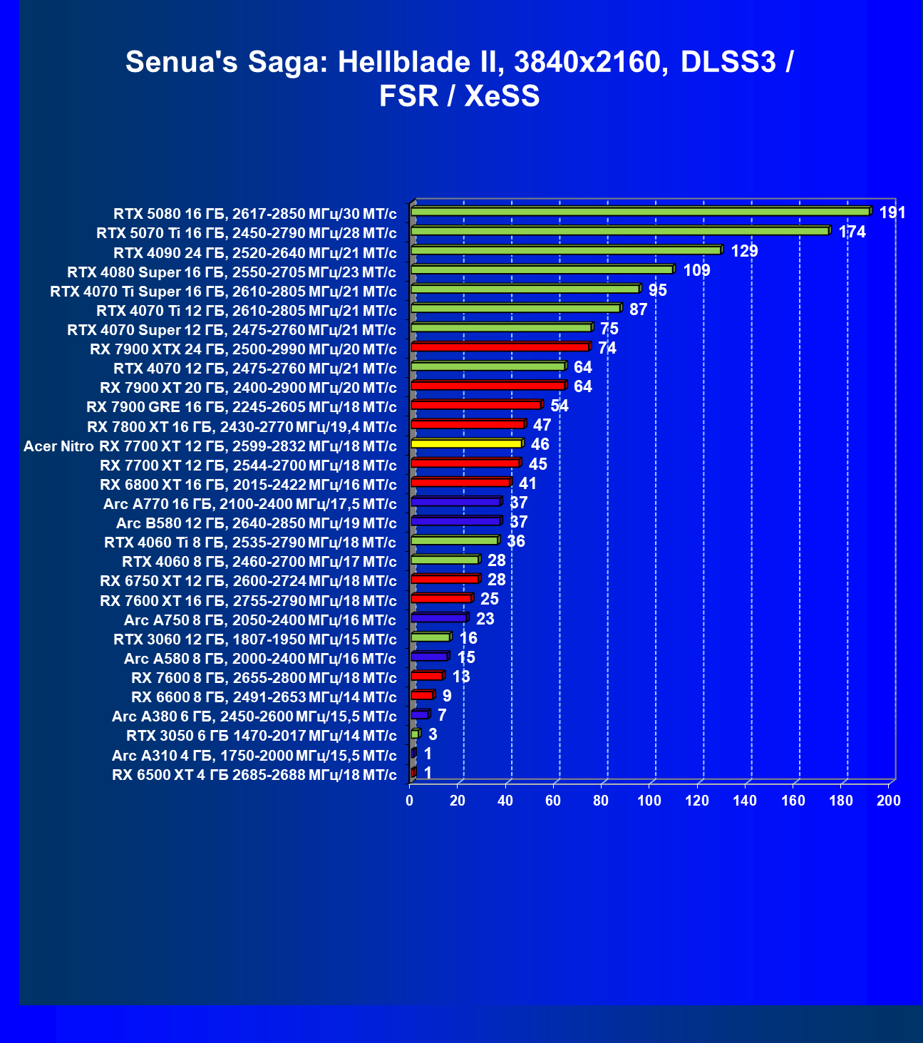 | 15 | RX 7700 XT 12 ГБ, 2544—2700 МГц/18 МТ/с | 314 | 1724 | 55 000 |