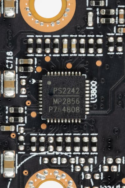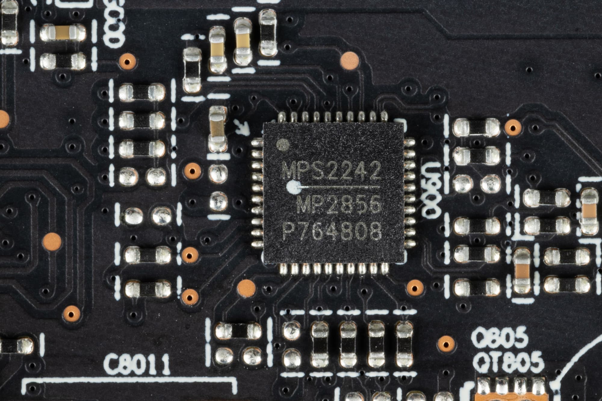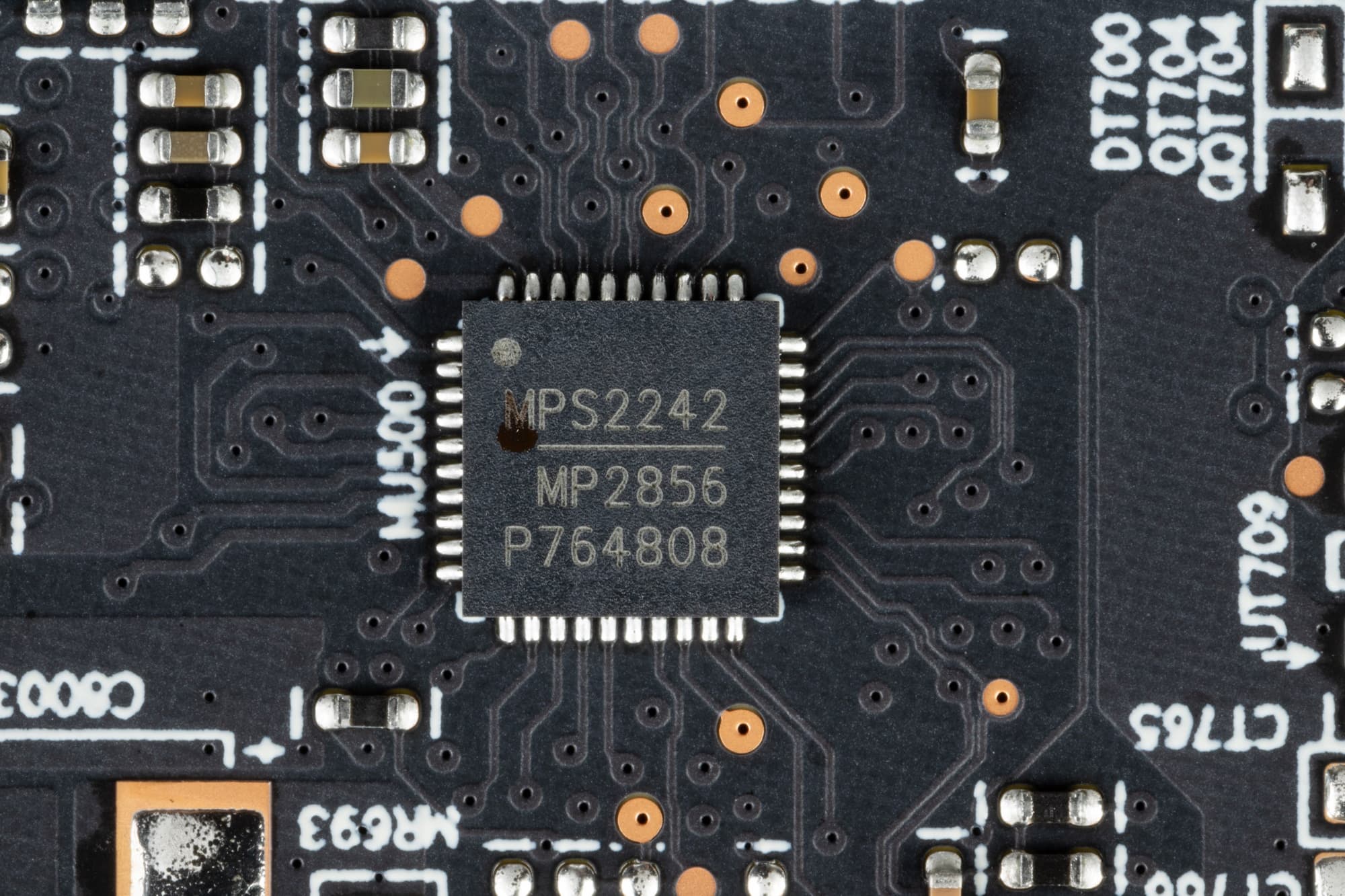10 фазами питания ядра управляет ШИМ-контроллер MP2856 (Monolith Power Systems), рассчитанный максимум на 12 фаз. Он расположен на лицевой стороне карты.