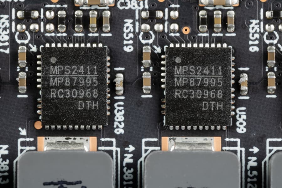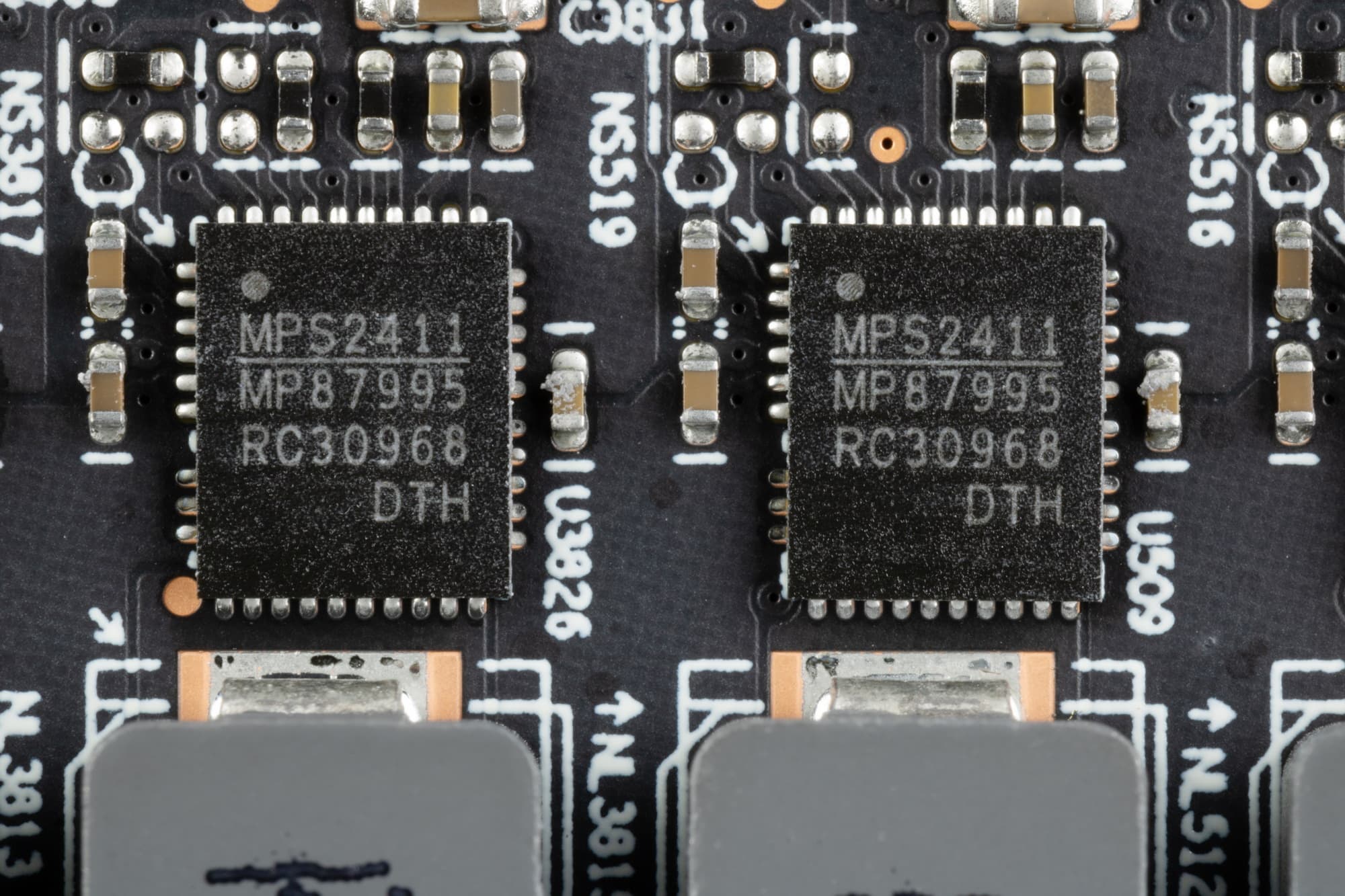 В преобразователе питания ядра используются транзисторные сборки DrMOS — в данном случае MP87995 (Monolith Power Systems), рассчитанные максимум на 50 А.