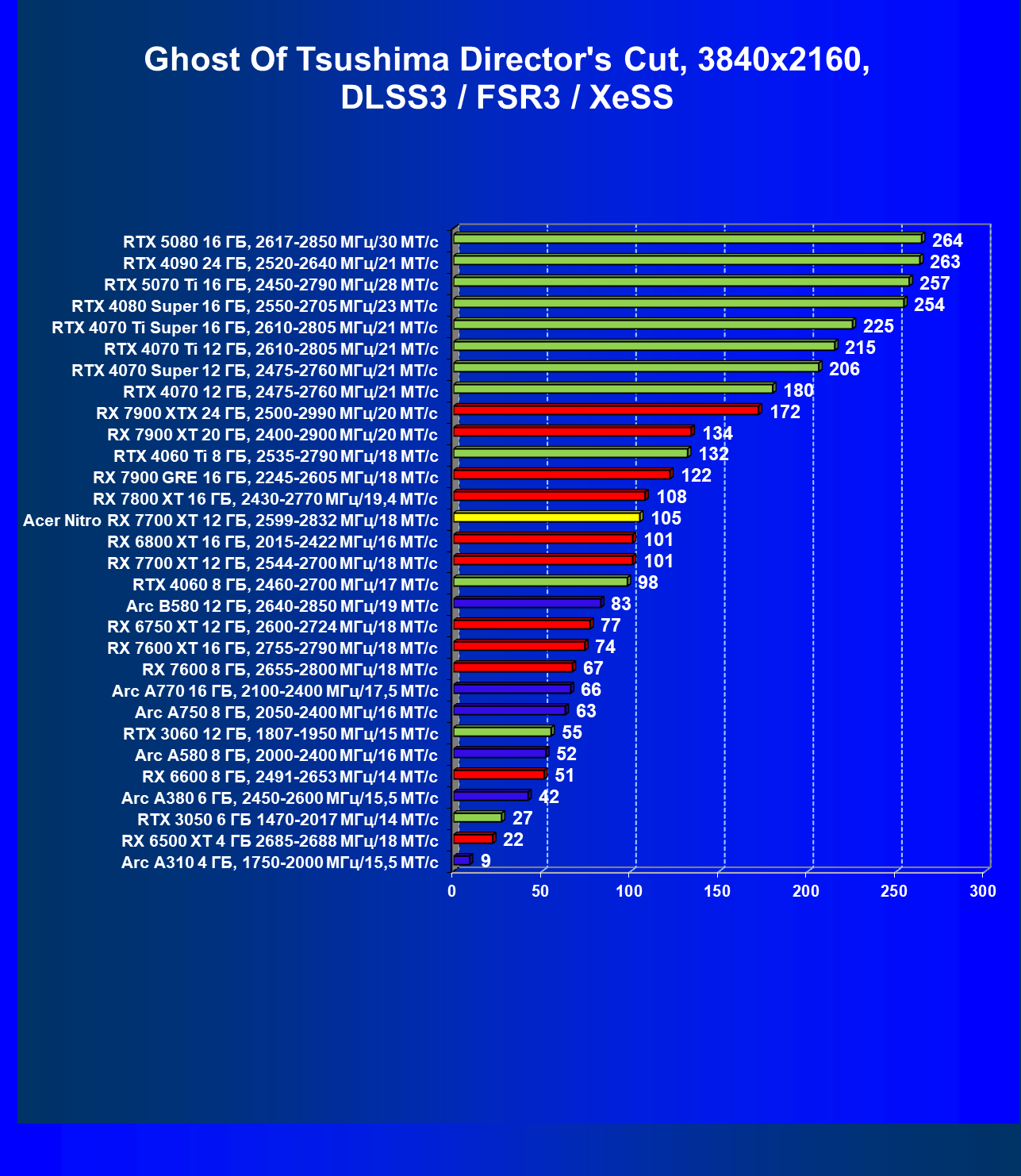 За счет более эффективных схем динамического масштабирования даже более дешевый конкурент в лице GeForce RTX 4060 Ti заметно обходит Radeon RX 7700 XT. Ситуация ожидаемая.